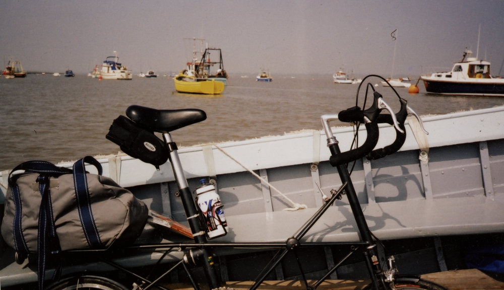 That's an Alex Moulton AM7, all at sea here. It has now had a few components robbed to keep another Moulton going and what's left is pretty worn -- I've owned it since 1983.
