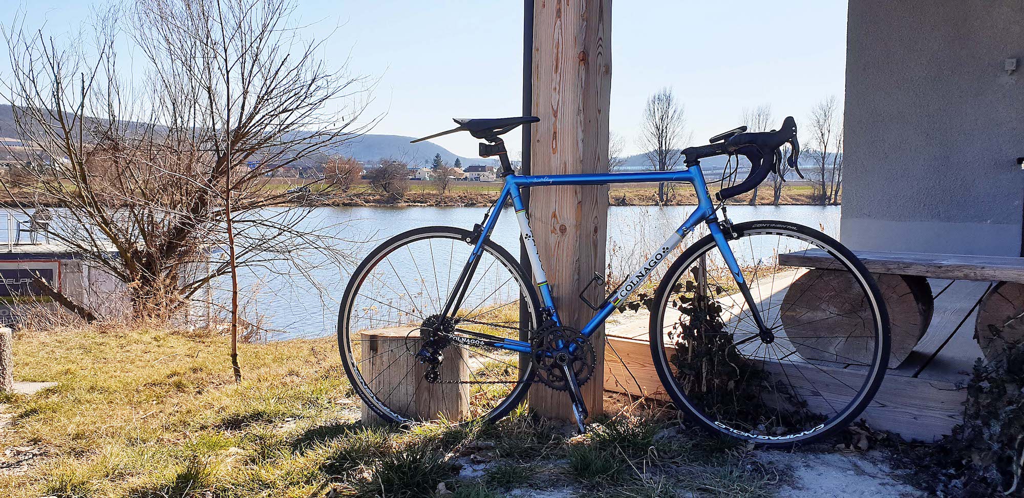 Started with a 2003 De Rosa that I had bought cheap to get some parts from. This frame is totally out of my comfort zone (I believe racing bicycles were at their best about 1971 or so...). This is both aluminium and carbon and I built it up with a Campagnolo Record 10v group set that I had on the shelf. Carbon, alu and titanium. Butt ugly most of it. But(t) light...
