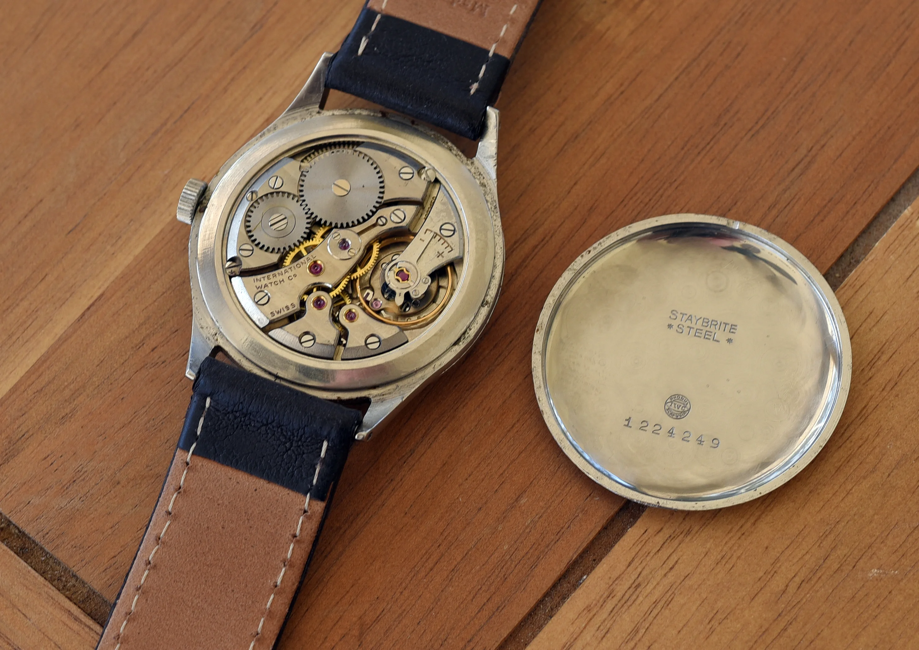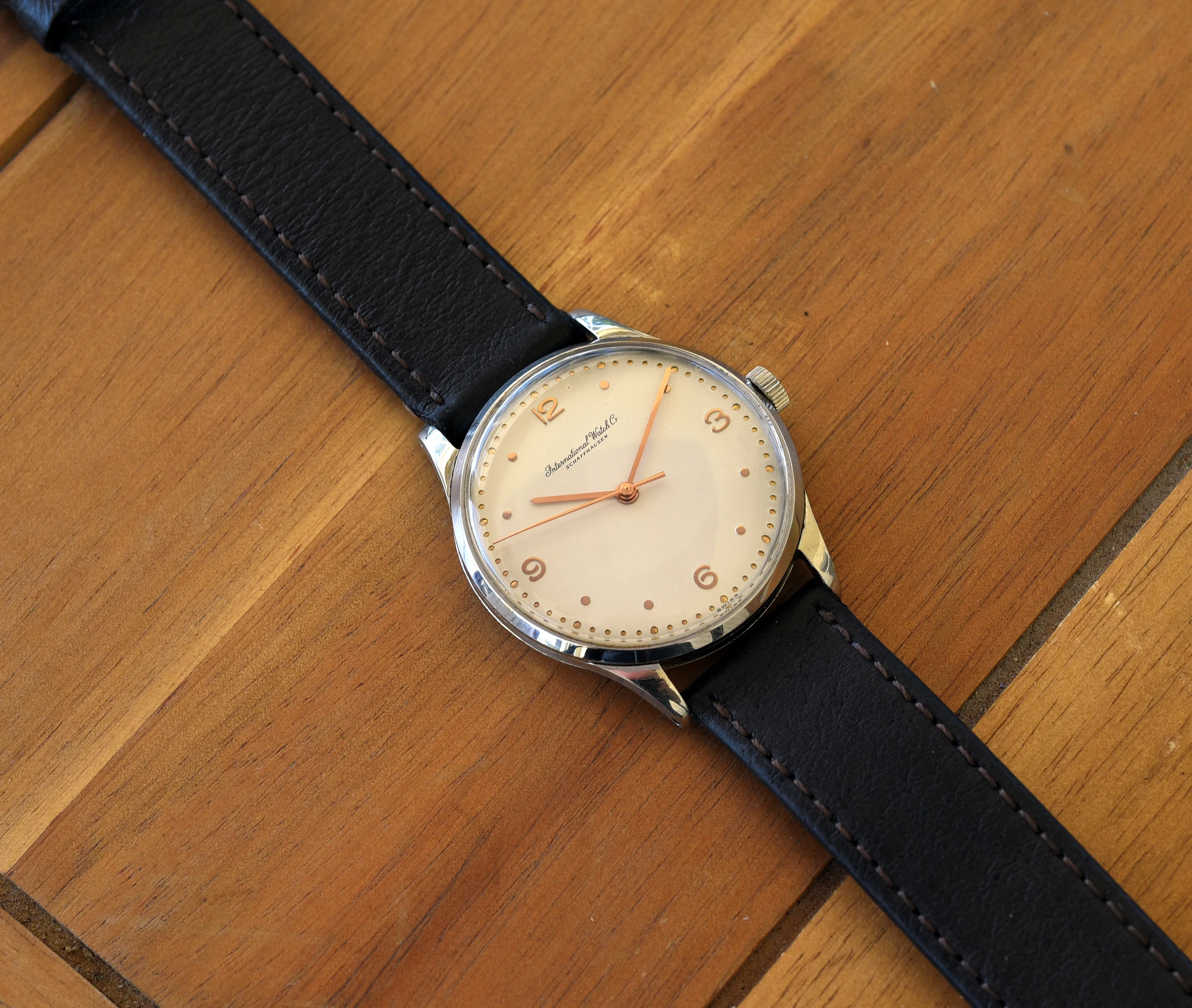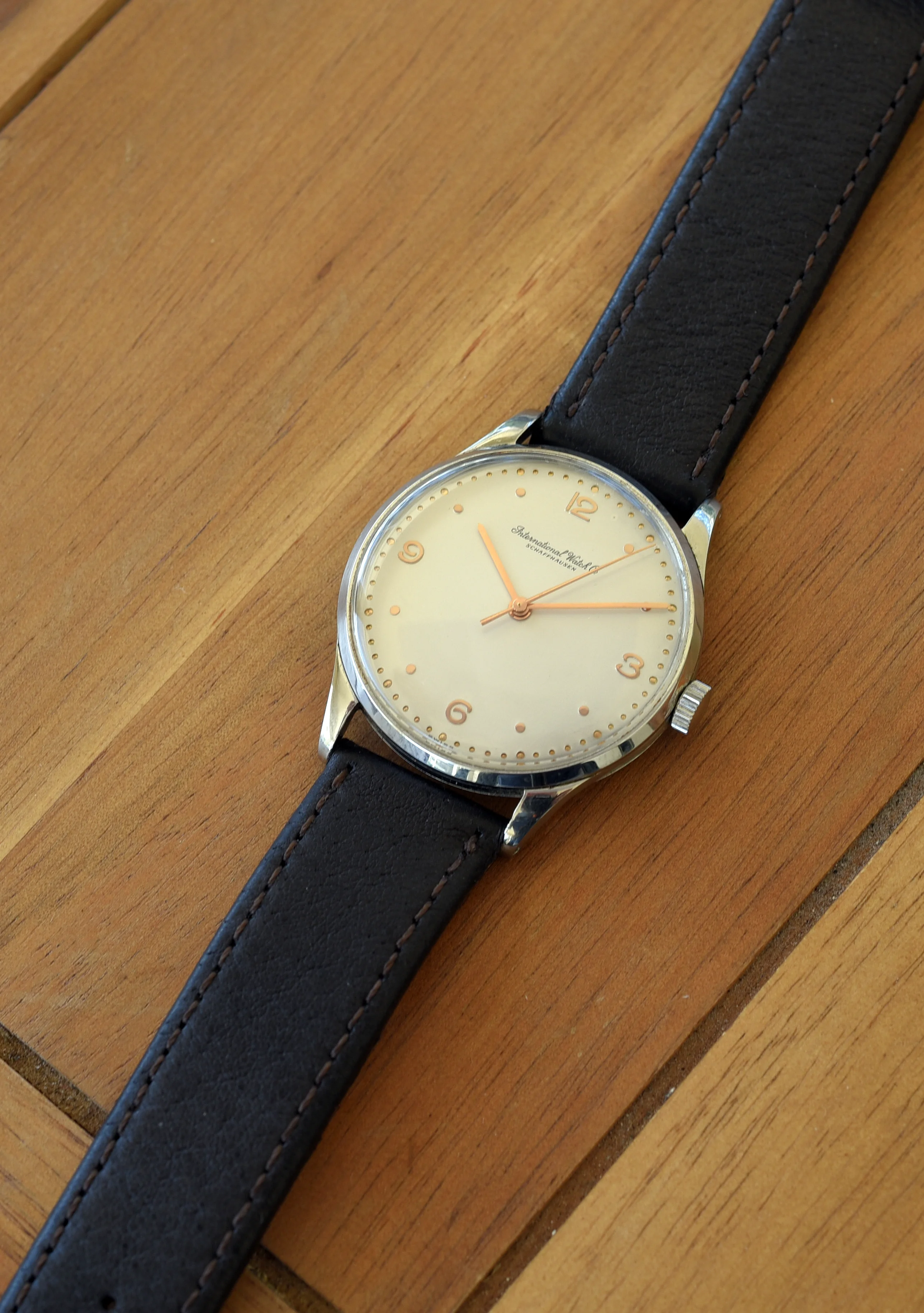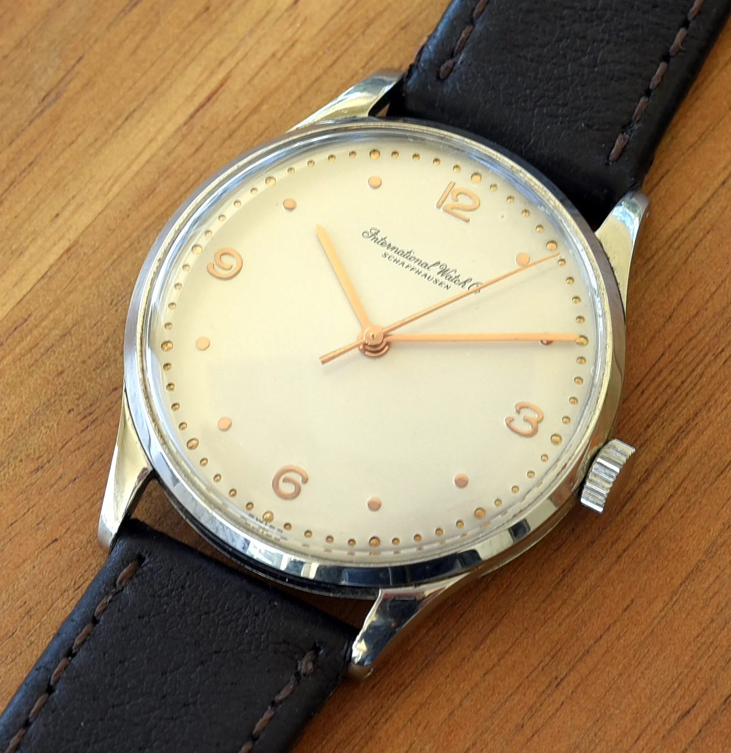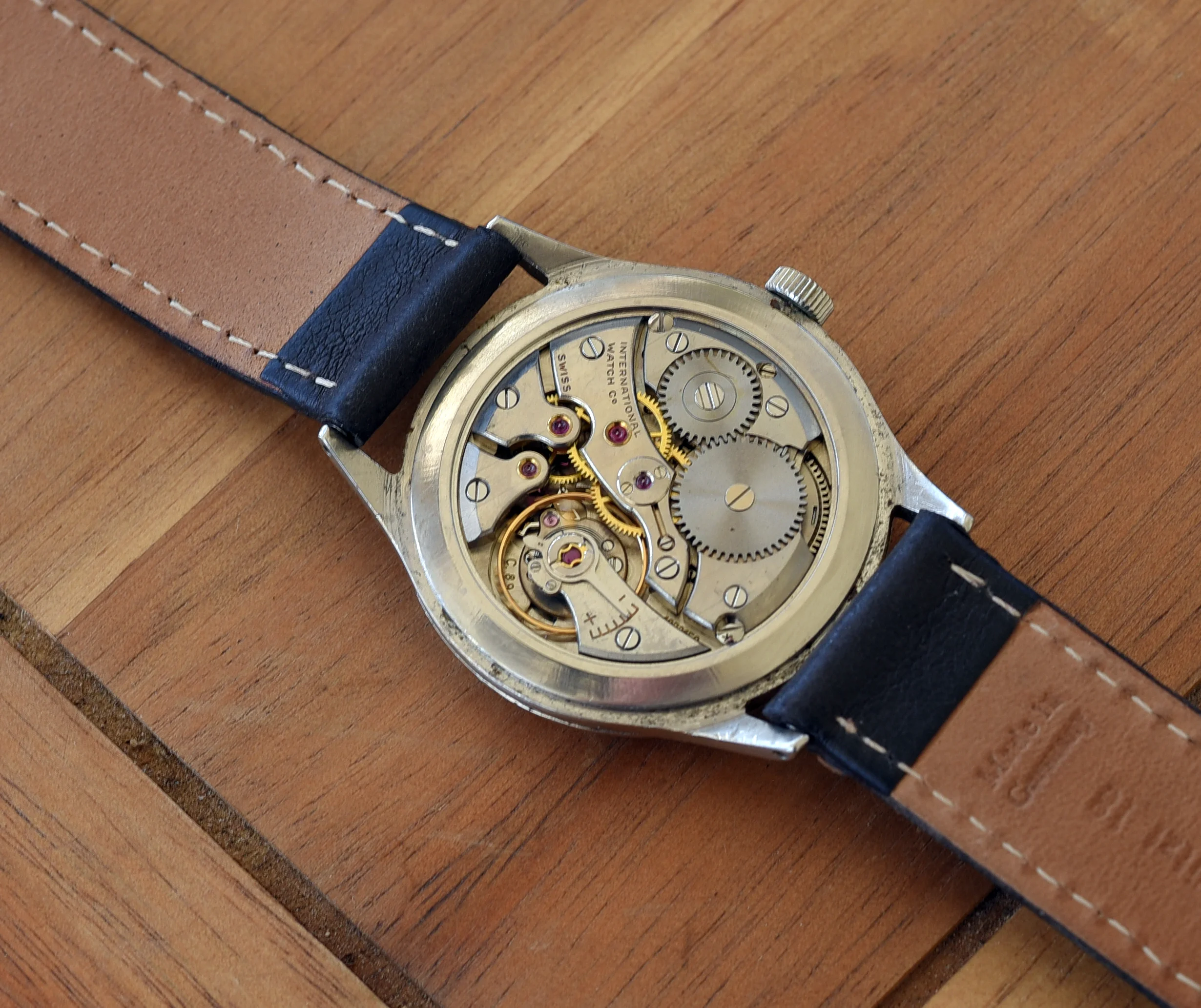 The case is 35mm (without crown) and 41mm lug to lug. The case is in good condition showing some light wear from use. The unsigned crown is original and correct for the watch. The crystal is in excellent condition showing no crazing. The off white dial with rose gold markers is original and in excellent condition, as are the hands. The movement is marked with all the correct markings including "International Watch Co", "Swiss" and C.89 (under the balance) and serial number (next to the balance cock. The watch is in working order and keeping good time, but I do not know the service history.
