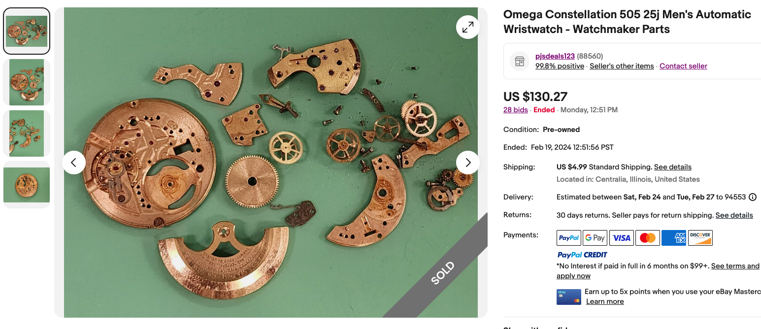 I then saw a listing for a 505 movement. With the low starting bid of 99 cents USD. I knew I had a bunch of 500 and 550 parts. Most of the quick and dirty research showed the 135/6.033 taking a 565 movement. This is the date version. So I thought perhaps a 505 might be a no date base caliber. I was thinking the 6 meant date. (I mixed up the case reference and the caliber.)