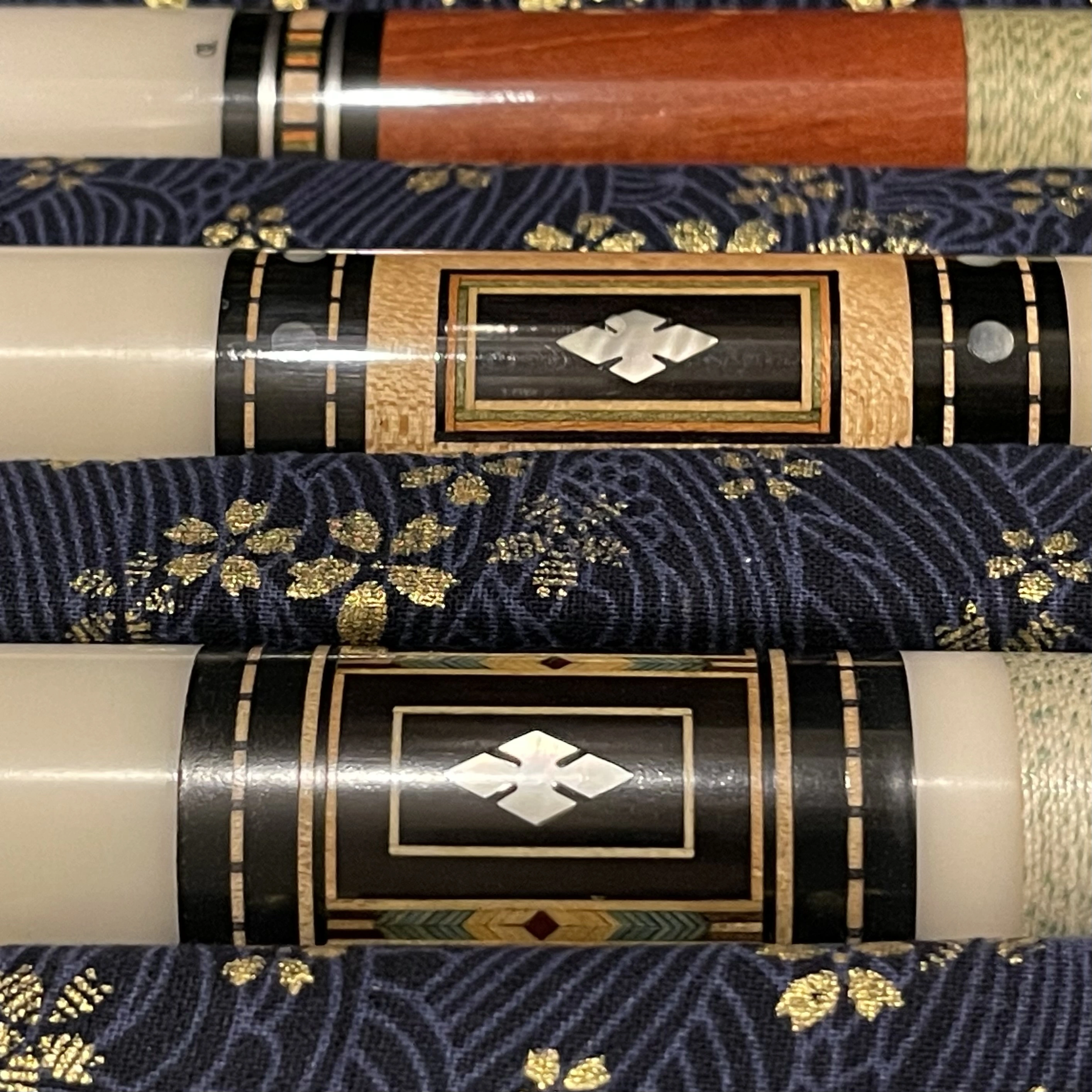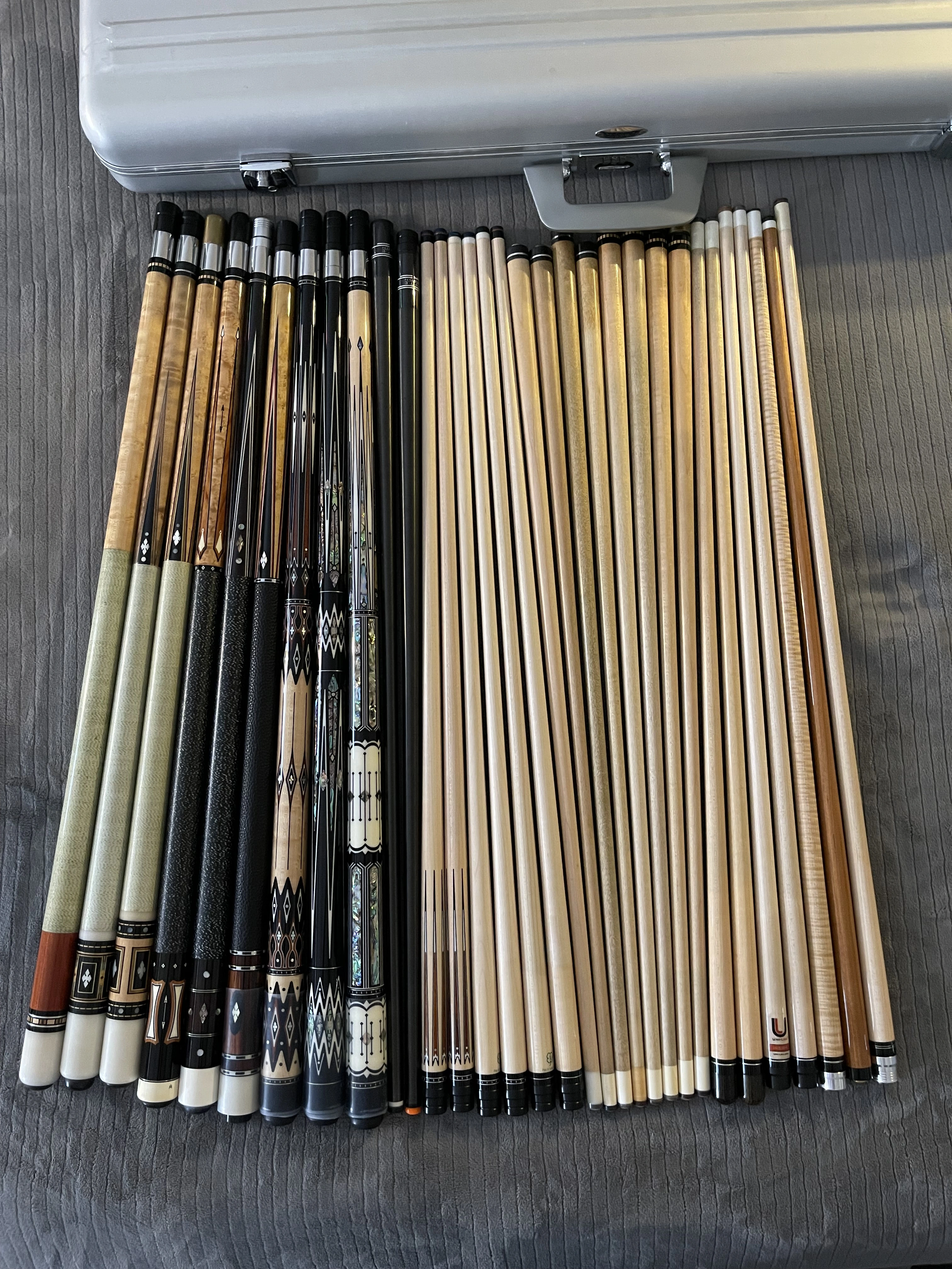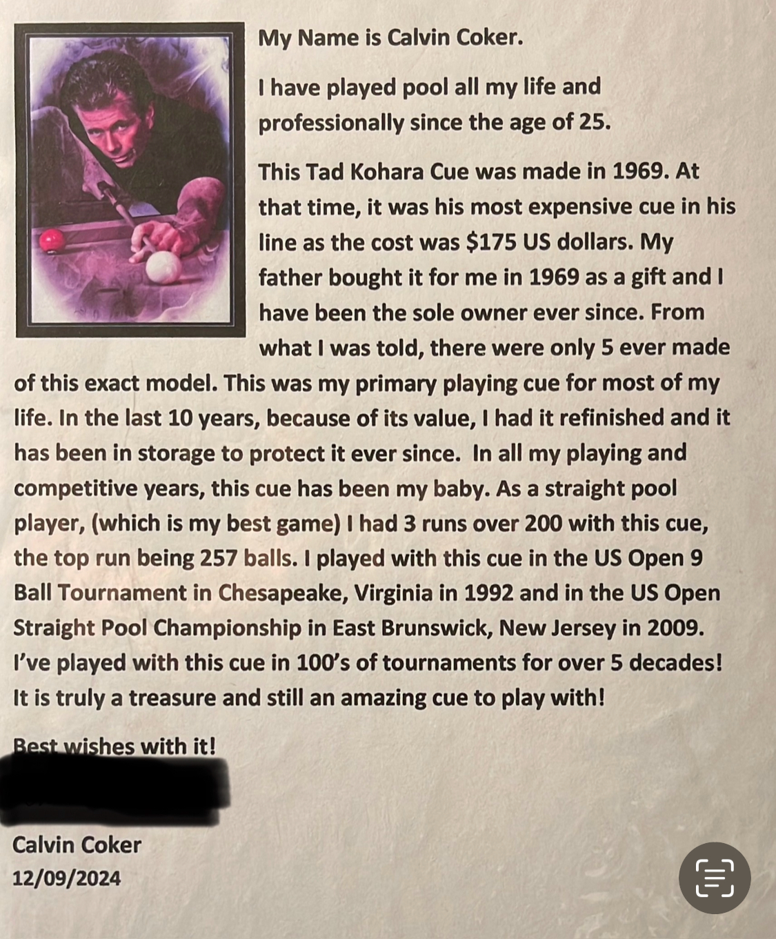 ·I have three Tad Kohara's starting from 1960's. Many would consider them legendary especially the no serial number pair. I have an early Bill McDaniel who took advice from George Balabuska and built cue together with Tim Scruggs. And one cue that has been in 5 decades and hundreds of national tournaments like the US Open. Calvin Coker is currently ranked 9tg on Fargo Rate for the USA. He beat world champion Jasmin Ouschan, World Games 2005 Gold Medalist, with the Tad now in my care.