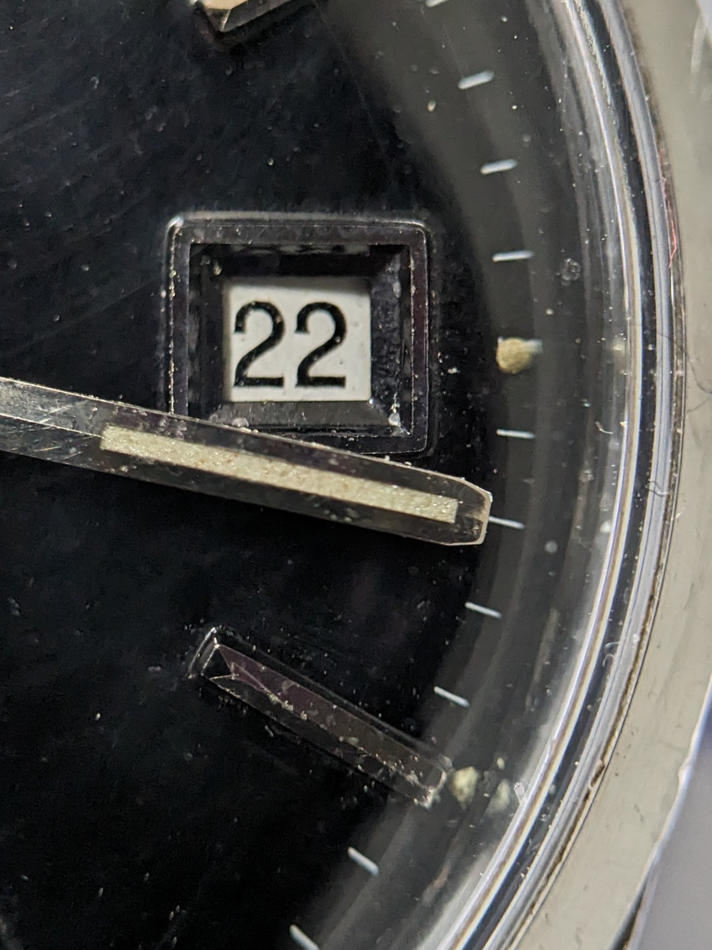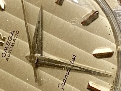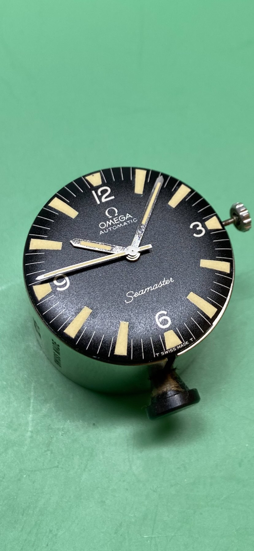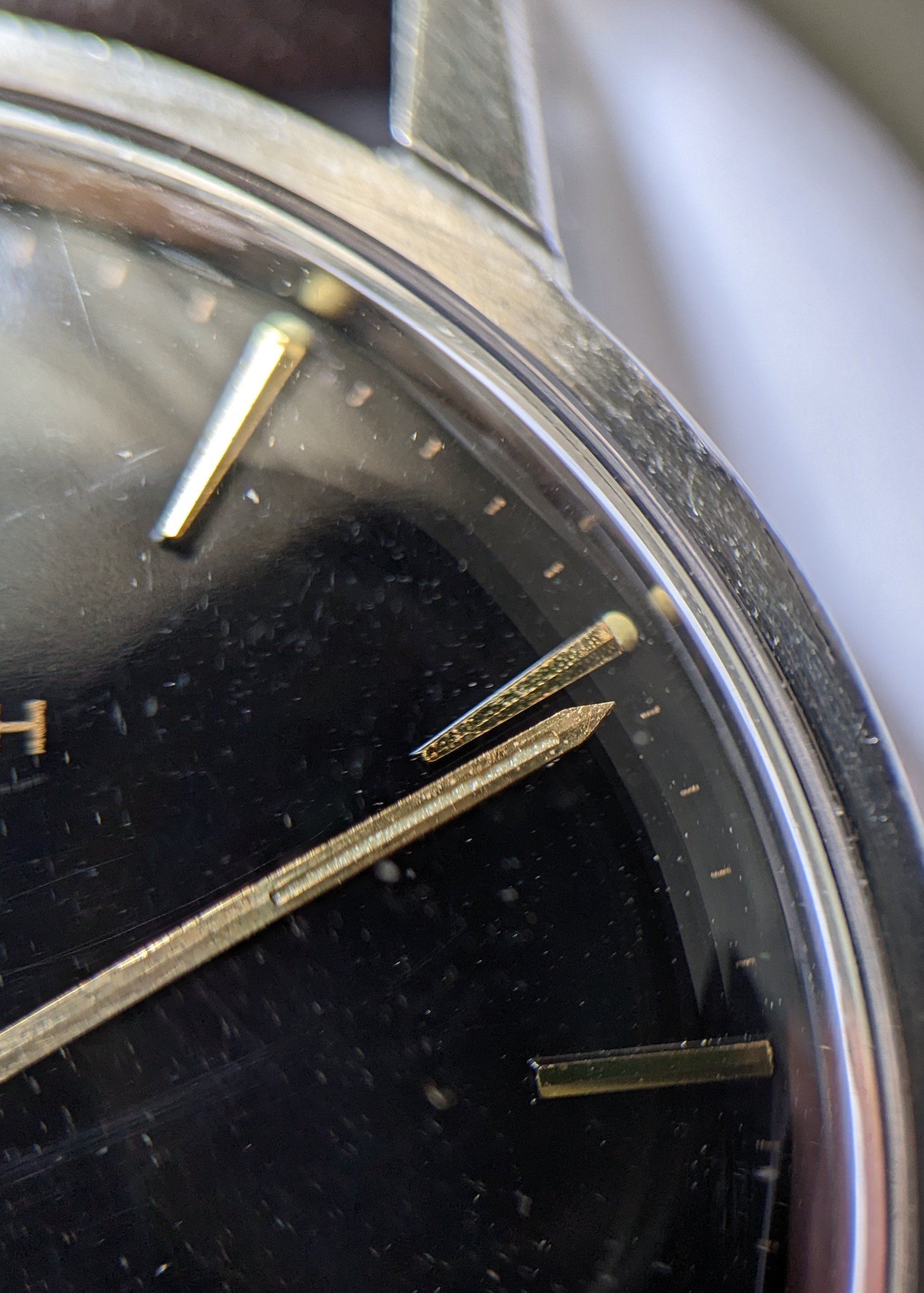 Before. The handset was in bad shape. There was no tritium left on the minute hand, but the original lume blibs on the dial were intact with a lovely old-tritium hue.