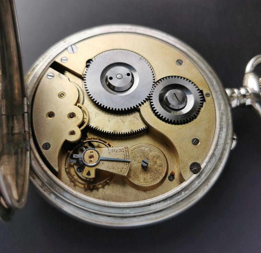 I offer the following to expand the answer. This is an early Omega 30’’’ 8-day (Reference 9247). There were changes to later versions. The 30’’’ was cased in a ‘UK’ version (Reference 6818) with circular bow, cylindrical stem and spherical crown - the ‘Continental’ Reference 9247 had an oval bow, different (more attractive?) stem and oval crown and had either a gilded movement (as here) for the European market or movement that was silvered or nickel plated (both versions existed) for the US market (and that movement was marked ‘SWISS’). There was also a (slightly smaller) Omega 27’’’8-day. Of each version, thousands were made.