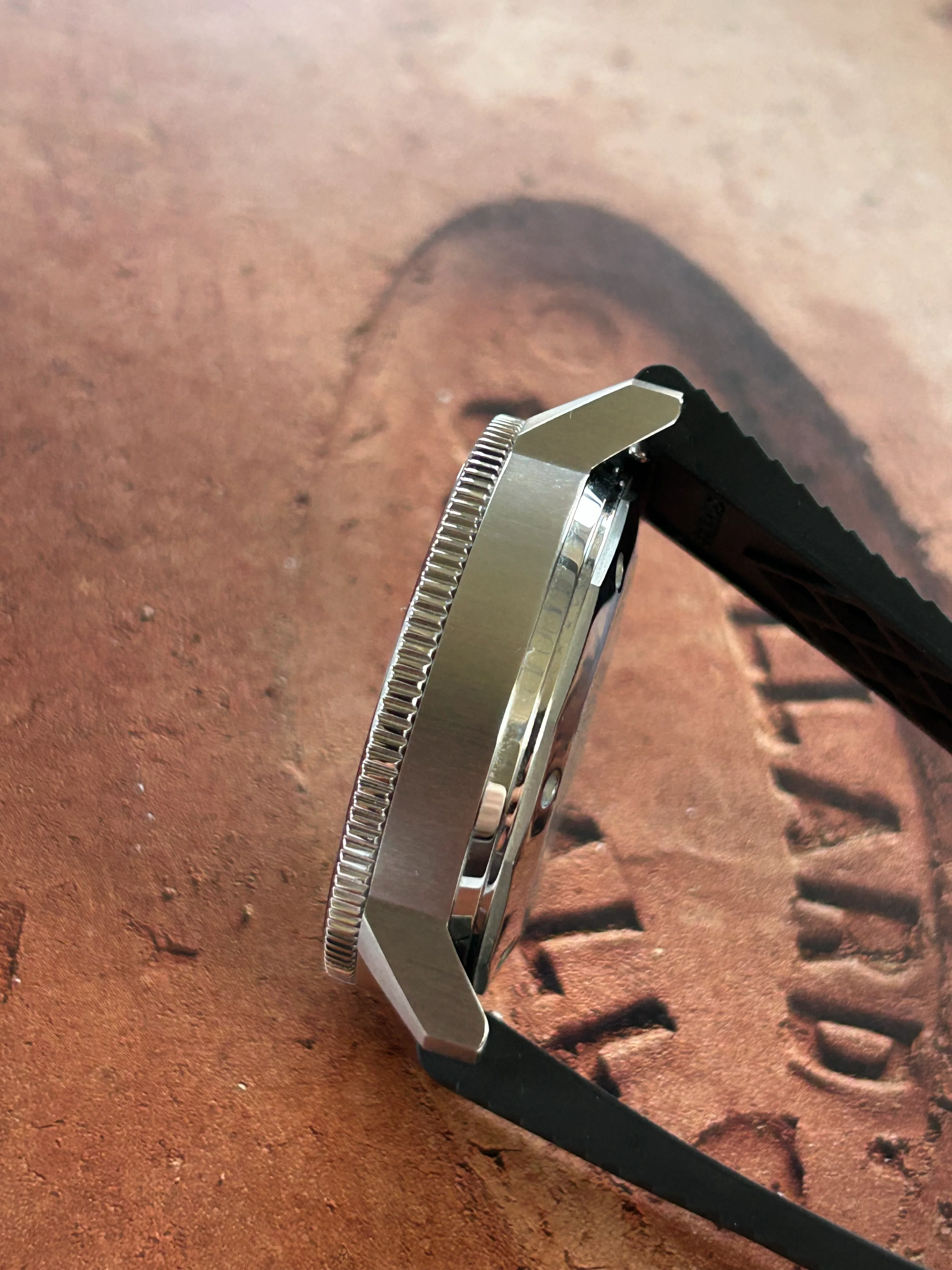 120-click unidirectional stainless steel dive bezel with black ceramic insert