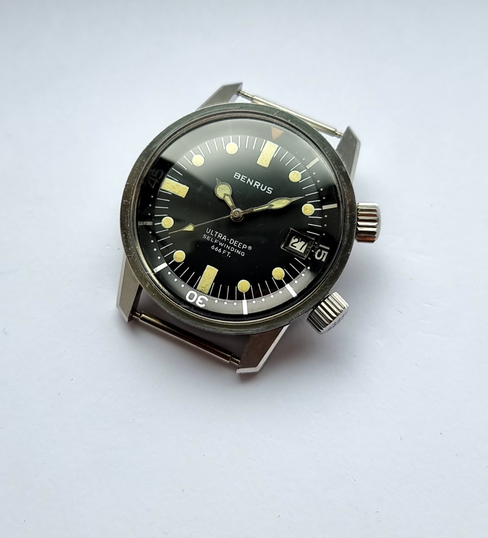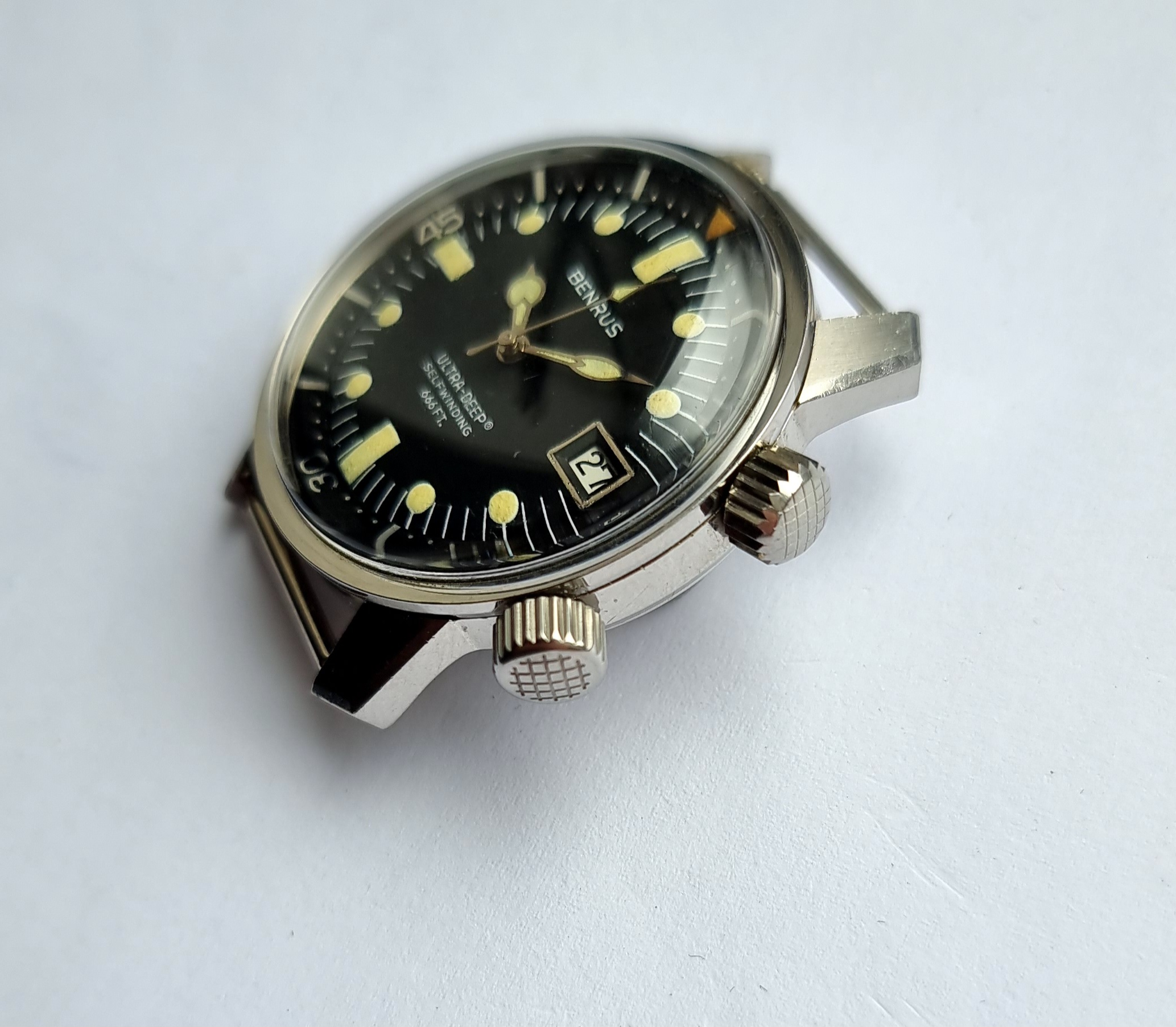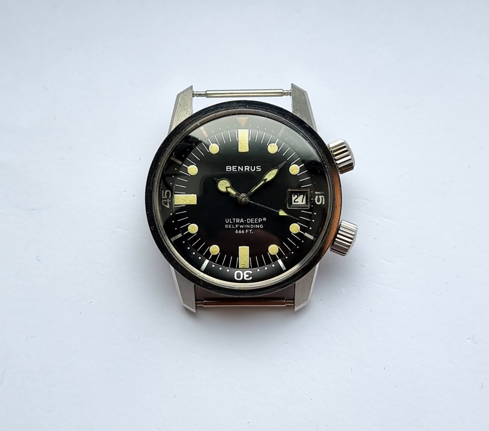 Made in the U.S.A by Benrus, this is the twin crown ref. 6089, and was produced in the late 1960s. It was a serious bit of kit and was sold to be used. The 36mm case is a super compressor and designed by EPSA. It was given the name 'Ultra Deep' with a depth rating of 666 feet. 2 oversized cross hatched crowns are present, but the crown at 4 appears to be aftermarket (it is still cross hatched, but is not factory original).The crown at 2 sets the internal bezel, crown at 4 sets the time.