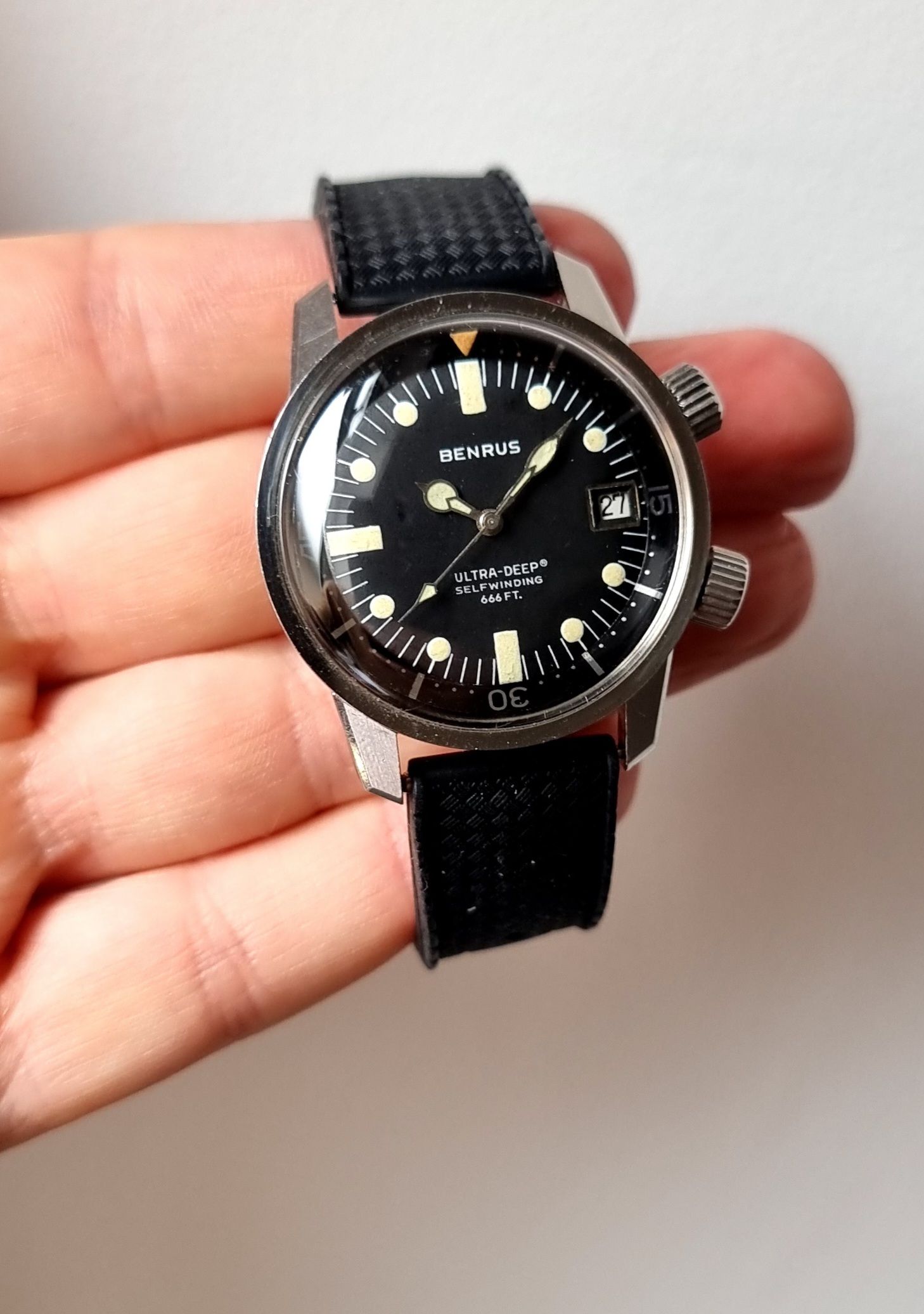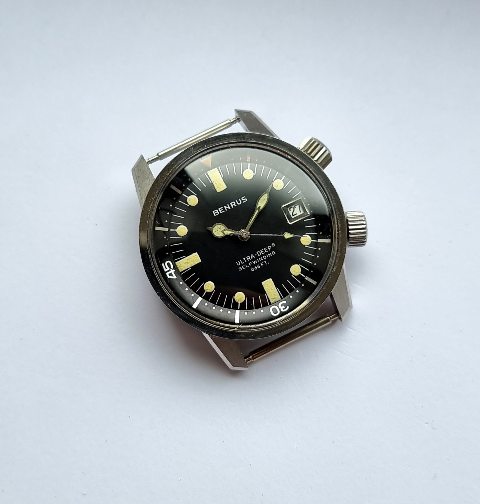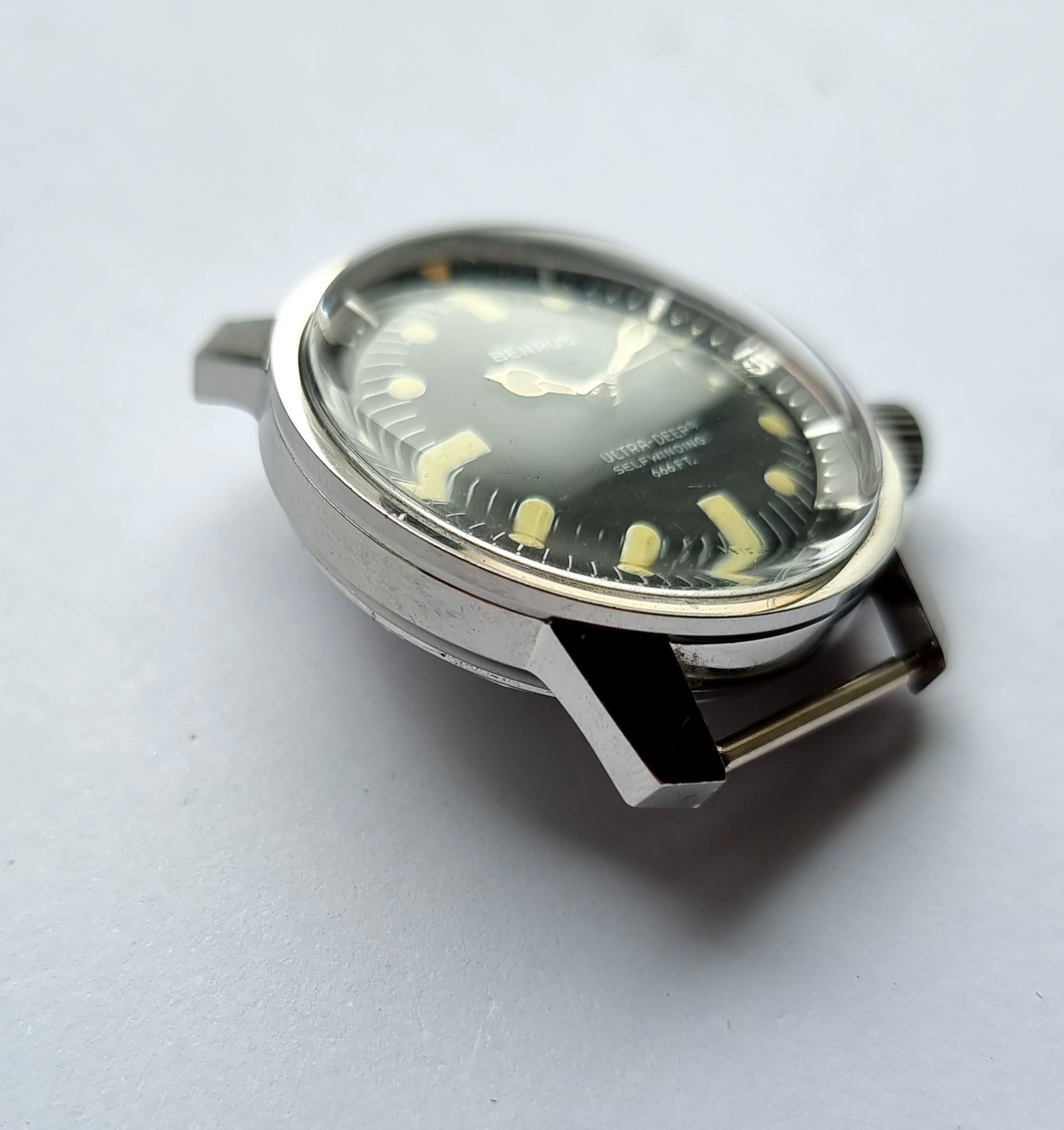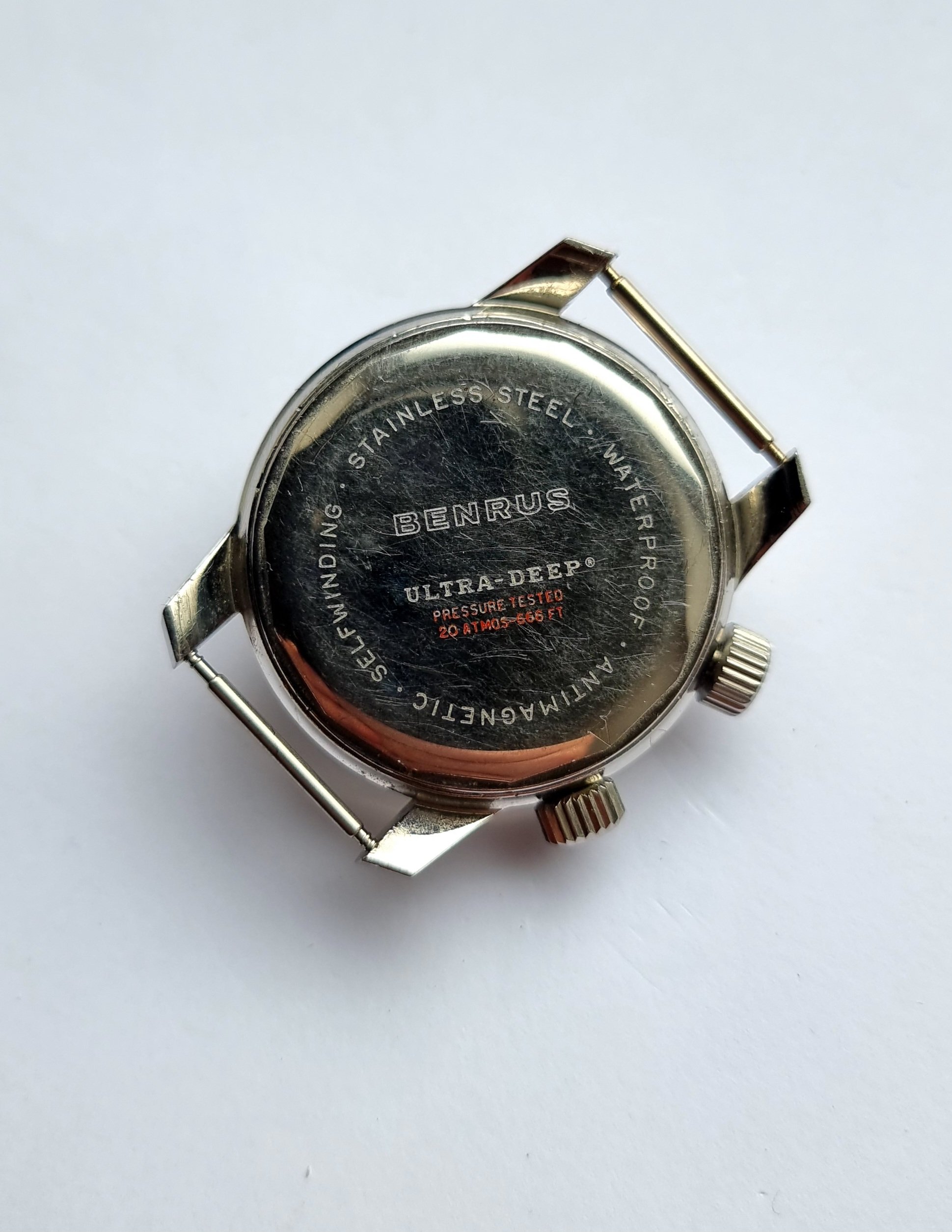 Made in the U.S.A by Benrus, this is the twin crown ref. 6089, and was produced in the late 1960s. It was a serious bit of kit and was sold to be used. The 36mm case is a super compressor and designed by EPSA. It was given the name 'Ultra Deep' with a depth rating of 666 feet. 2 oversized cross hatched crowns are present, but the crown at 4 appears to be aftermarket (it is still cross hatched, but is not factory original).The crown at 2 sets the internal bezel, crown at 4 sets the time.
