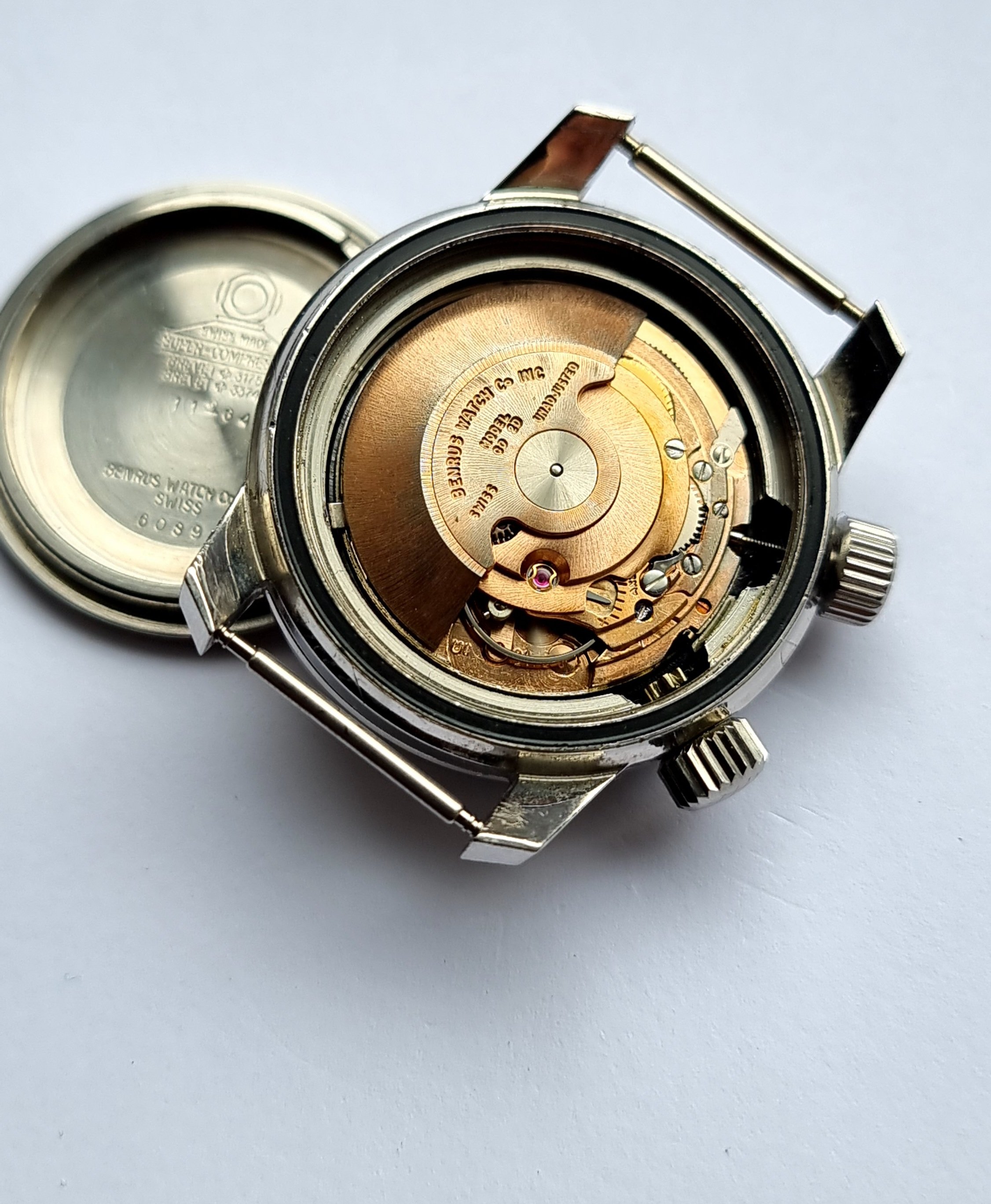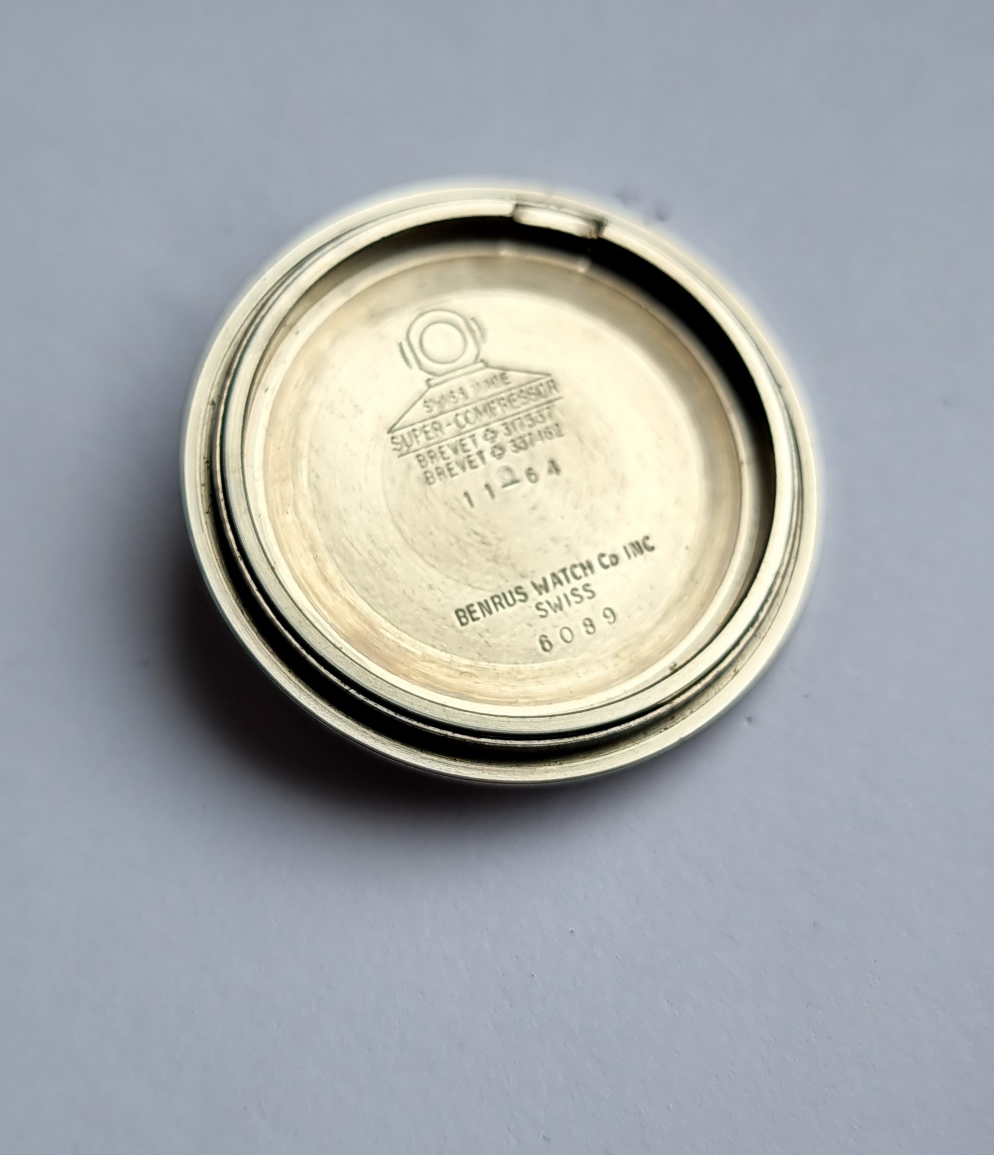 Super Compressor: As atmospheric pressure increases, the case back is compressed on the gaskets creating a tighter seal (Note; watch has not been pressure tested, so do not assume rating is still current). This was a major selling point back in the 1960s and Super-Compressor watches stand tall as some of the most coveted dive watches today. The case back is in great shape with clearly legible text and engravings. As you can see, even some of the original paint remains, indicating this piece has been worn sparingly.