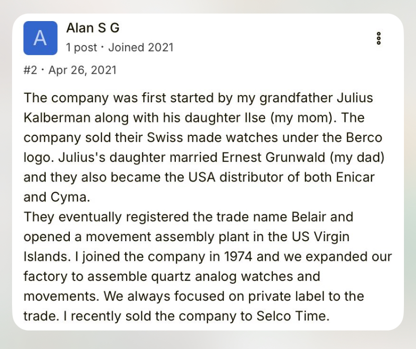 Likely a house brand name for a retailer, added to the dial of a typical generic Swiss watch of the era. Not made by a watch manufacturer by the name of Berco. All components off the shelf.