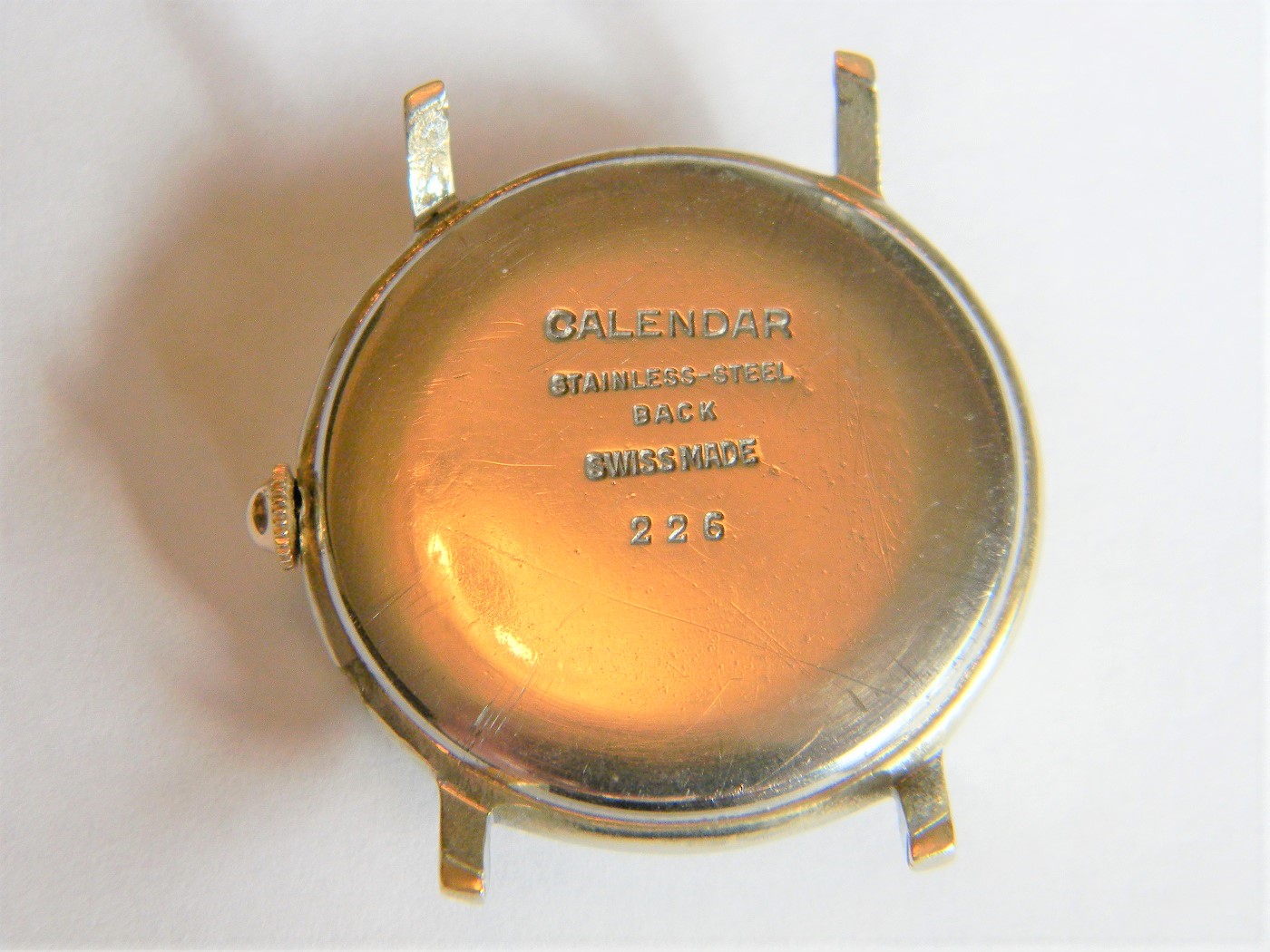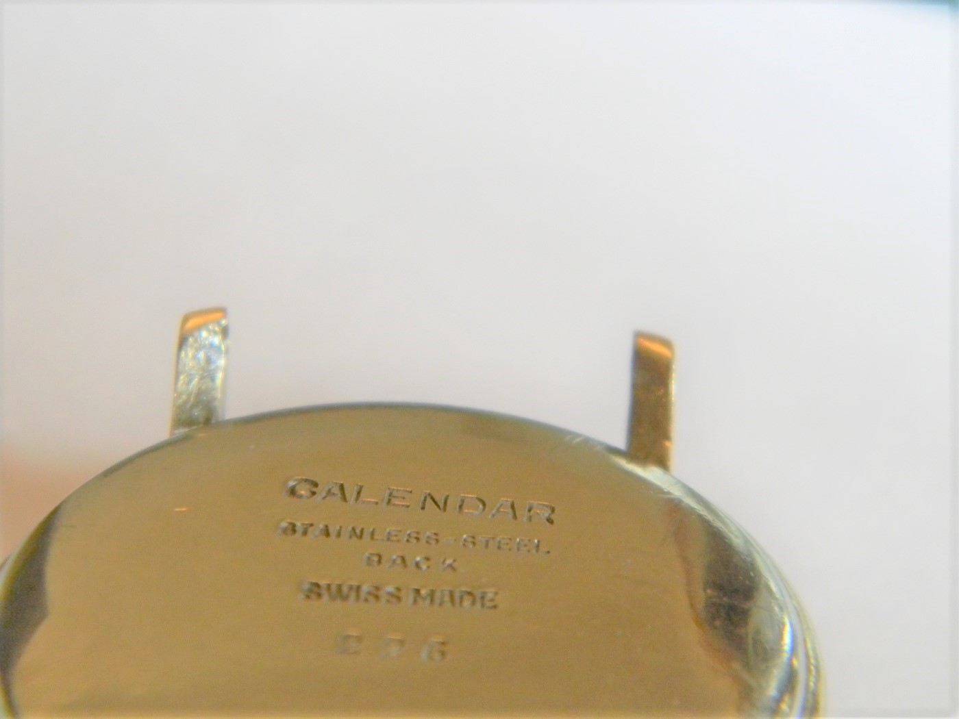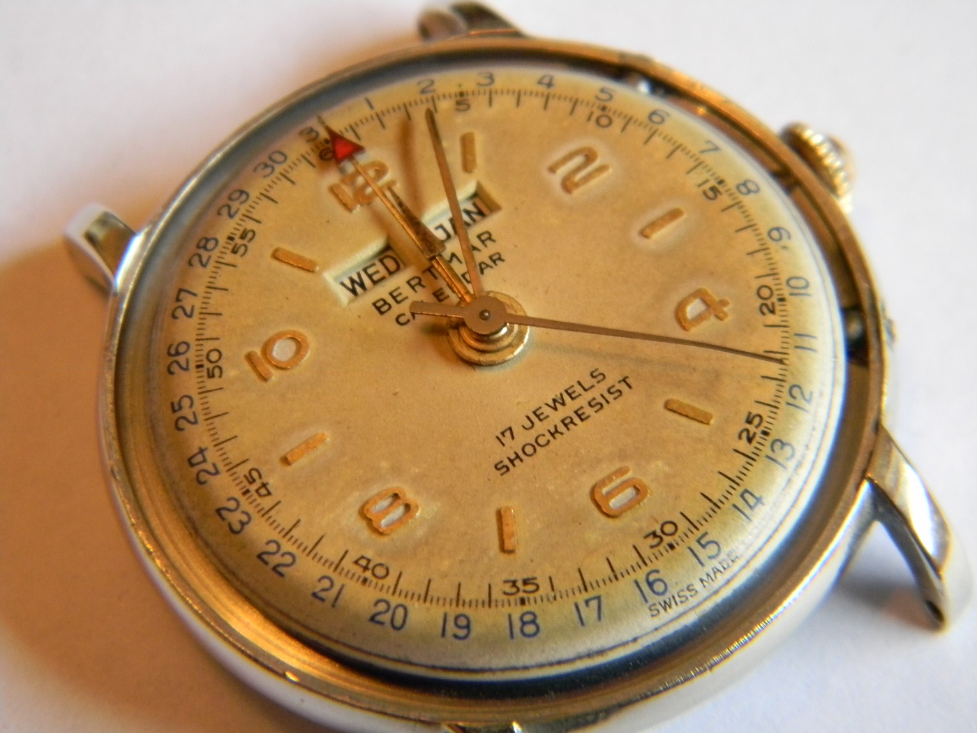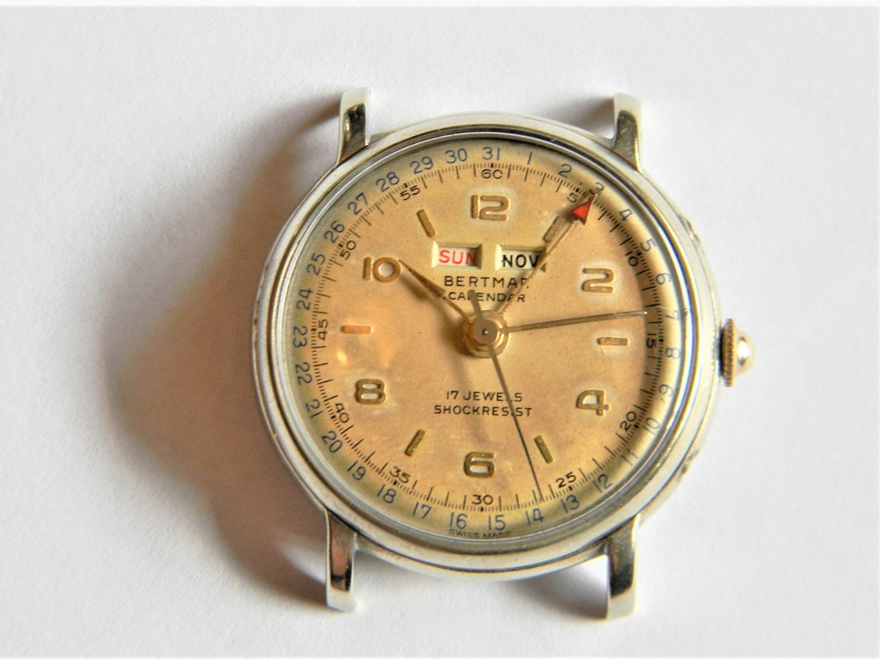 To set the calendar make sure the time is set well past midnight to at least 7AM. Turning the hands forwards advances the weekday. Pressing the button at 2 o'clock advances the month and pressing the button at 4 o'clock moves the date hand.