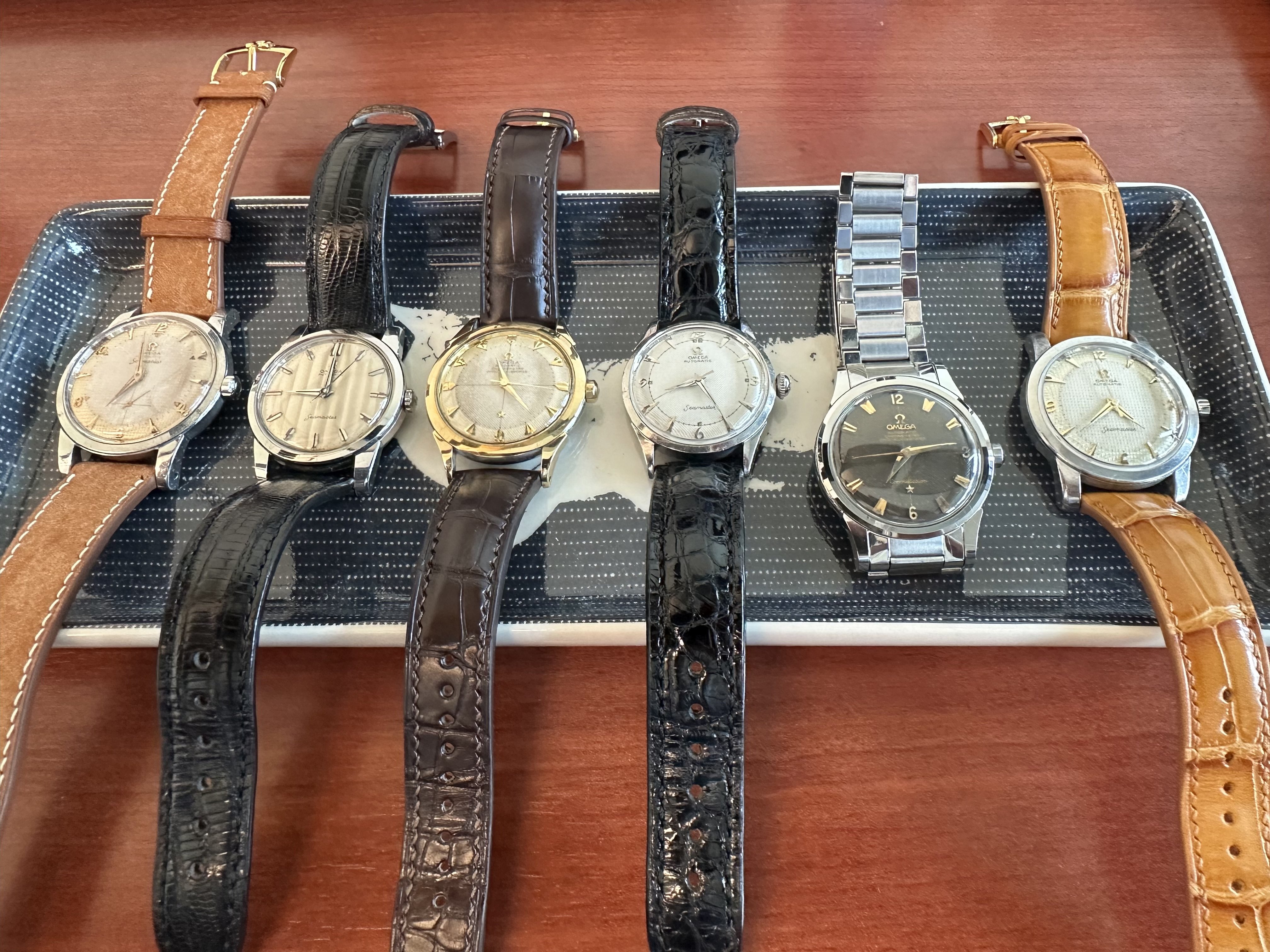 My personal favorite style of Omega dial. Good with white, yellow, or rose gold, with dials variously hued, or black, clean or patina, in steel cases or gold cases.