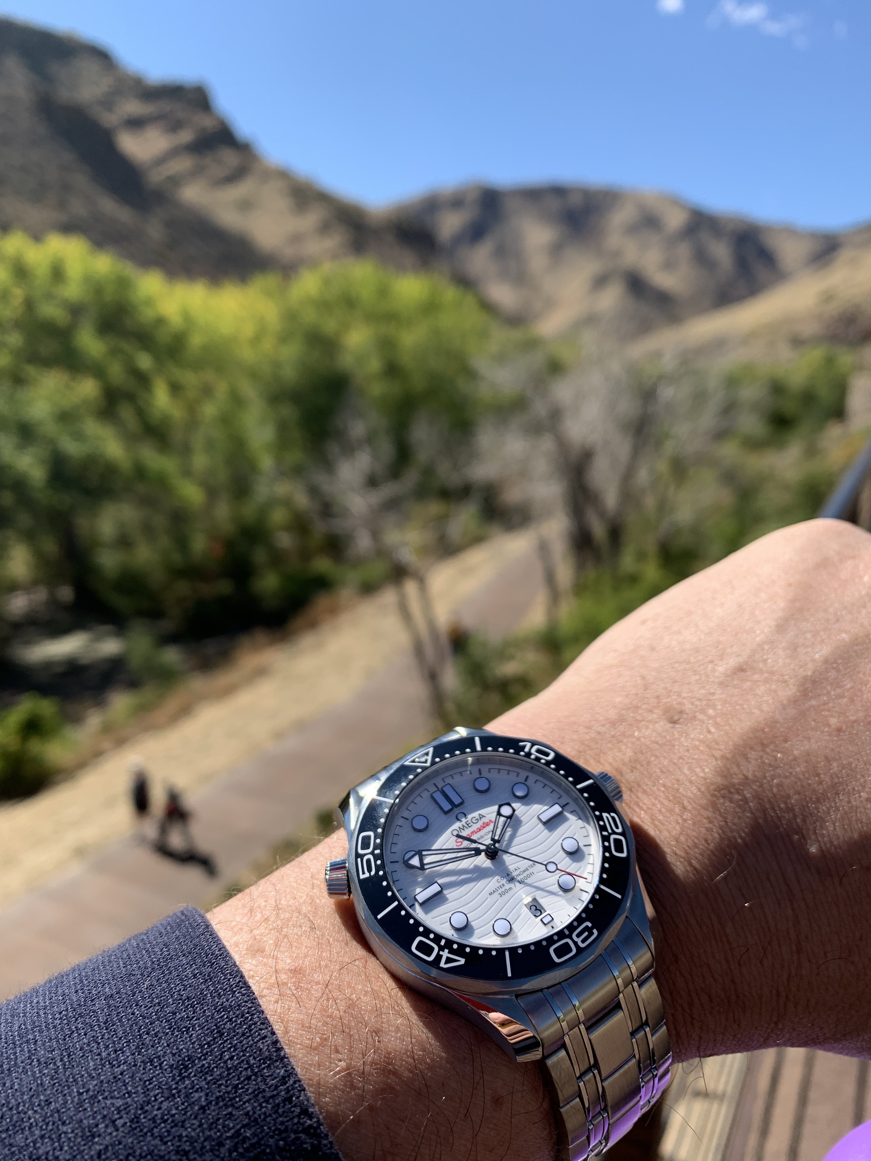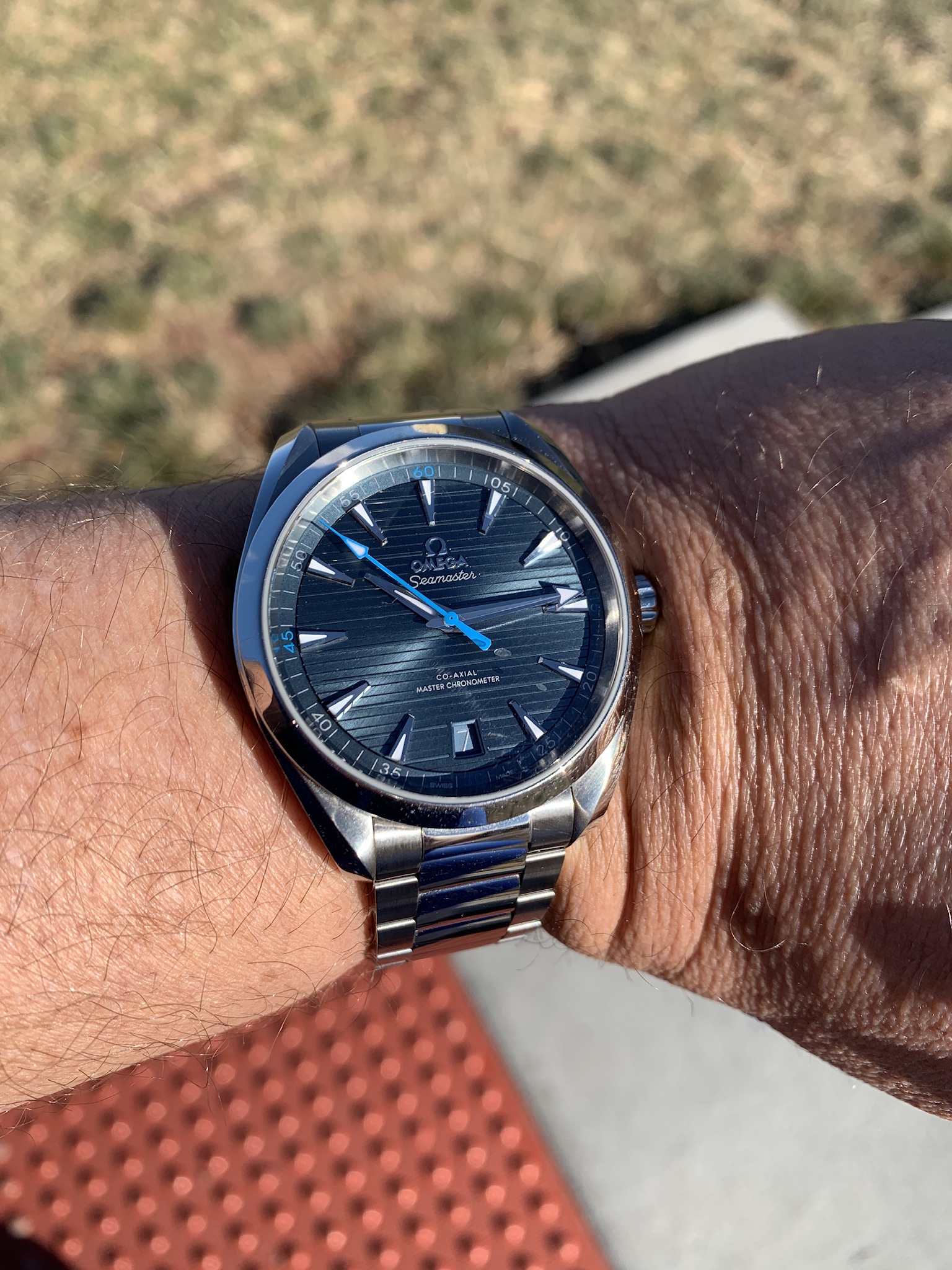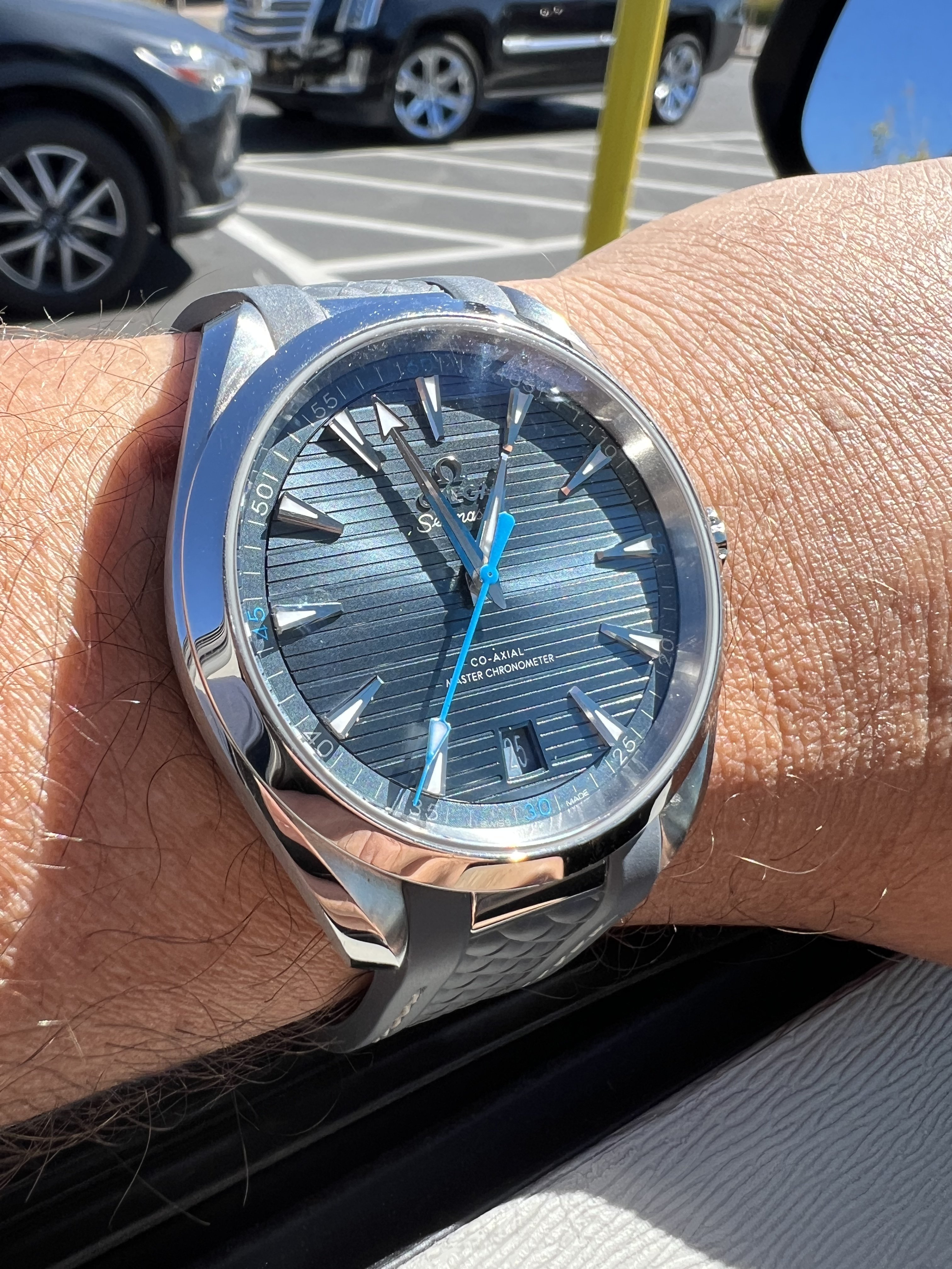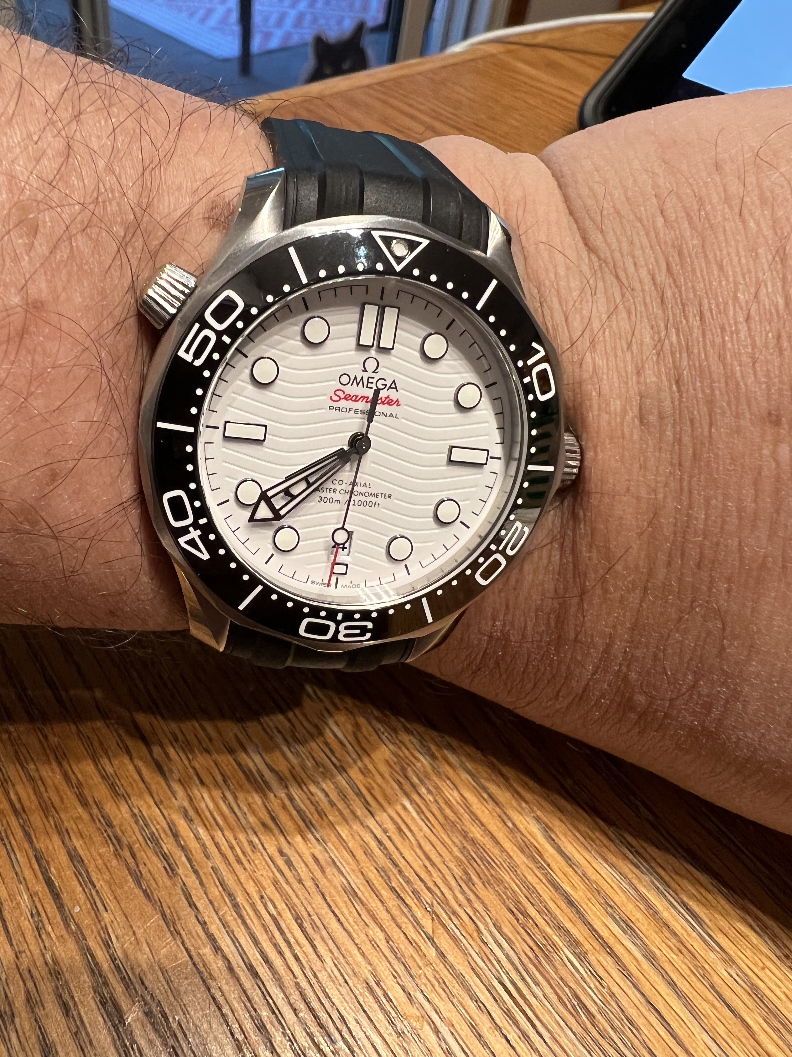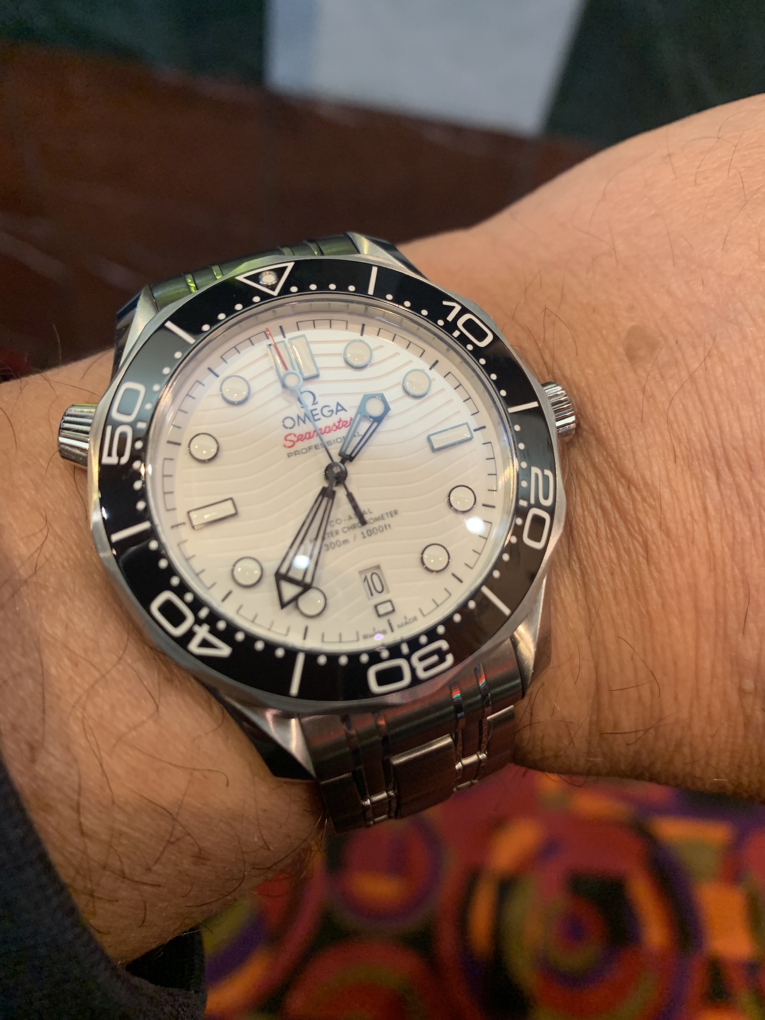 Both watches were bought last year at an OMEGA boutique (Aquaterra 41 steel blue, blue seconds hand on 5/15/21 and SMP300 white dial 10/2/21). Both have box and papers, and both were purchased on the bracelet and I bought the OEM rubber strap with folding clasp for both.