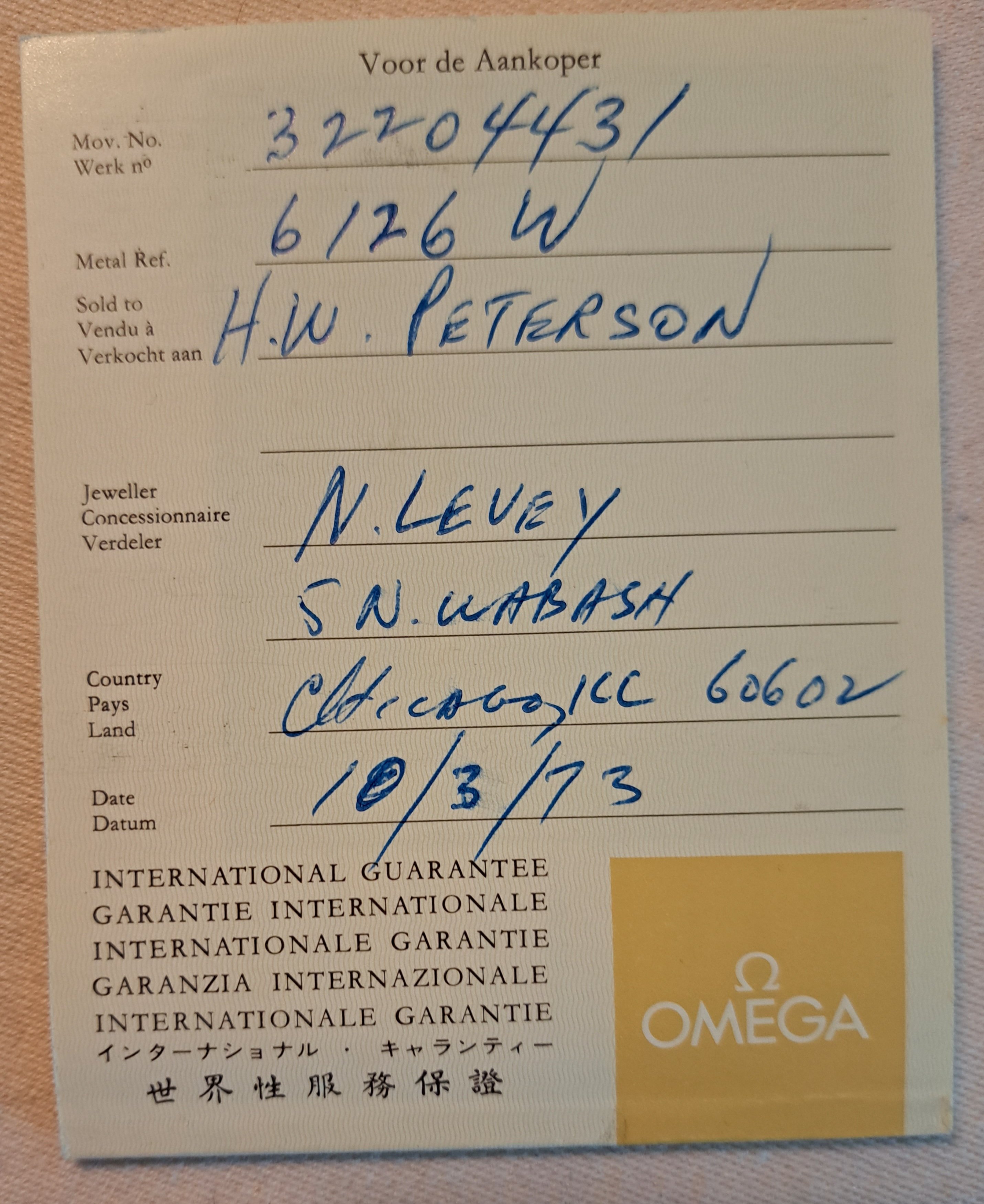 The movement number, 32204431, indicates it was made in 1970. My father purchased it in 1973 at a jeweler in Chicago. The original outer box, purchase receipt and booklets are included. In 2022 I sent it to Omega in Switzerland for complete factory maintenance. All paperwork from service is included. When I had a seller on ebay, the company which does watch authentication for ebay didn't believe that the new bracelet put on by Omega was authentic as it appears to be new old stock. The sale fell through. I now have a document from Omega confirming the watchband is authentic and an upgrade. My listing included the original watch bracelet, and all parts replaced. Original bracelet is marked 2-73. New bracelet put on during service by Omega in 2022 is marked 1171/633.