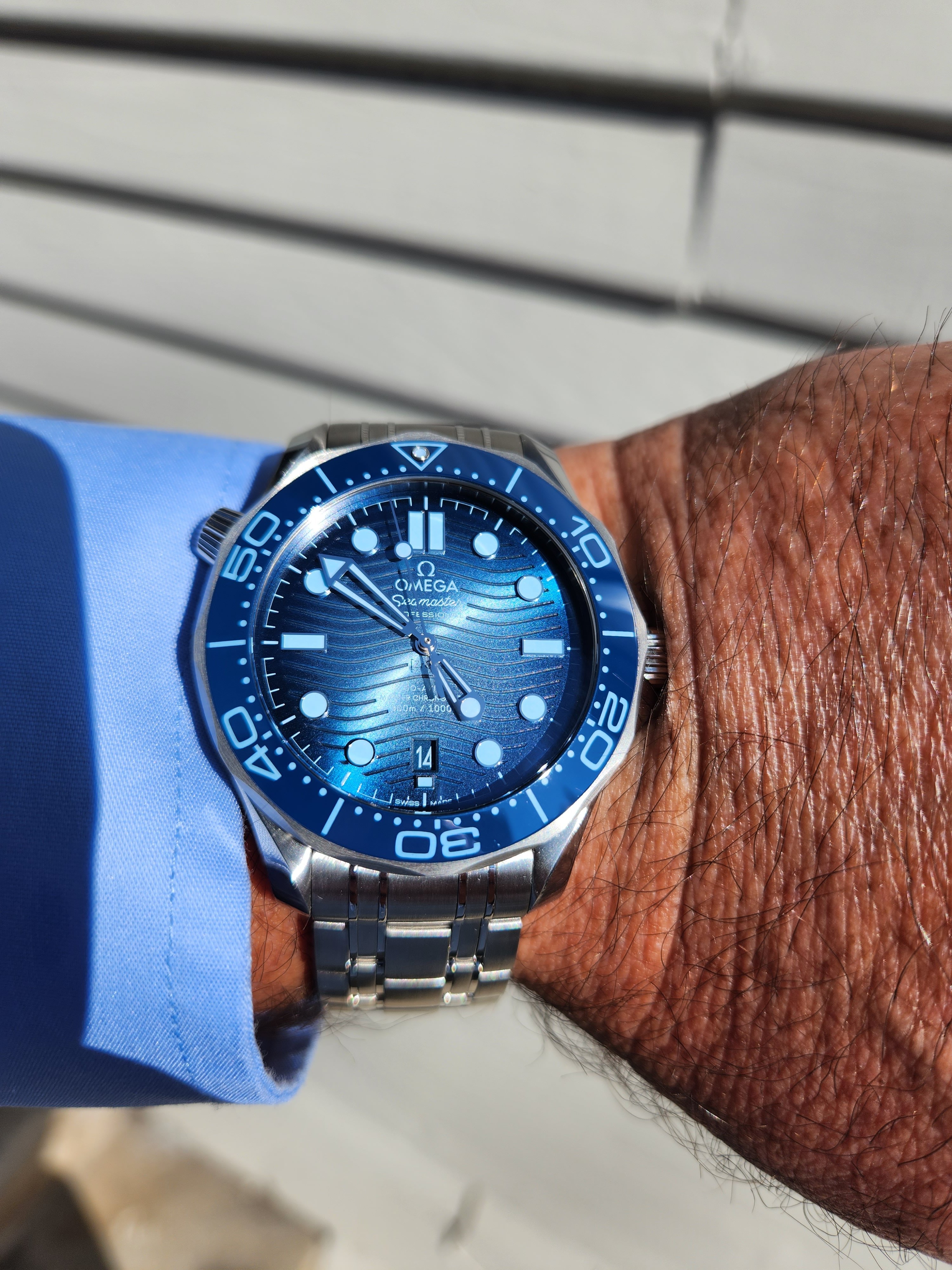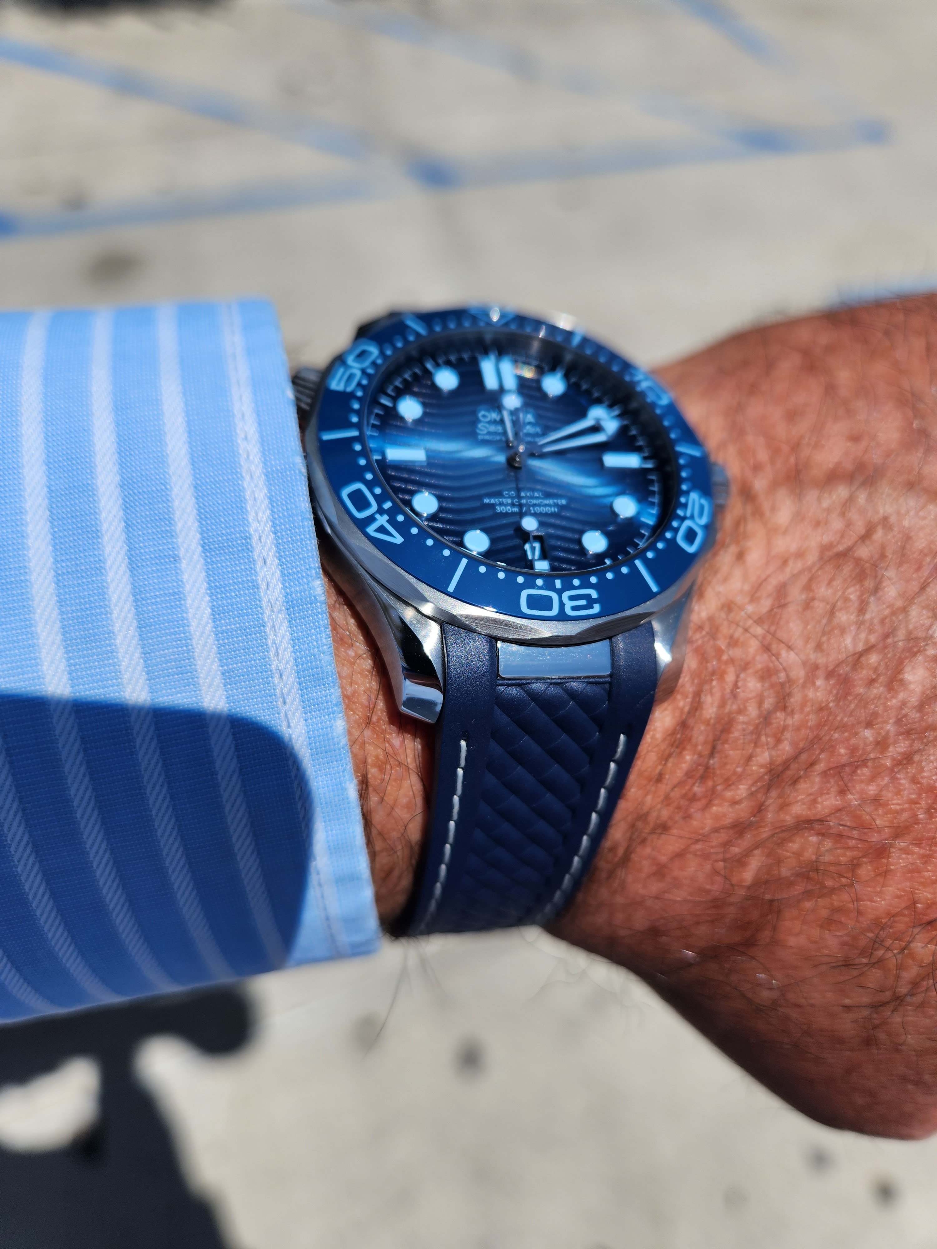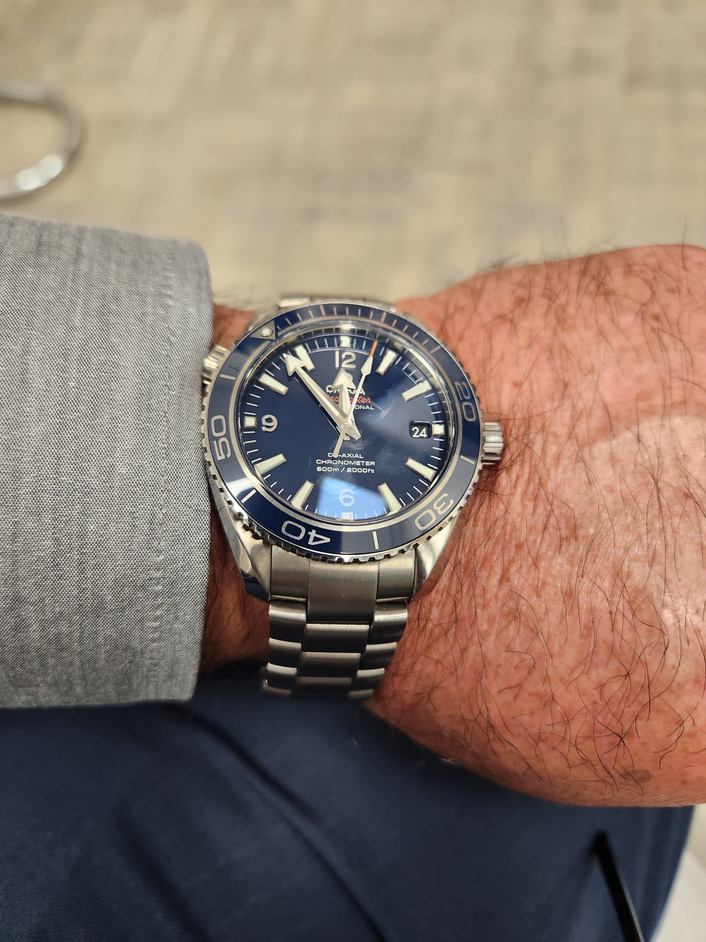 A second alternative to the Planet Ocean is the SMP 300M - also known as the Diver 300. Several pics were posted above for you by other members. Similar to the PO, it screams fancy yet sporty but it has a very different character. For starters, it's not quite as bulky as the PO and the wave dial would be right at home next to the pool. I have the 300M 75th Anniversary which is relegated to casual-dress duties when blue is the theme. Aesthetically though, I gravitate more towards the PO whose stick indices and applied numbers just appeal more to me.