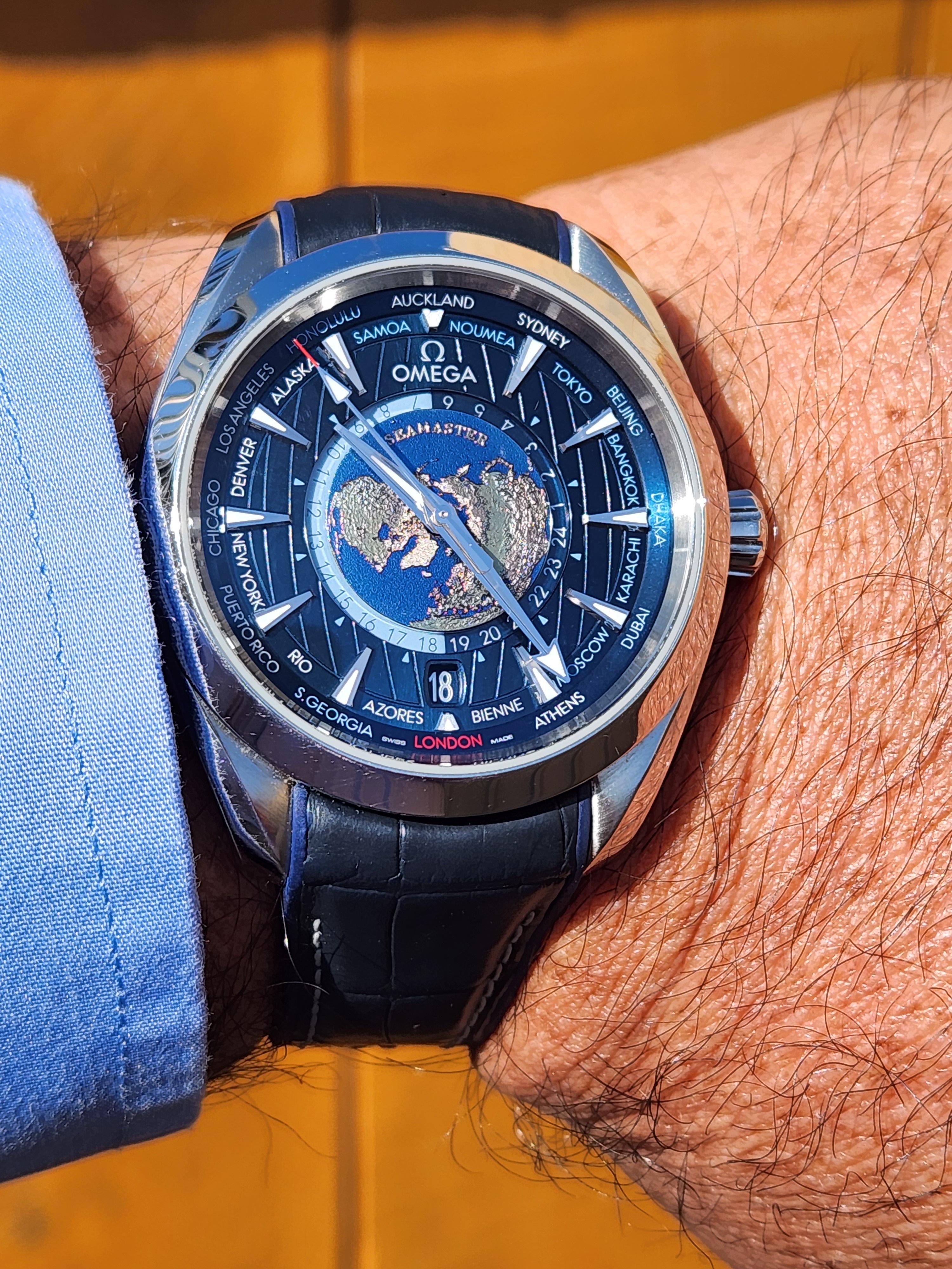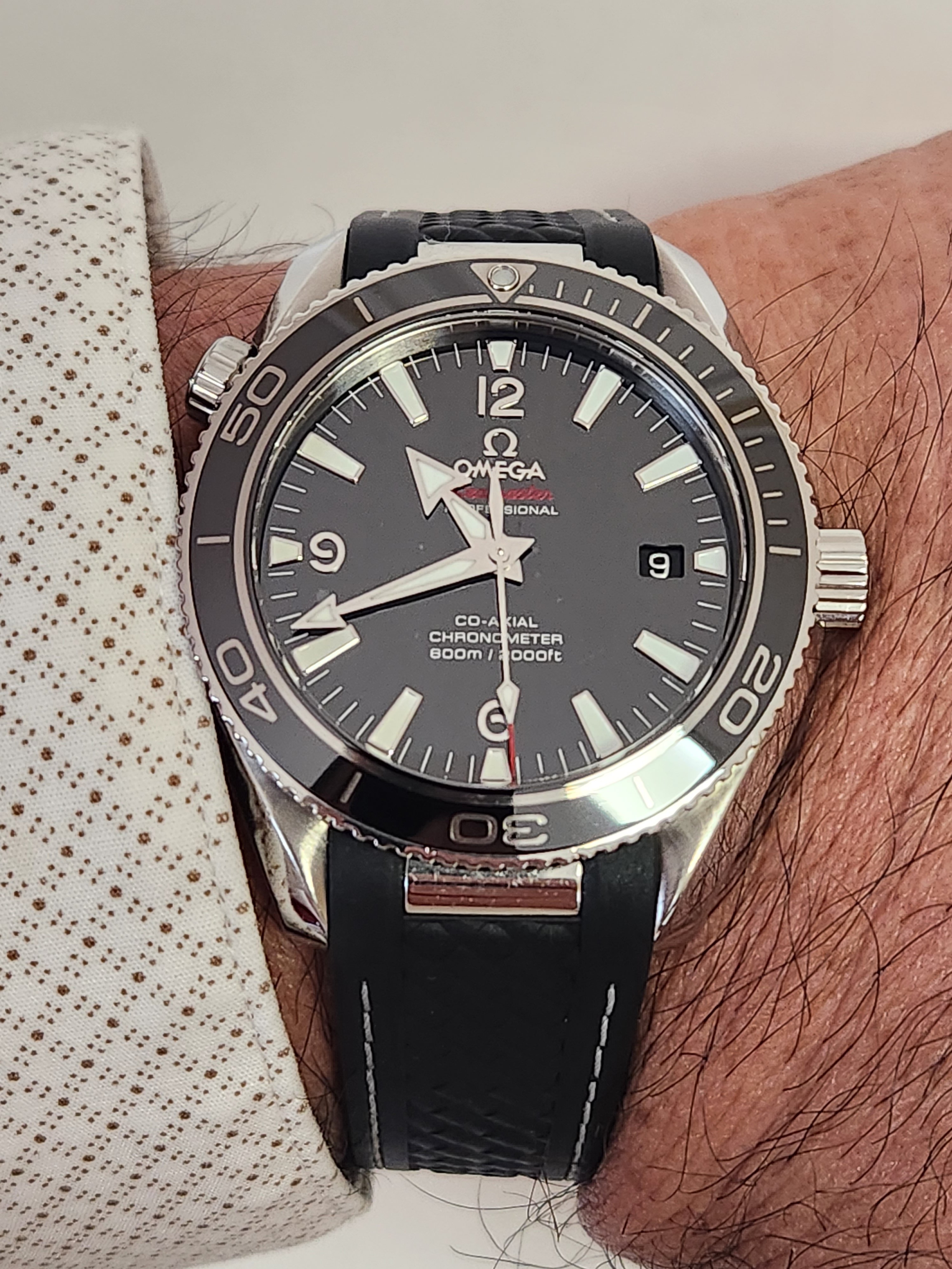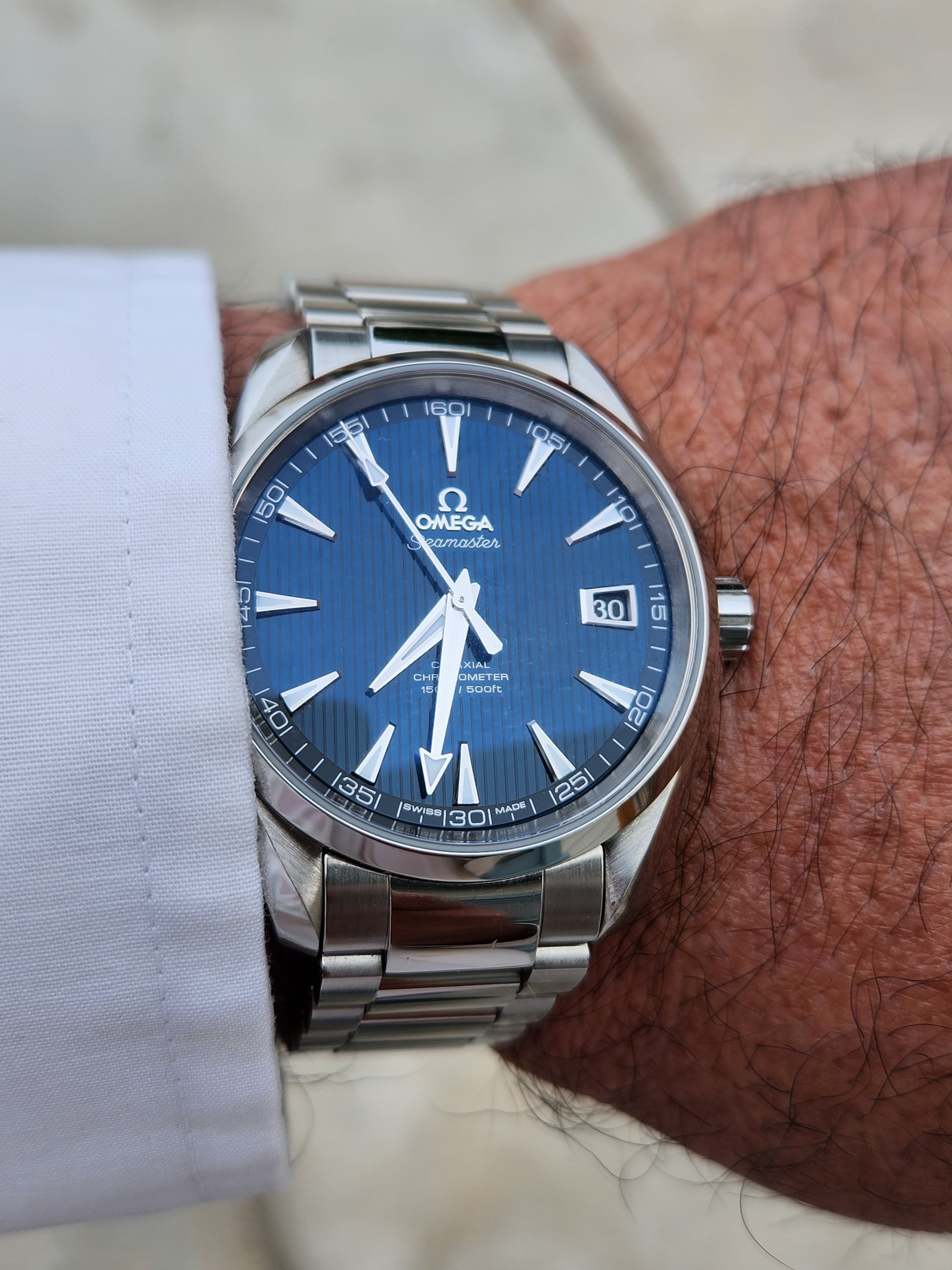 A second alternative to the Planet Ocean is the SMP 300M - also known as the Diver 300. Several pics were posted above for you by other members. Similar to the PO, it screams fancy yet sporty but it has a very different character. For starters, it's not quite as bulky as the PO and the wave dial would be right at home next to the pool. I have the 300M 75th Anniversary which is relegated to casual-dress duties when blue is the theme. Aesthetically though, I gravitate more towards the PO whose stick indices and applied numbers just appeal more to me.