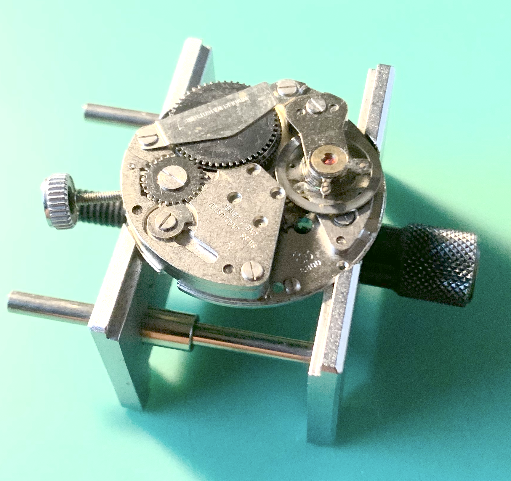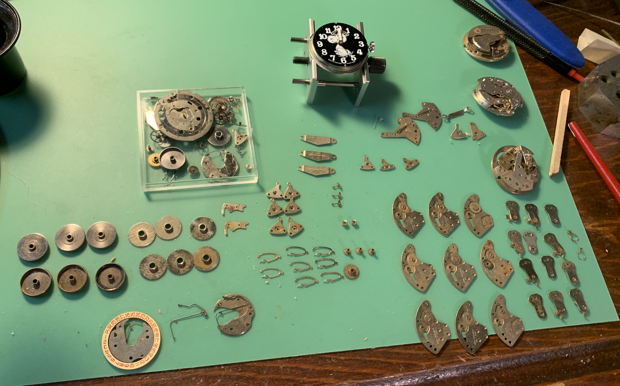 The part looked familiar. Years ago I started sorting the loose parts by type. I had a few odd parts that did not quite fit. I also found I had a movement with the same caliber, but is a sweep calendar. I disassembled this for practice before attempting the snoopy.