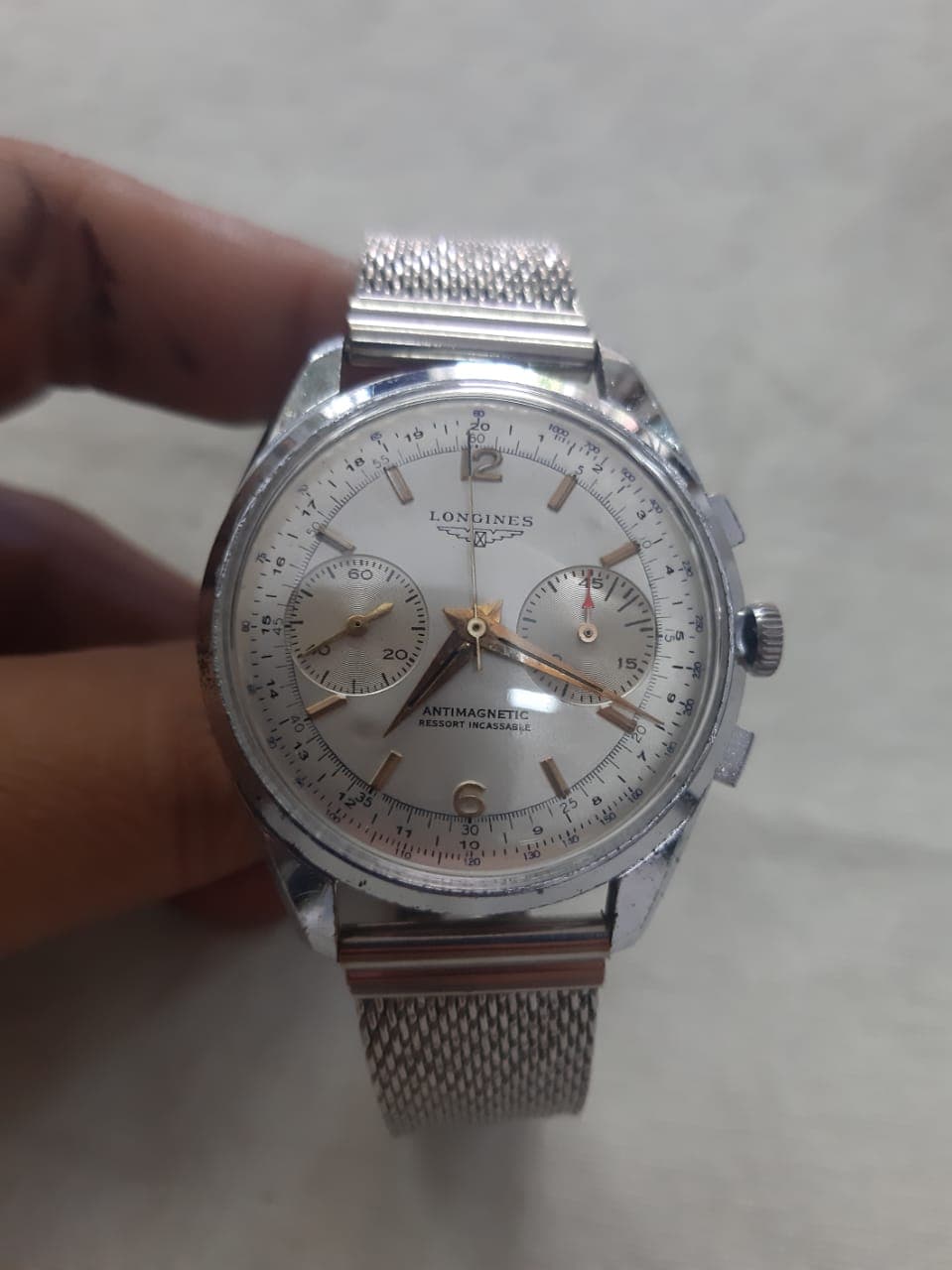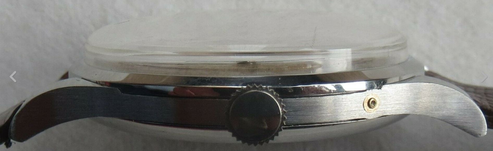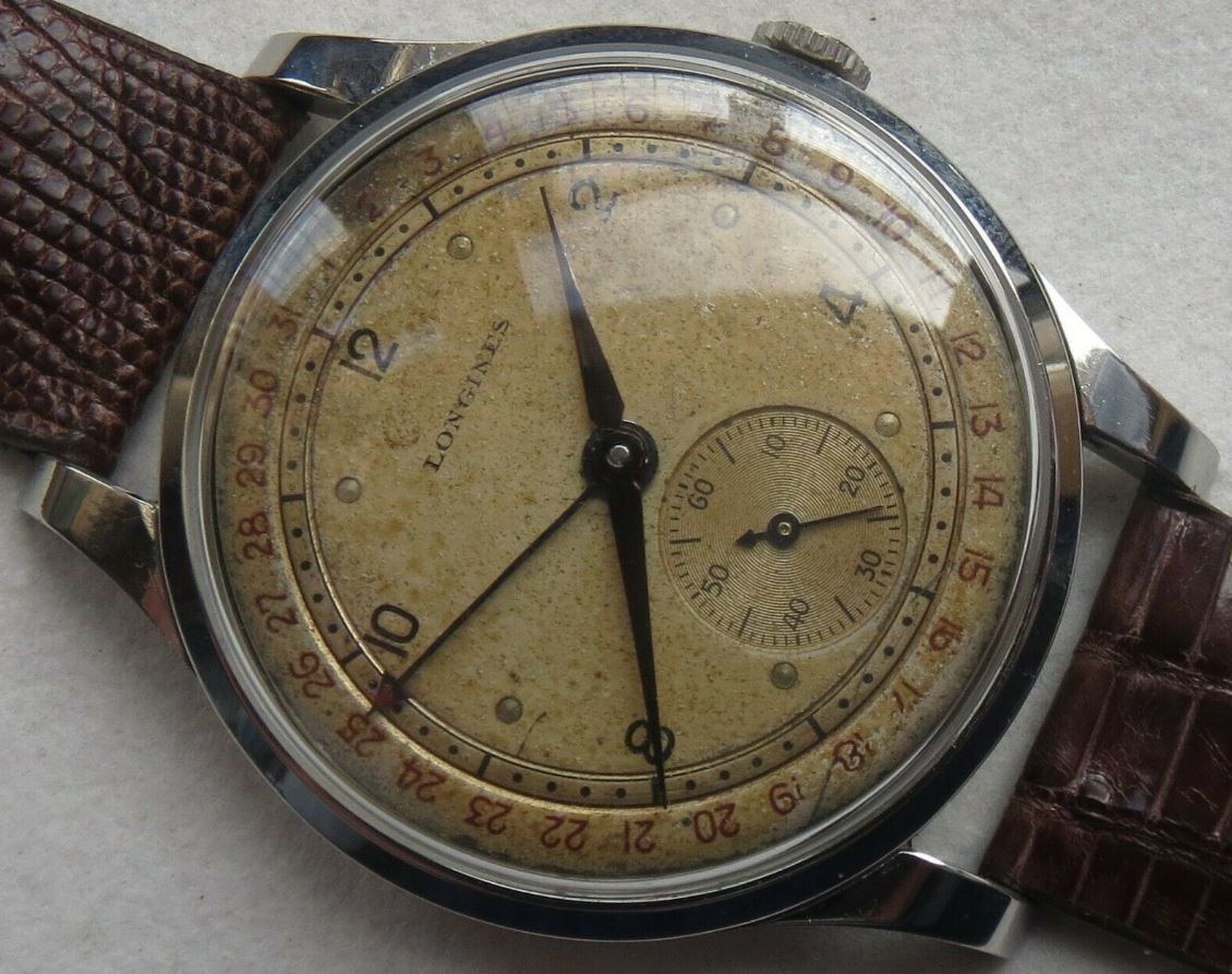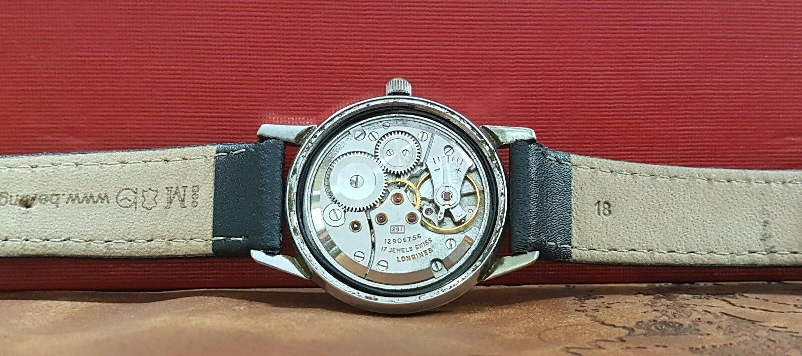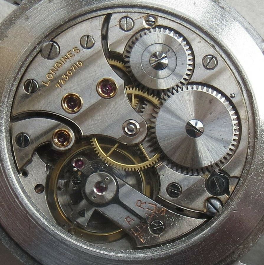 Below are different images of the same watch/movement, with the visible dial foot highlighted. Dial feet are prongs, which are on the back of the dial, that insert into holes in the movement for purposes of situation. Since most Longines of this era had dials that were primarily composed of brass, the dial feet should appear brass-toned. A white dial foot is usually the sign of a redial. However, not all redials present white dial feet.