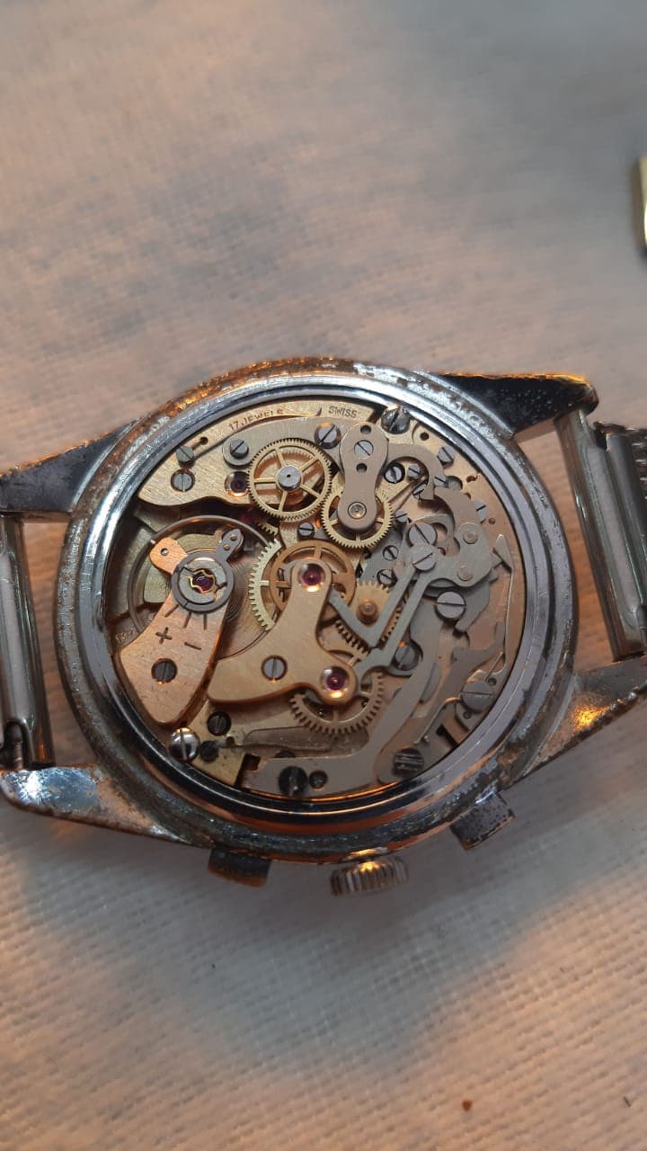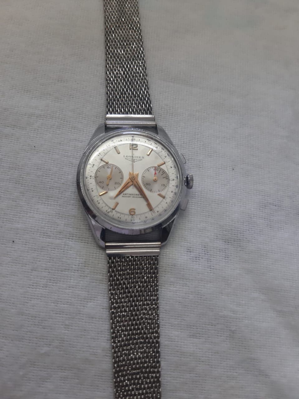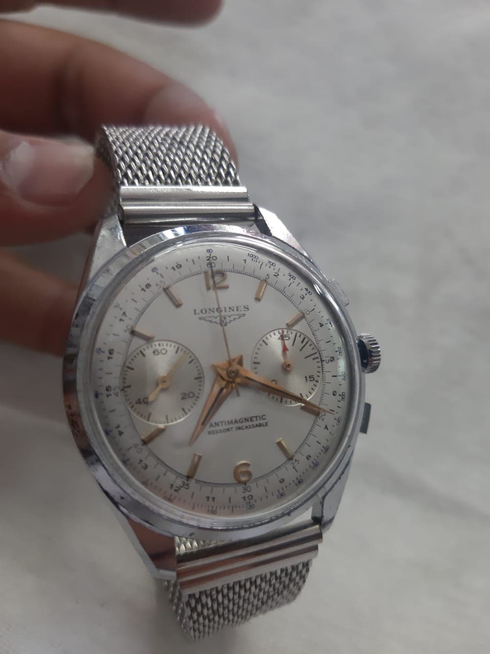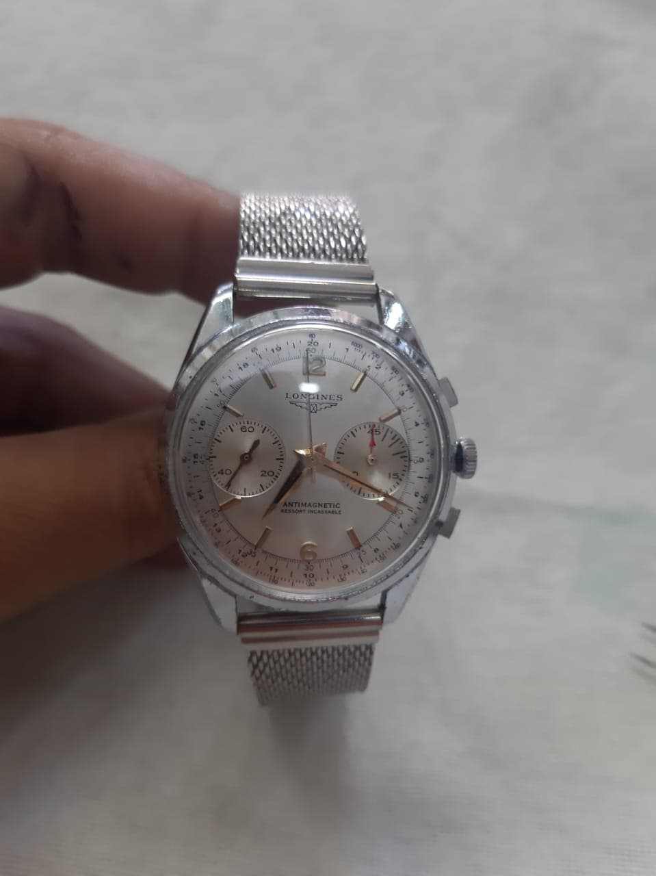 Below are different images of the same watch/movement, with the visible dial foot highlighted. Dial feet are prongs, which are on the back of the dial, that insert into holes in the movement for purposes of situation. Since most Longines of this era had dials that were primarily composed of brass, the dial feet should appear brass-toned. A white dial foot is usually the sign of a redial. However, not all redials present white dial feet.