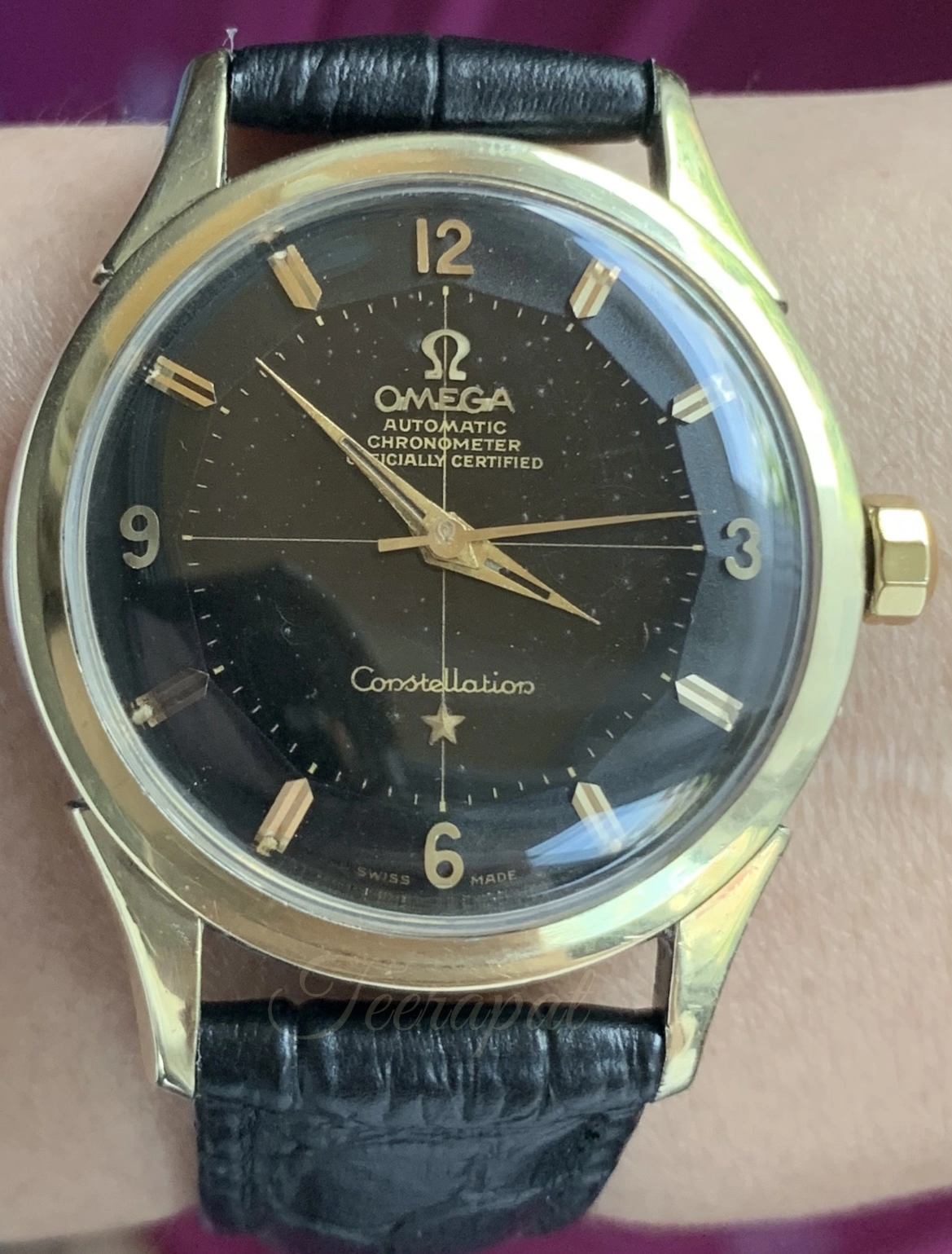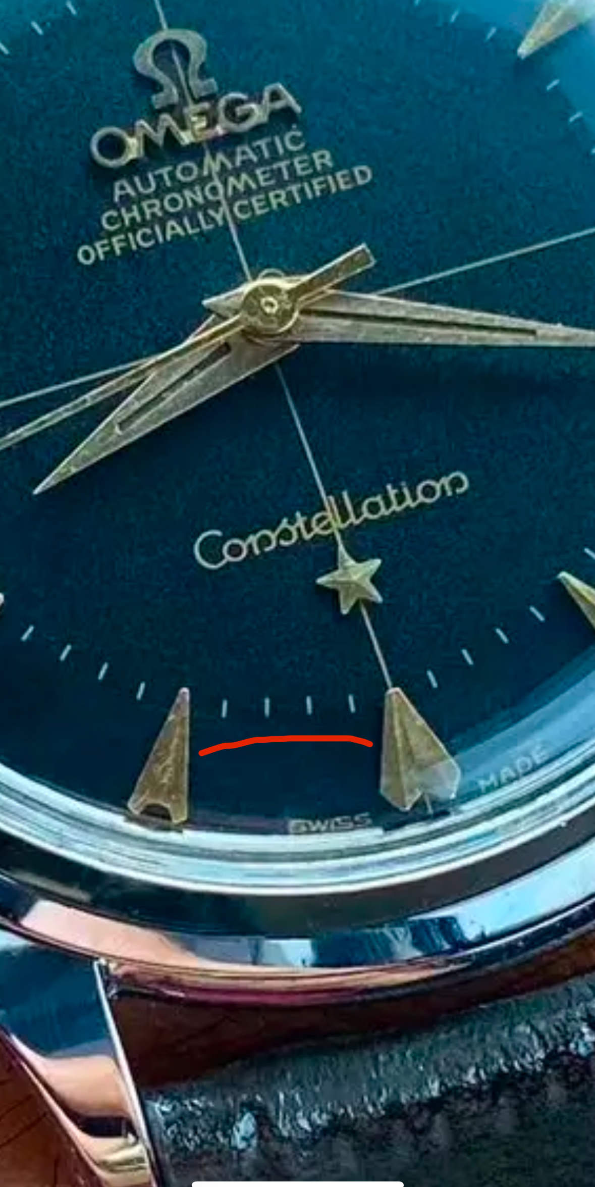 I need help from more experience people to comment on this Constellation. I'm hunting for a Constellation and find this one in my local market, Thailand. I can't decide the authenticity of this one. Every thing looks shiny, which raises suspicious. The font looks similar to the original but seems not to have serif and text size is a bit too large. The hands and crown look correct. The calibre number is correct, but the color difference between the top and bottom parts makes me suspicious. The case is quite soft, but is it in acceptable range or too bad. Most of the ones show up in my local market have soft case and overly polished. The seller asks for $900-1,100. If it was authentic, would that be a reasonable price?