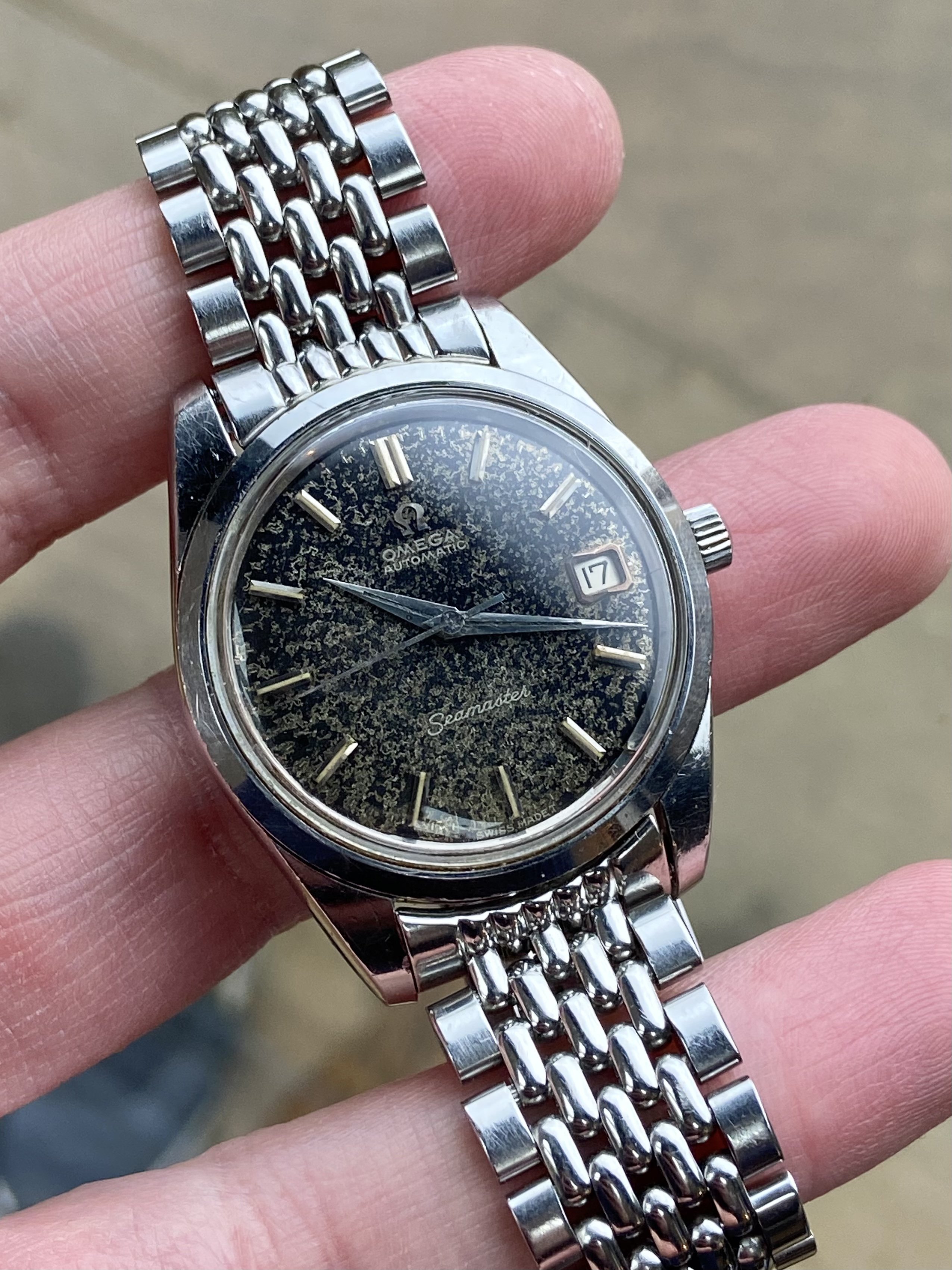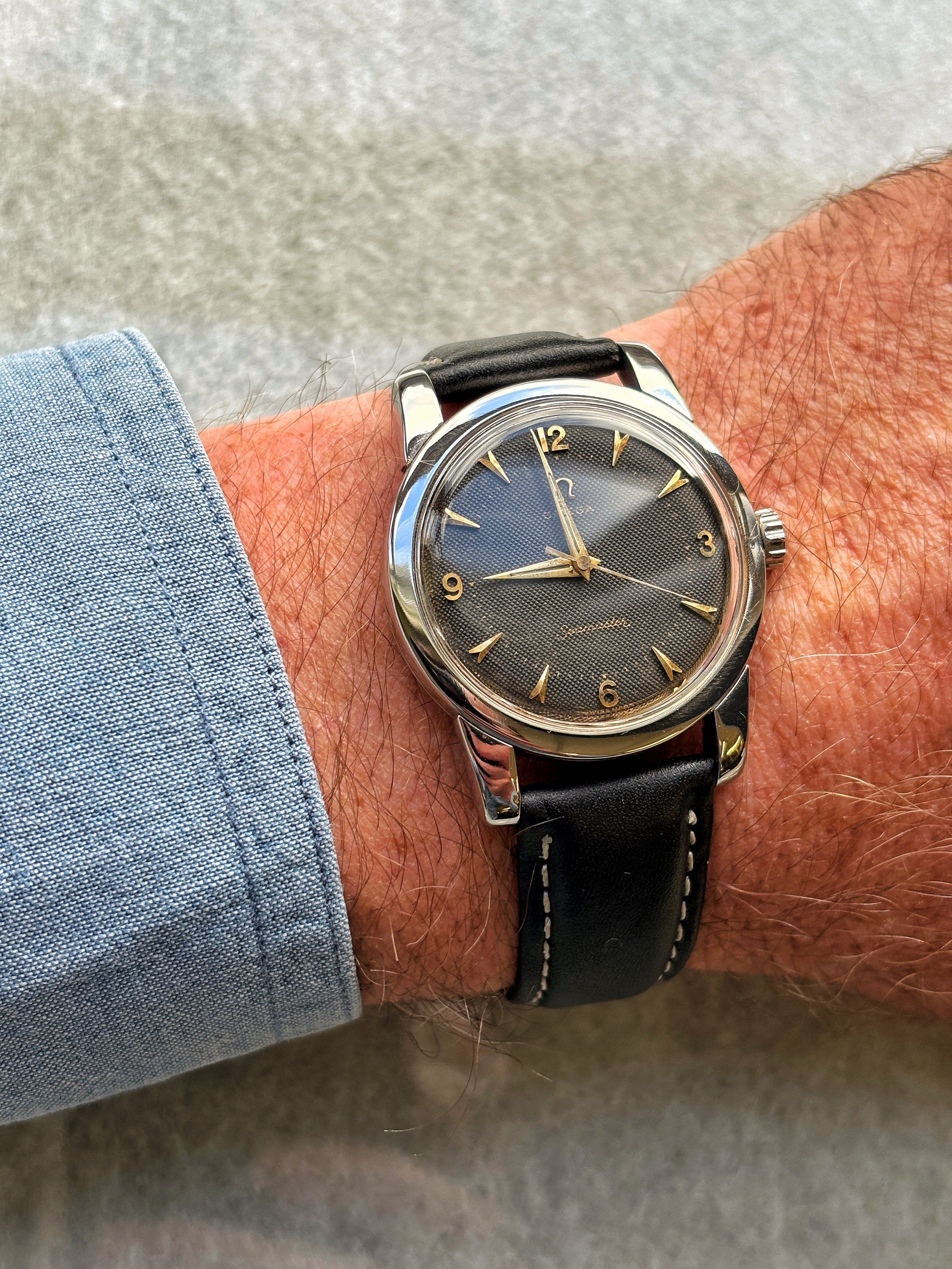 ·This doesn't answer your question but the black dial I own, and am coincidentally currently wearing, is the cheapest Omega I have ever purchased $180 USD (not including postage)... I purchased it about 2 months ago from Japan and I guess the owner just had no idea what type of money they could get for it or simply didn't care... Sometimes the most valuable things are the ones others overlook.