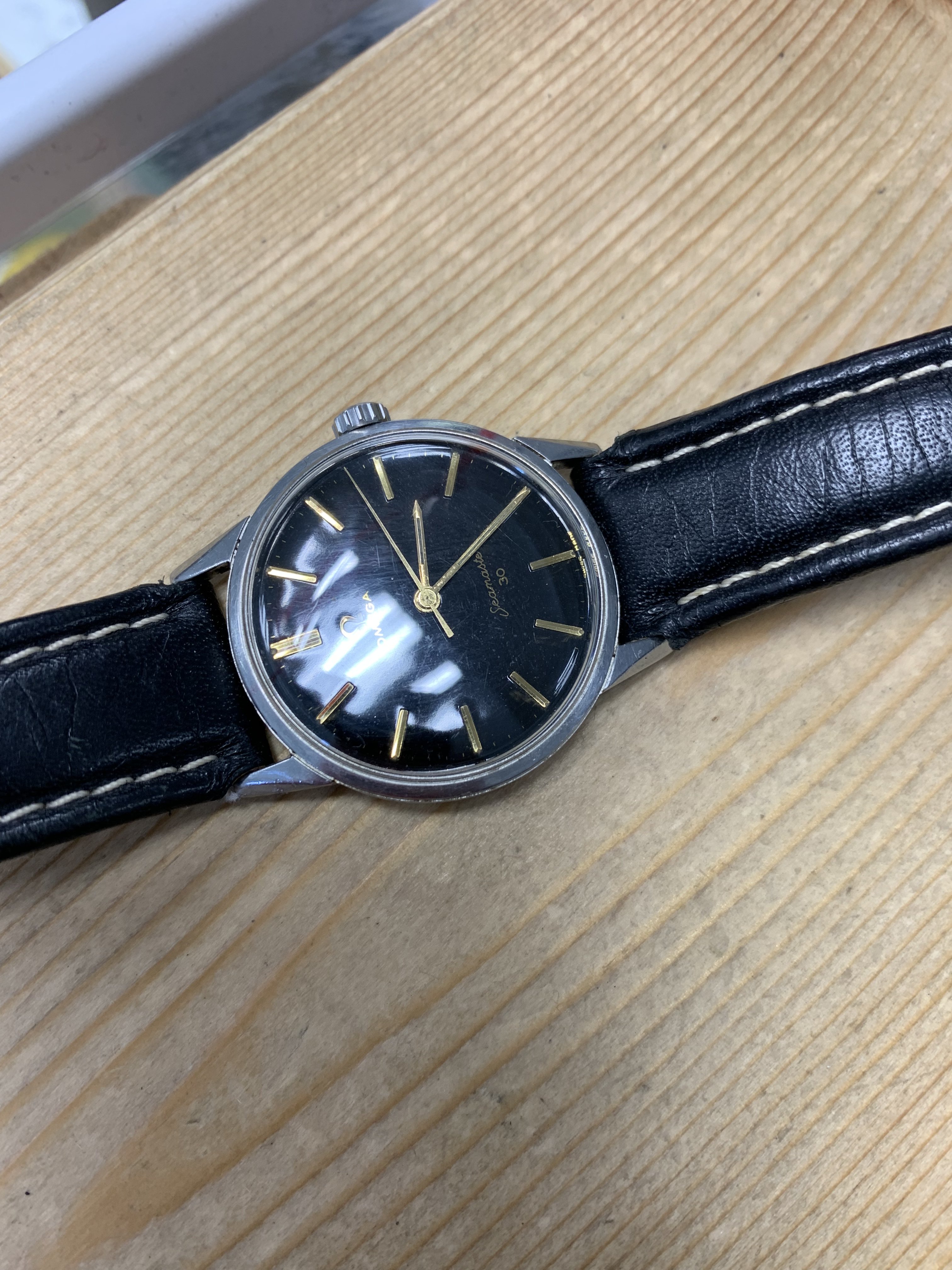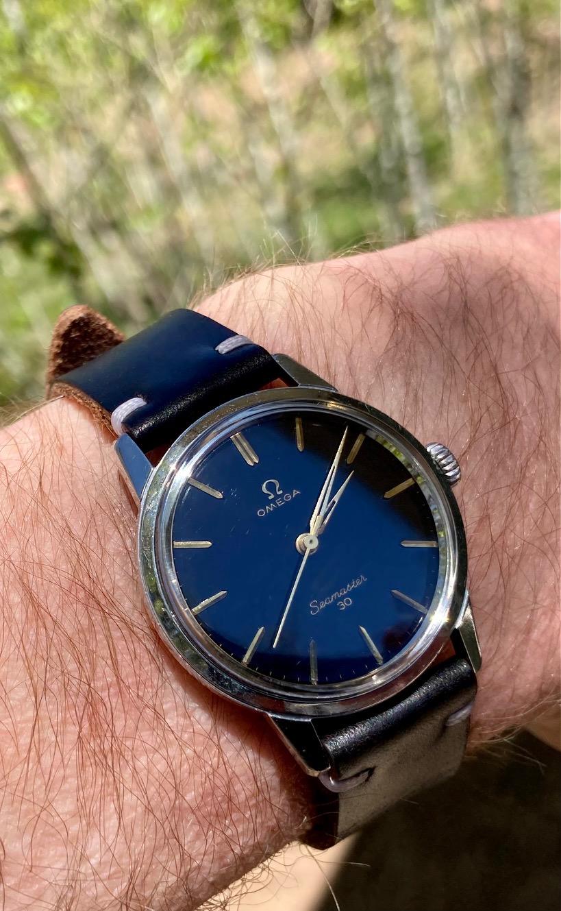 In 1964, (i think) the script and the "S" is different compared to your earlier dial. I'm certainly no dial expert, but this is my 1964 Seamaster 30 Cal. 286. ref. 135.007 serial # 21,xxxxx. I'm not qualified to say if everything is original or not, but it has "dagger' hands and faint "T SWISS MADE T" text at the bottom and decayed lume on the hands and hour markers and an Omega crown. I'm running a flat top tension ring crystal on it now and a Fin Watch Straps strap because I just like the look. The marks at 11:00 are just dust on the outside of the crystal. Photos are harsh on a watch!