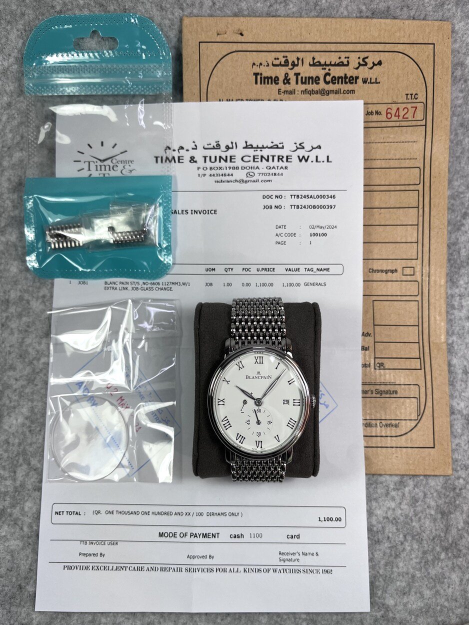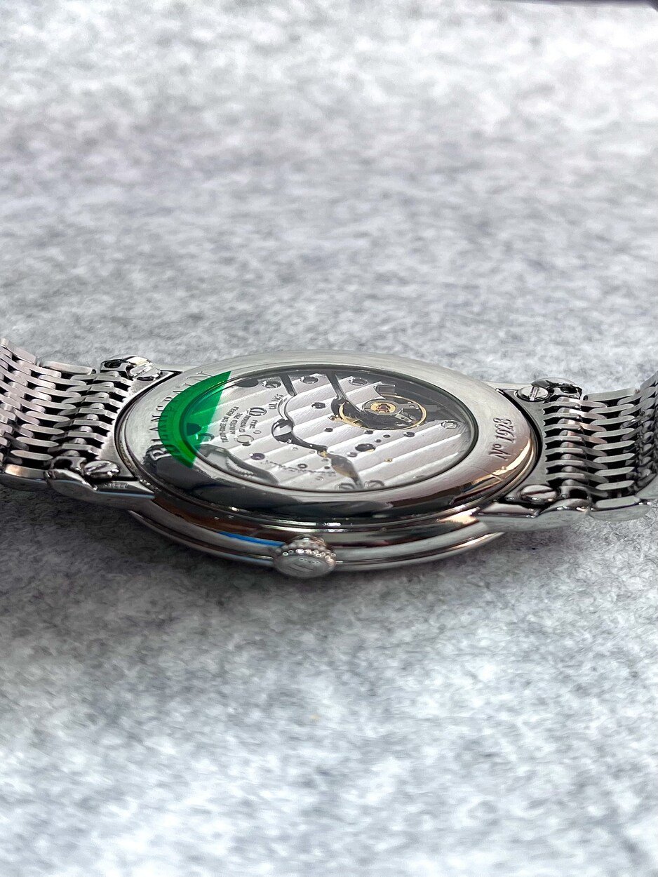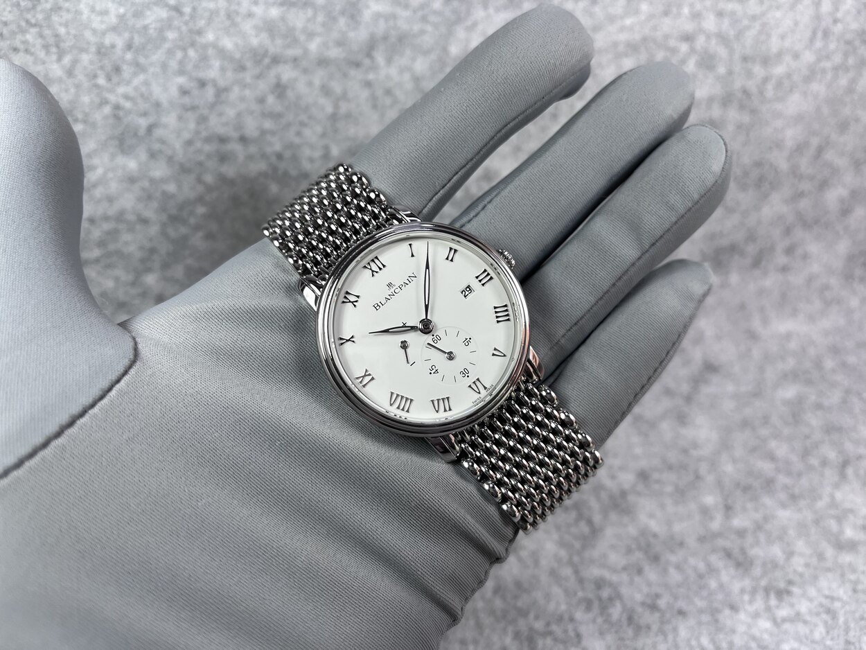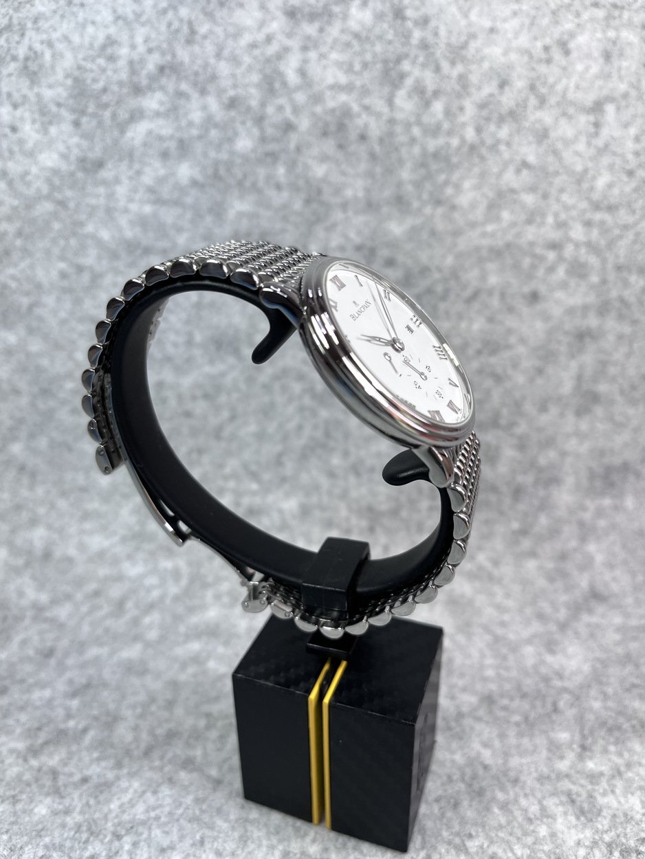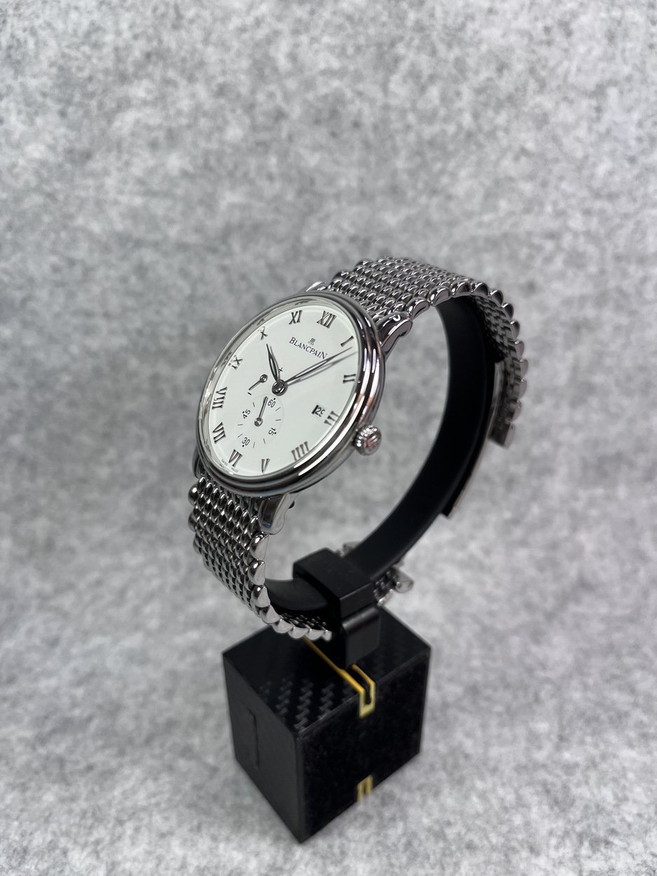I have a Blancpain Villeret ‘Ultra Thin’ in 40mm. Selling for only £3,999 or best offer. The watch is in excellent cosmetic and functional quality. The case has many elegant features, from the stepped mid case and bezel to the short and well formed lugs. The ‘Milles Mailles’ bracelet is manufactured using around 500 small links and pieces, making it a joy to wear as it forms and contours around your wrist. The watch can also look classical on a traditional leather strap. The dial is crisp and very legible at quick glances. Printing is fine and minimally done. Watch was recently fitted with a new sapphire crystal (old one is also supplied). Hands are highly polished and in the leaf form. The movement, plate and bridge finishing are as you would expect from such a high horology brand. Parts are cut and shaped with interesting forms. Bridges are finished with wide Cote De Geneve and polished bevels. These all play beautifully with the light. Watch is in excellent condition with few marks, hairline scratches or dings. The watch has been kept in my tough, watertight, dustproof, pressure equalised PELI 1450 watch case (not incuded) in a temperature controlled room and opened once a month to give the movement a full wind.