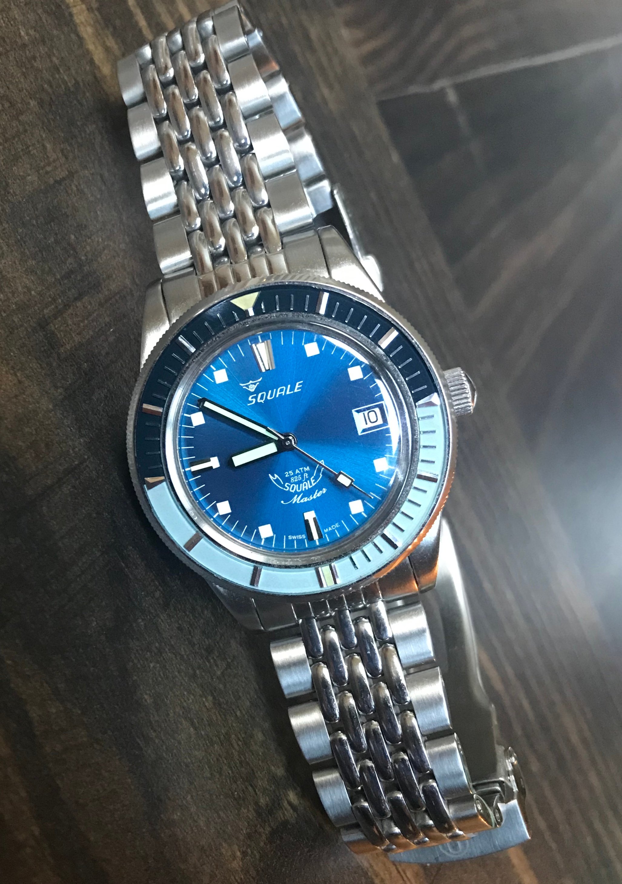 Newer acquisition. Squale Vintage Master ca. 2014. Limited edition of 20 in blue bezel and 60 overall, designed and produced and around vintage bakelite bezel inserts from the 1960’s found in manufacture’s storage.