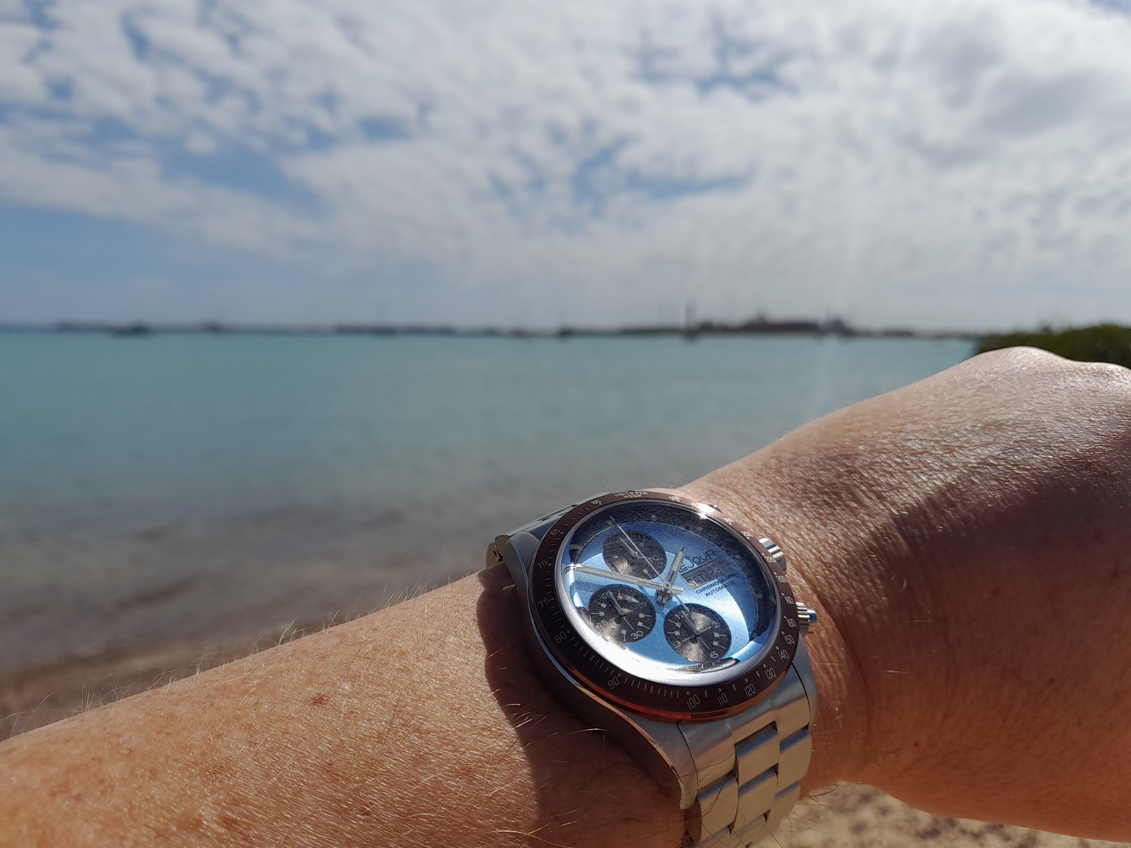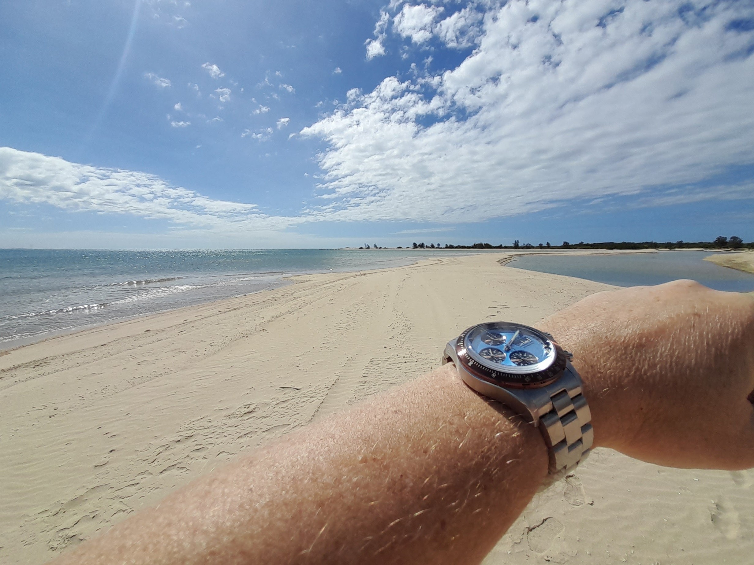 Posts 976 Likes 1,758 Emeister ·Jul 23, 2022 Le Jour Le Mans chronograph. Wrong location really. At least 15km from the local dirt track. The dial really matched the sea today but I couldn't capture it properly as I was too focused on the 360° lookout for Old Mate Saltie