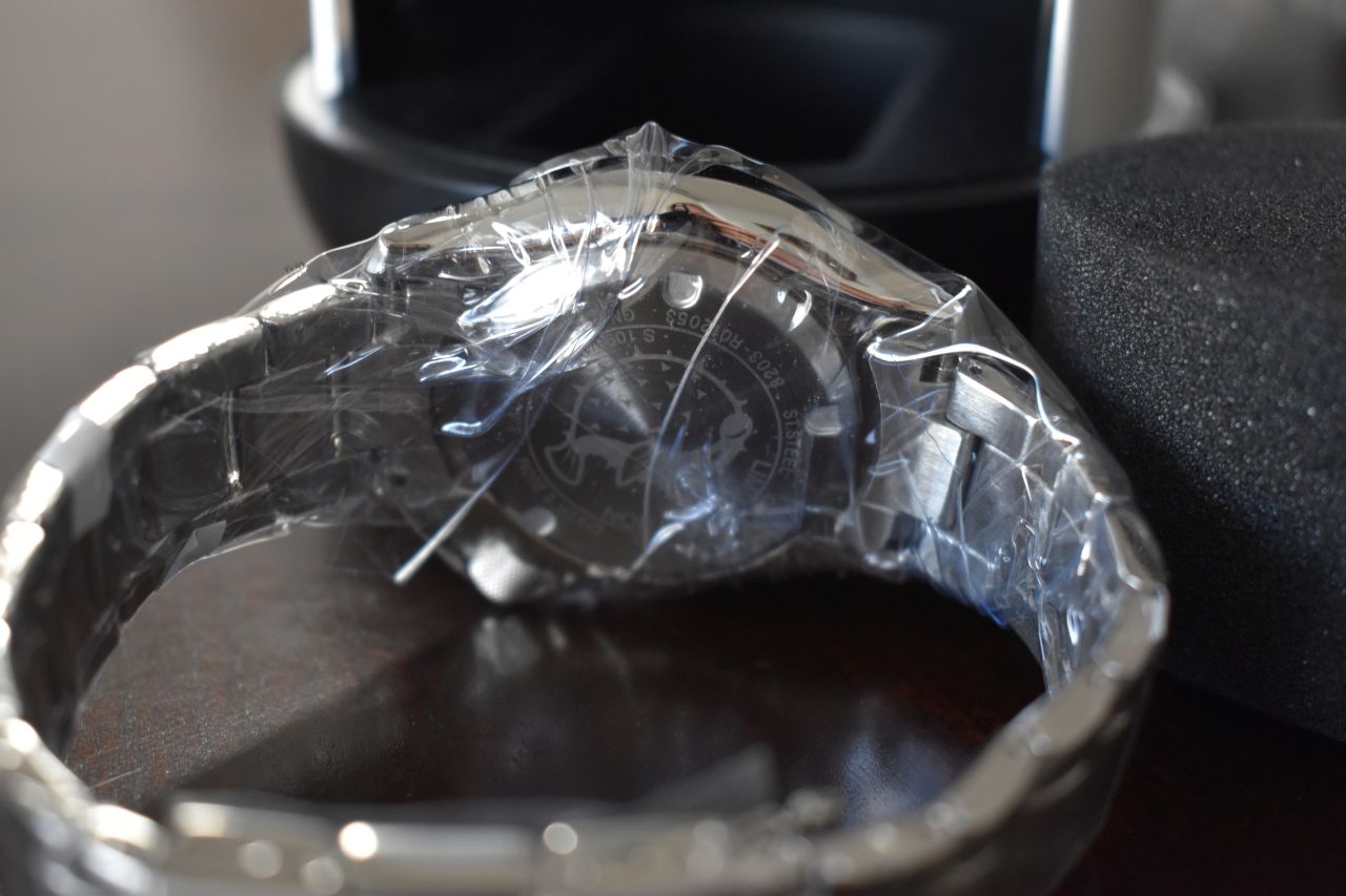 A window at the 3 o'clock hour reveals the automatic day calendar.