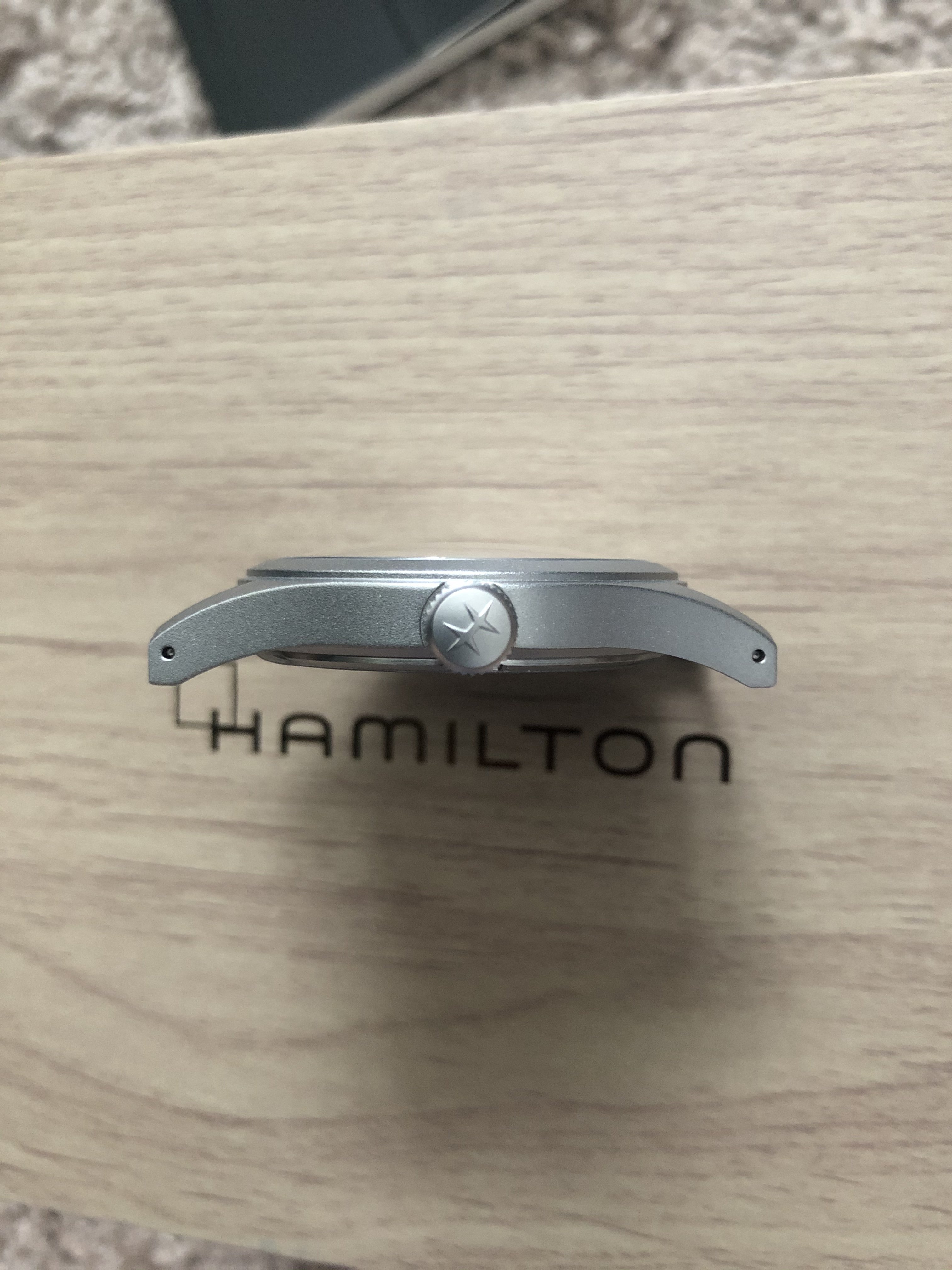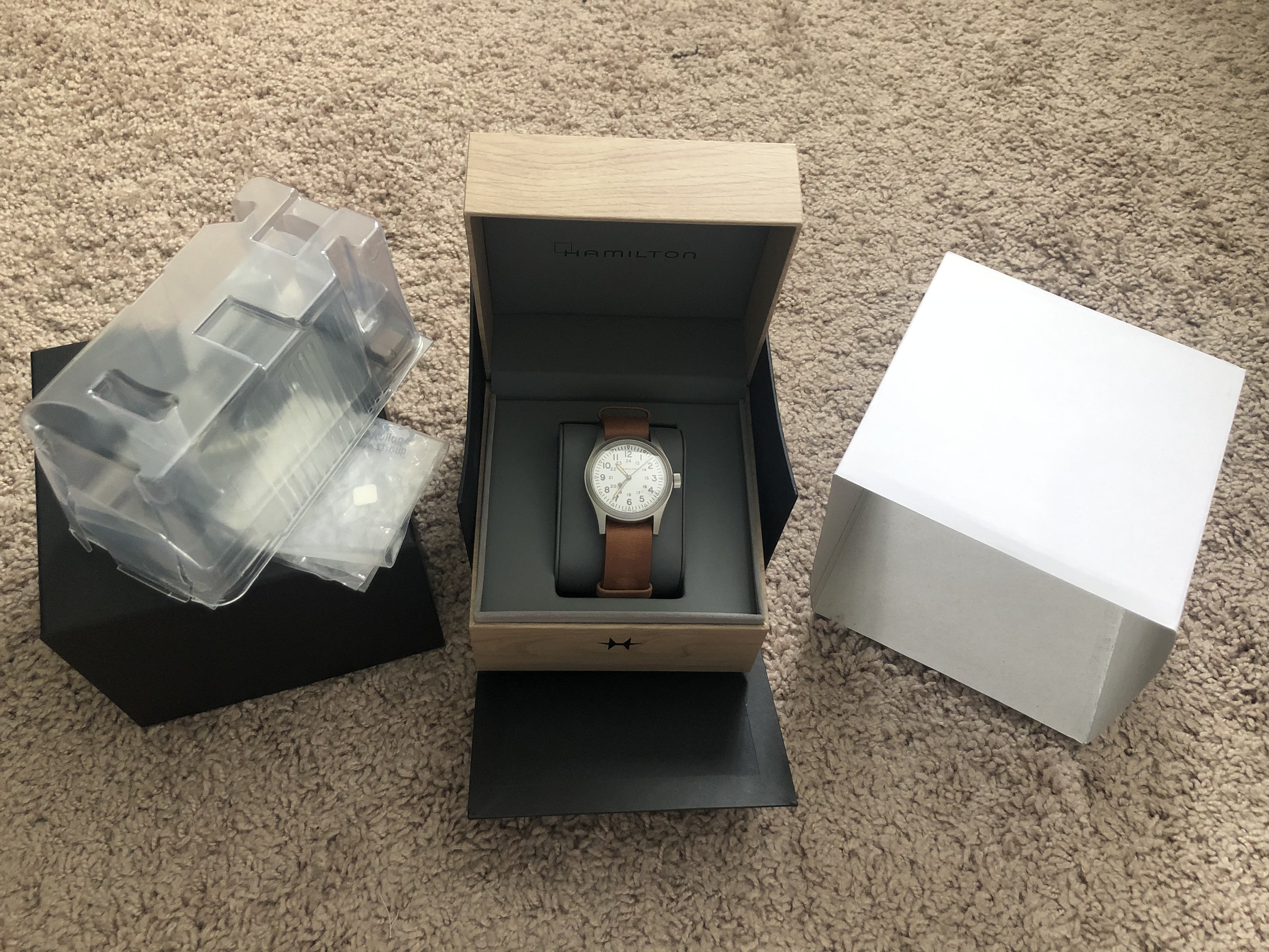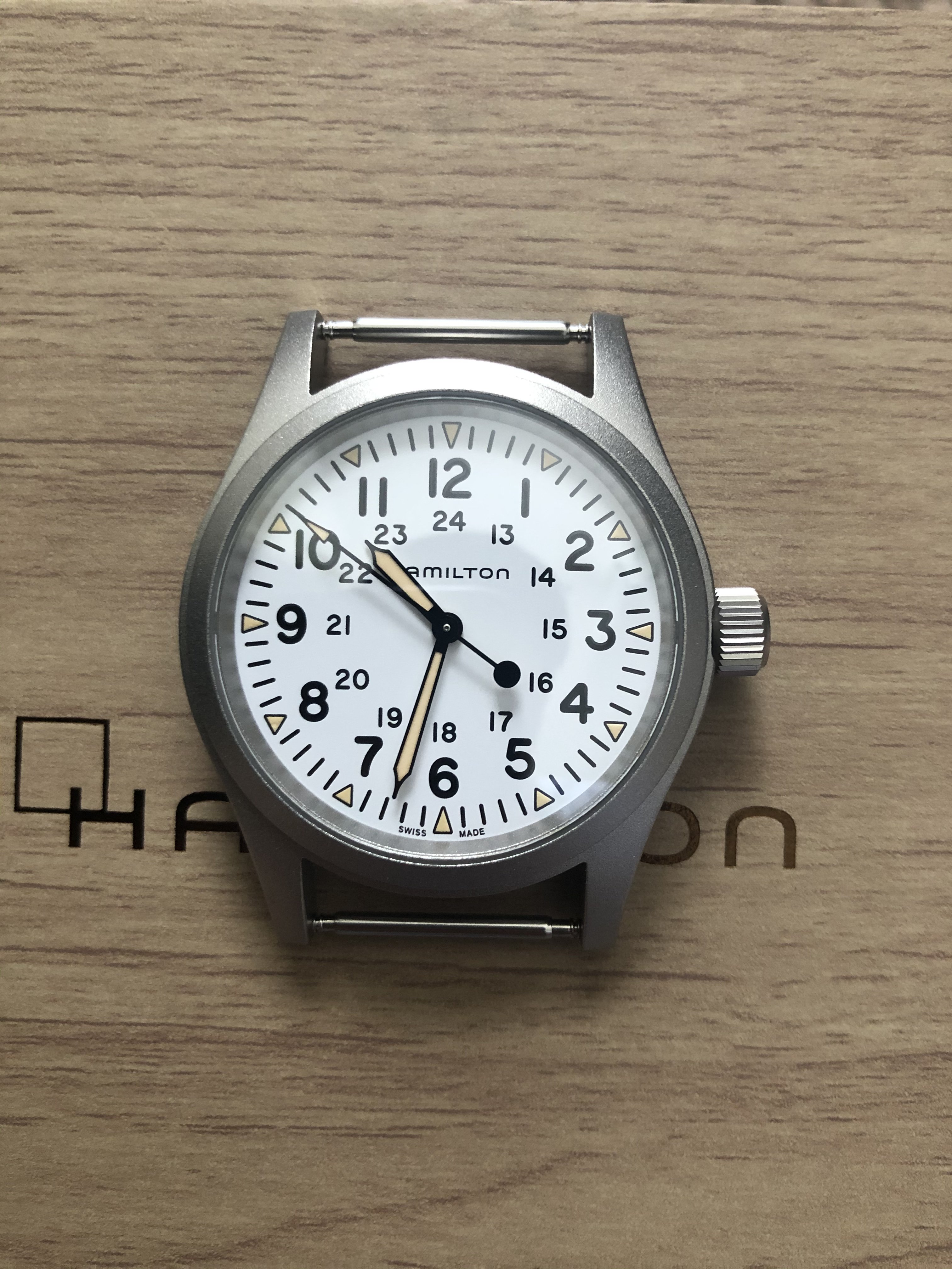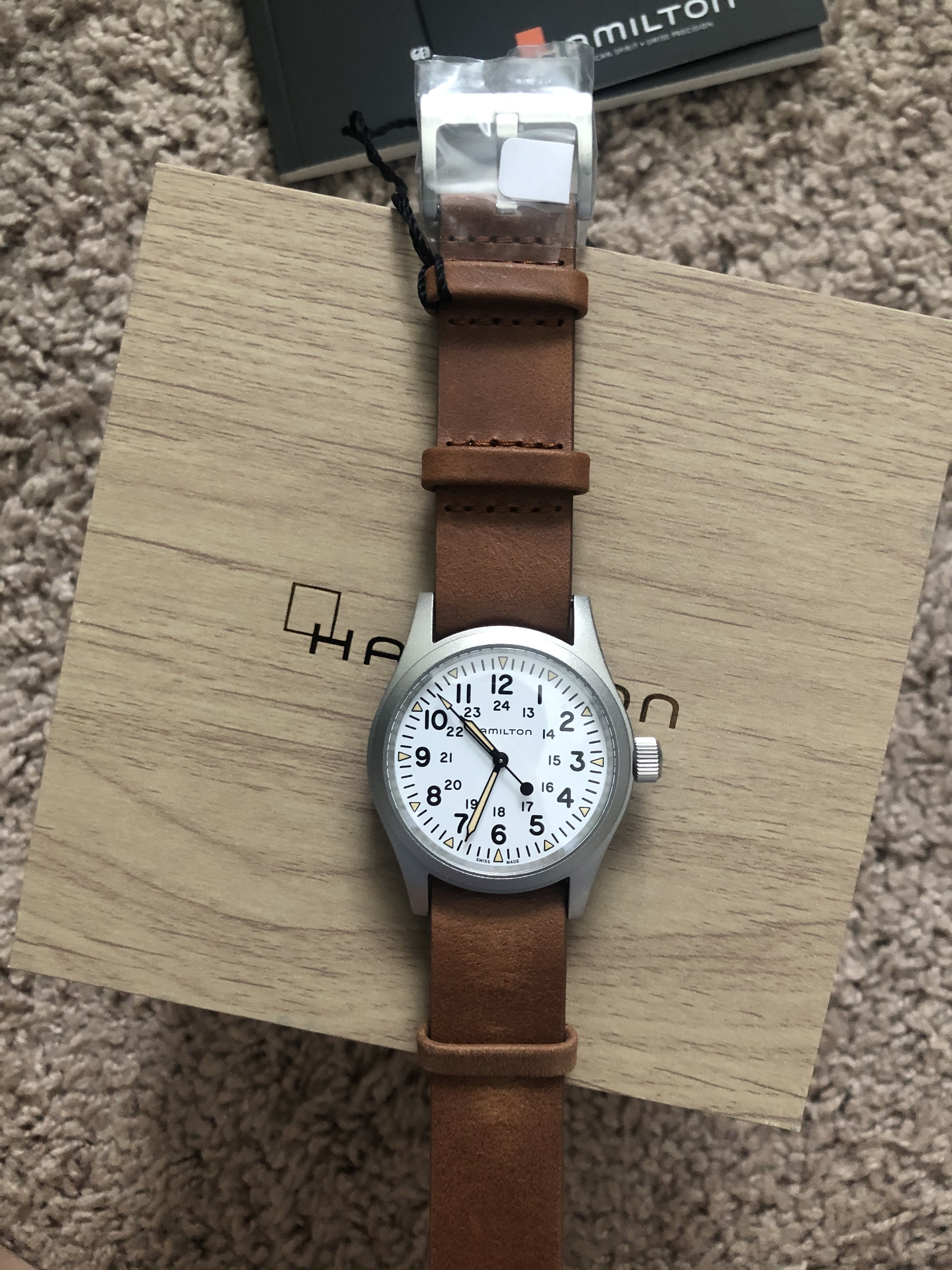 Back with another post trying to cut back on my collection size. Brand new, hand-wound Hamilton Khaki Field Mechanical in the white dial with leather NATO. Bought this one and the black dial to see which one I liked more in person, and the black variation won out.