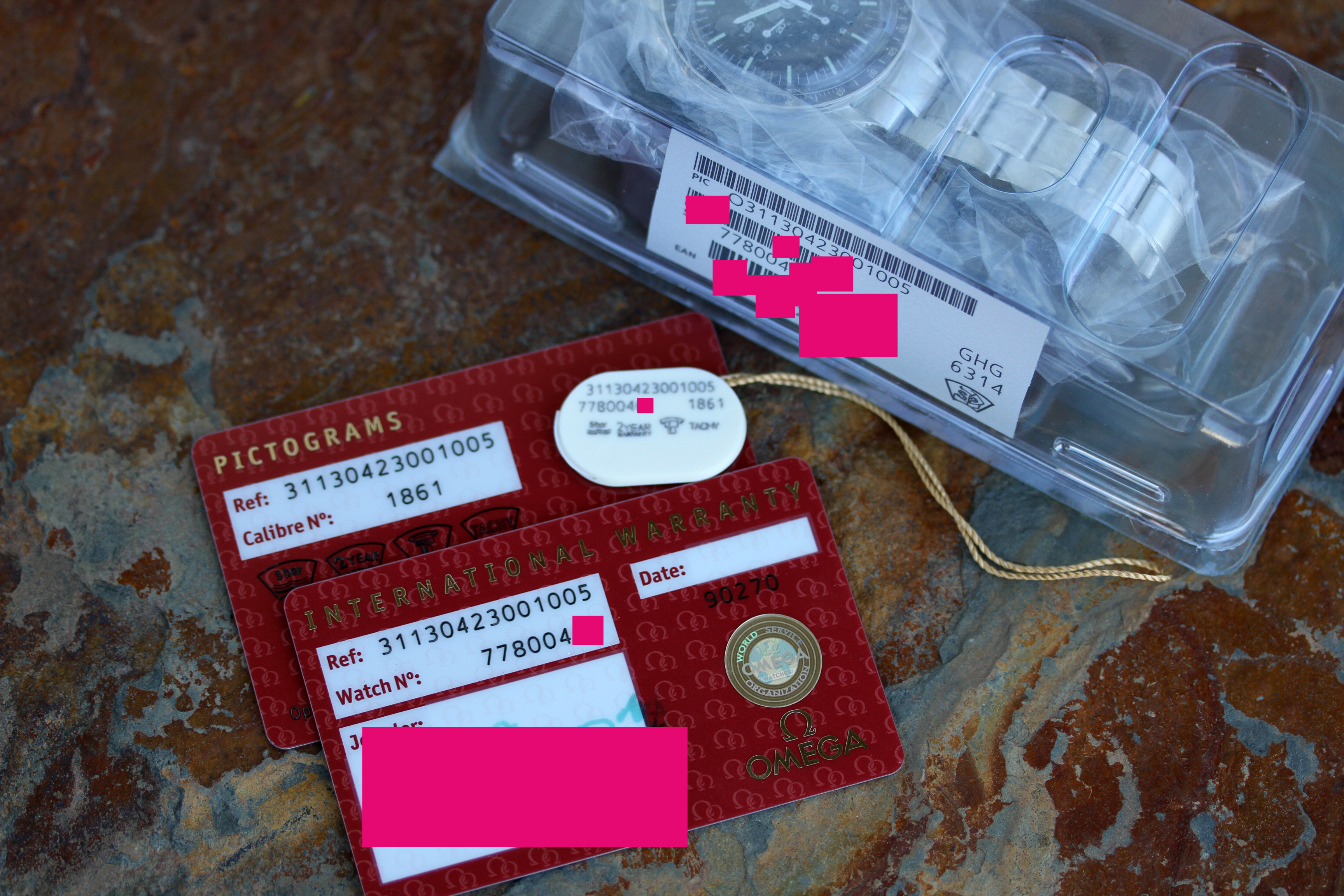 new reference 311.30.42.30.01.005 with cal. 1861, updated bracelet, and large presentation box with Omega tool, straps, loupe, medallion.