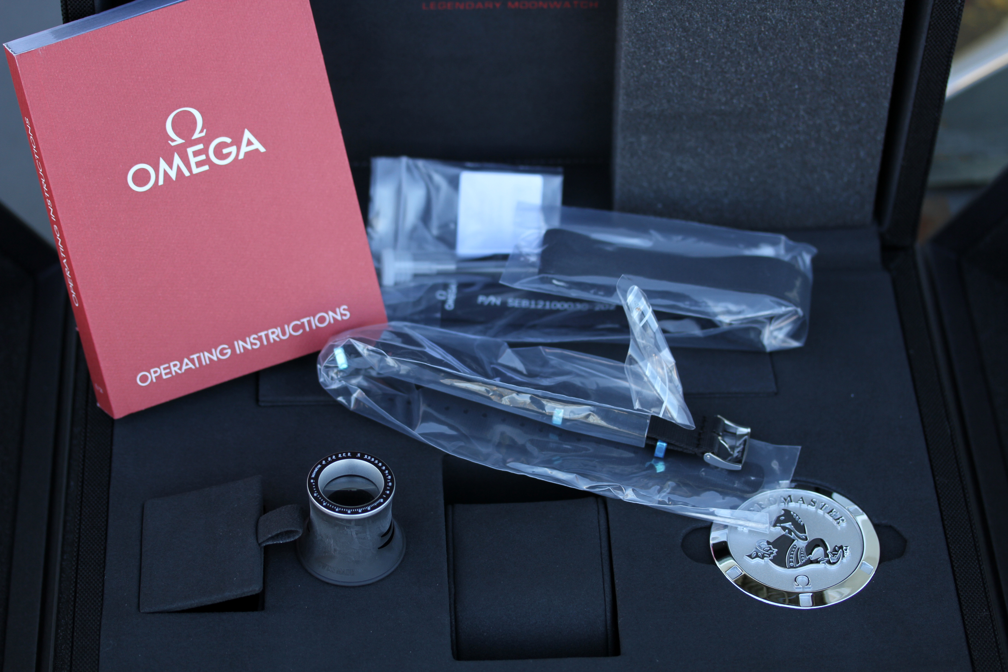 Comes with Omega presentation boxes, original shipping Omega coffin, manual, cards, hang tag, unworn and sealed Omega NATO straps, pushpins, loupe, strap changing tool, medallion, etc.