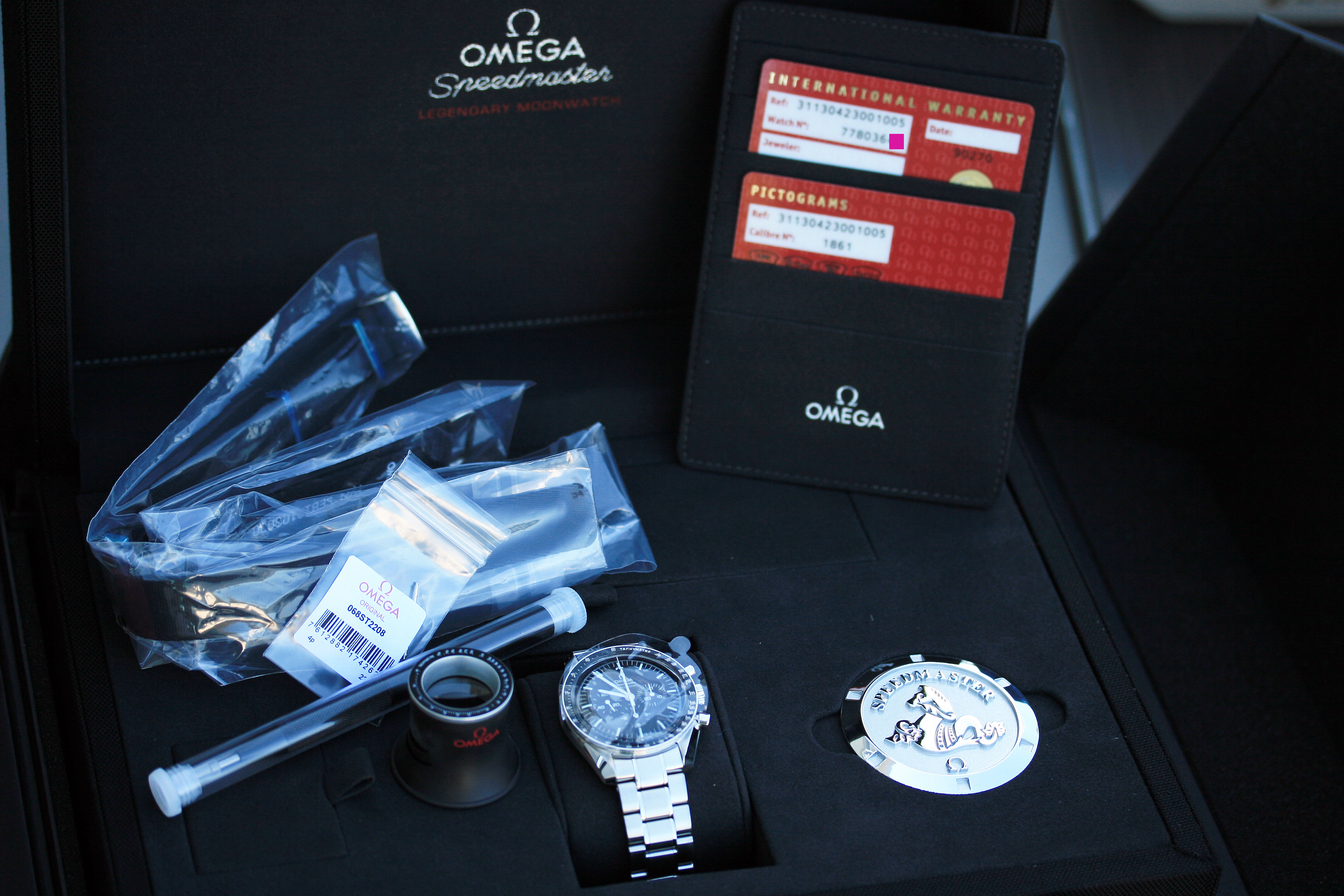 Comes with Omega presentation boxes, manual, cards, hang tag, unworn and sealed Omega NATO straps, pushpins, loupe, strap changing tool, medallion, etc.