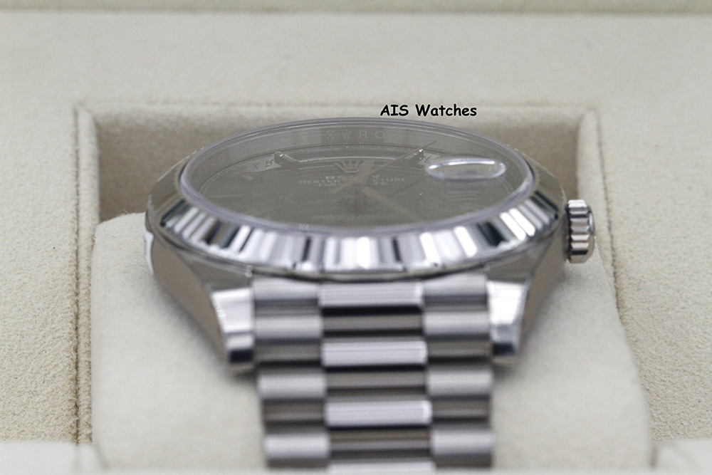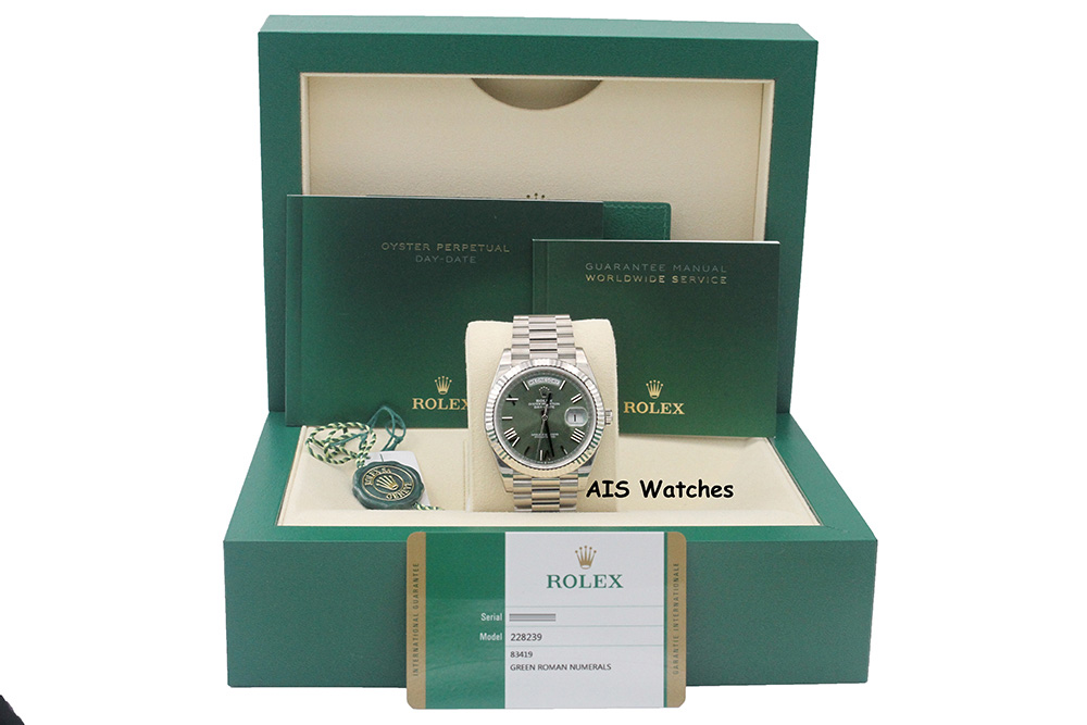 Up for sale is a BNIB Rolex 228239 DayDate 40MM DD40 White Gold Green Roman Dial Box & Papers - Sealed. Unworn / Unsized / Stickers Intact.