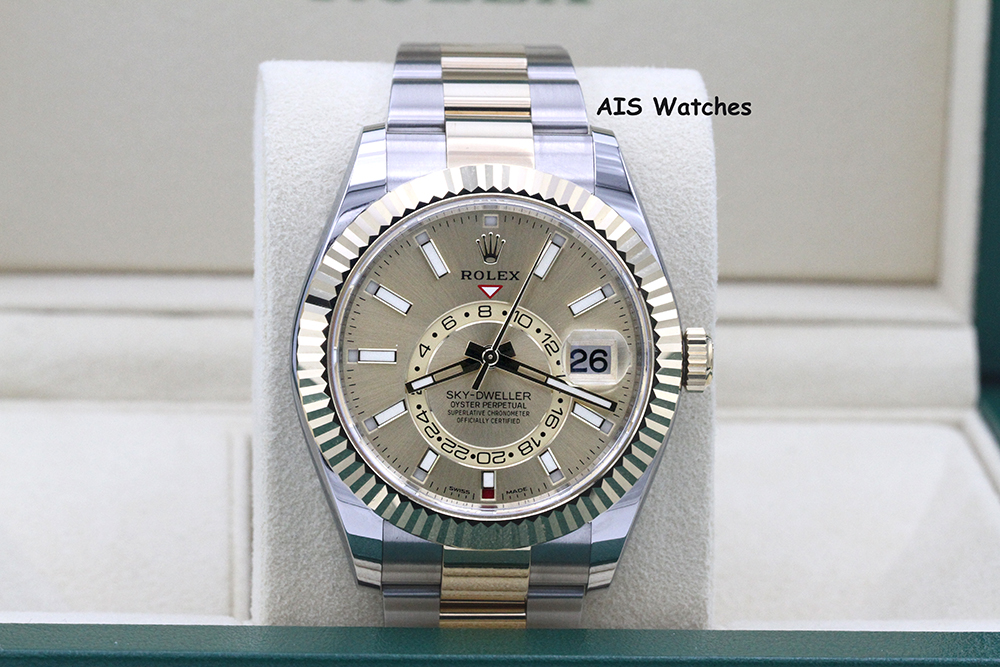 Up for sale is a BNIB Rolex 326933 Sky-Dweller 18K Yellow Gold / SS Oyster Champagne Dial B&P. The timepiece is Brand New / Unworn / Unsized / AD took stickers off.
