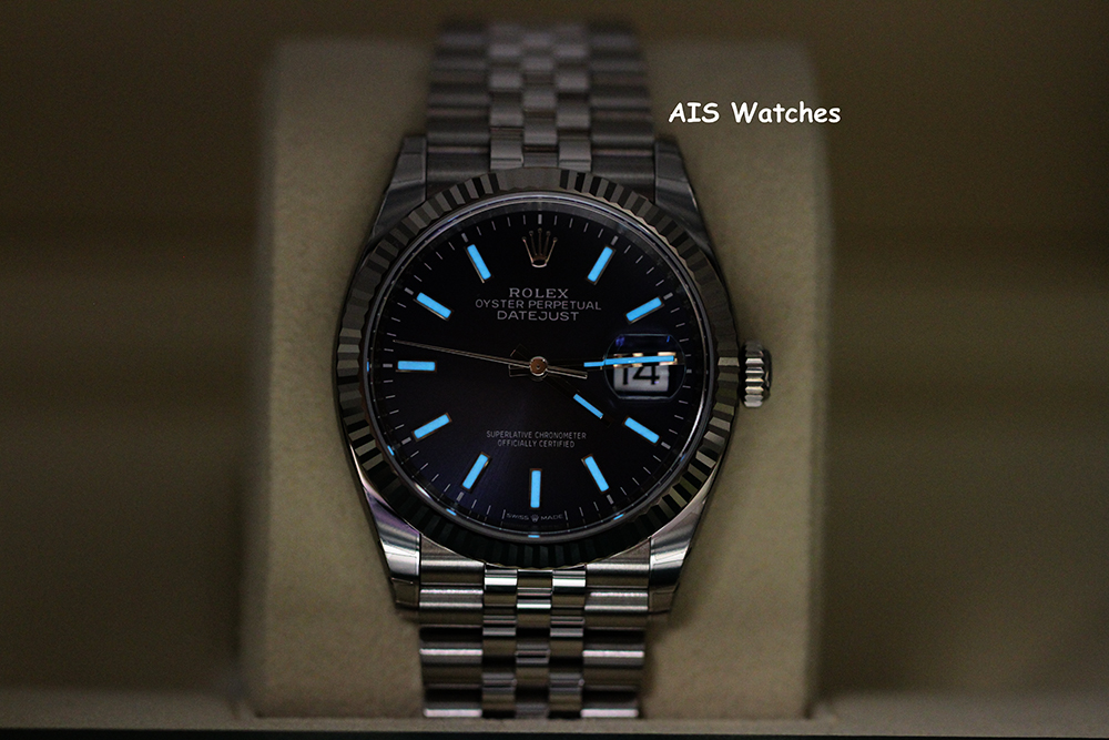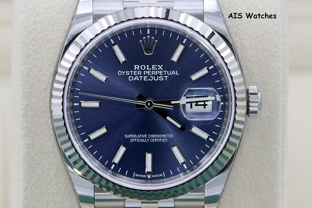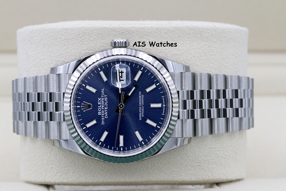 Up for sale is this Classic BNIB Rolex Datejust 36 MM 126234 on Jubilee Bracelet / Blue Stick Dial Stainless Steel / 18K WG Fluted Bezel Box & Papers - SEALED. The timepiece Unworn / Unsized / Stickers Intact.