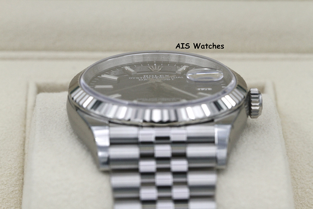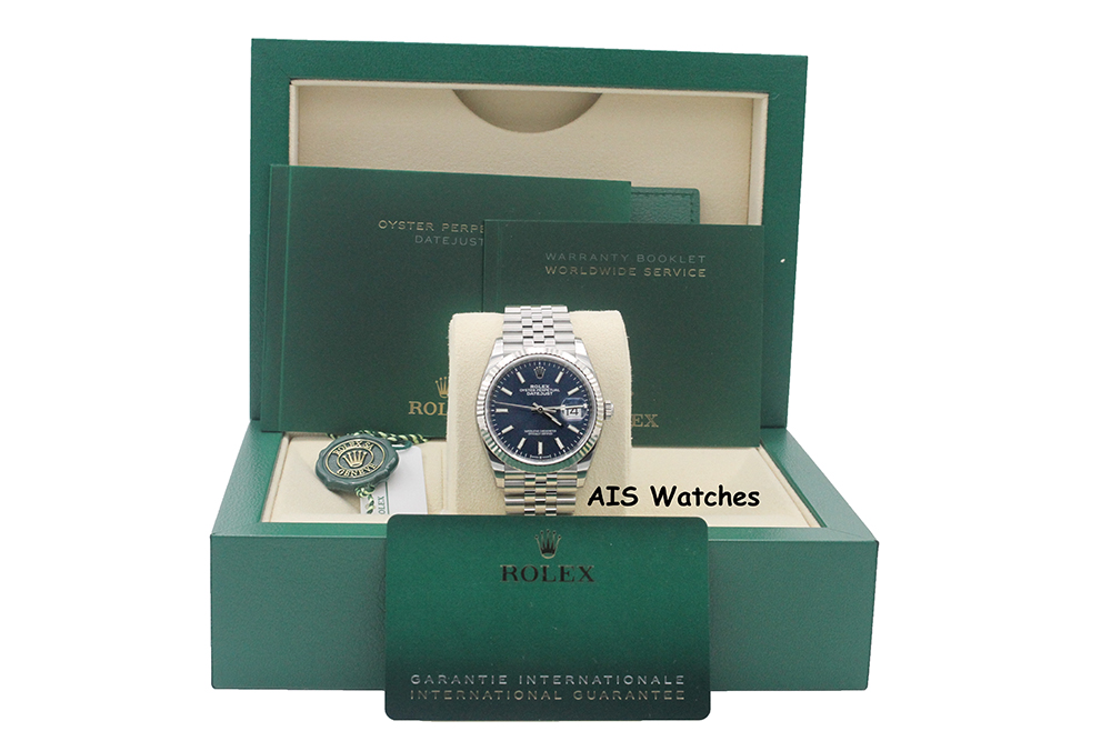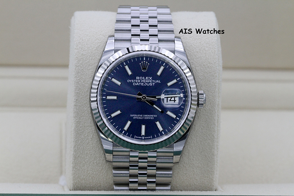 Up for sale is this Classic BNIB Rolex Datejust 36 MM 126234 on Jubilee Bracelet / Blue Stick Dial Stainless Steel / 18K WG Fluted Bezel Box & Papers - SEALED. The timepiece Unworn / Unsized / Stickers Intact.
