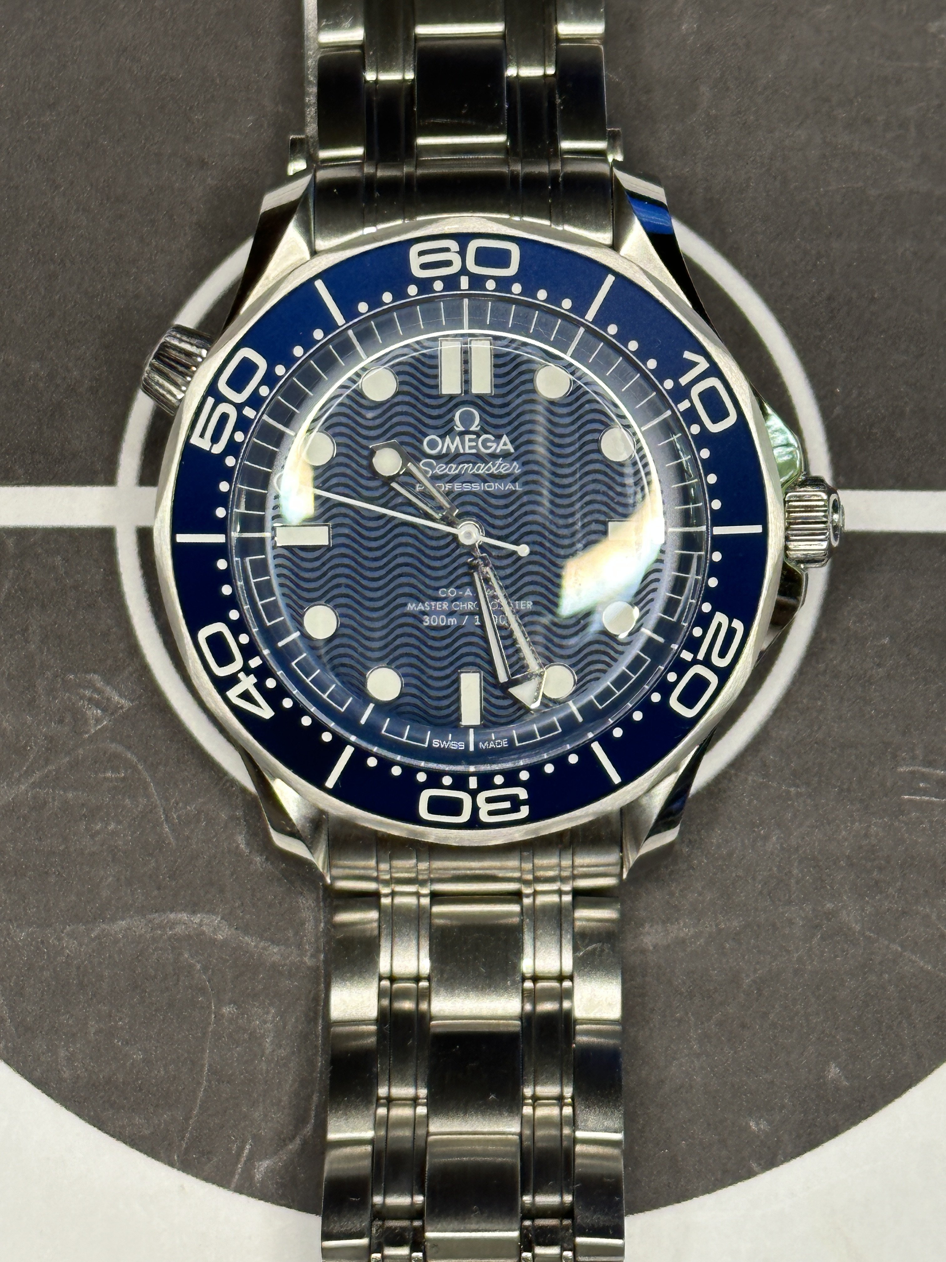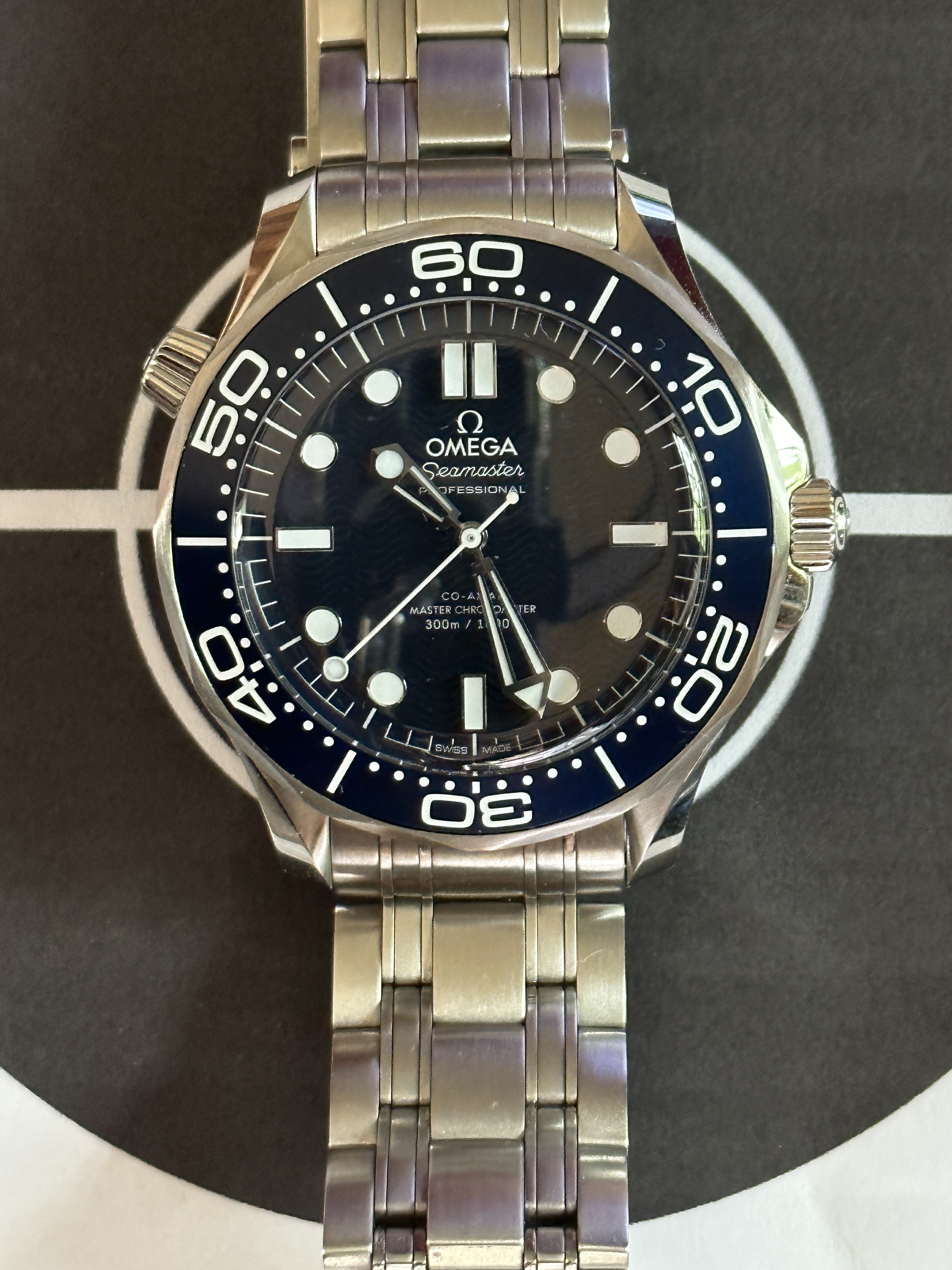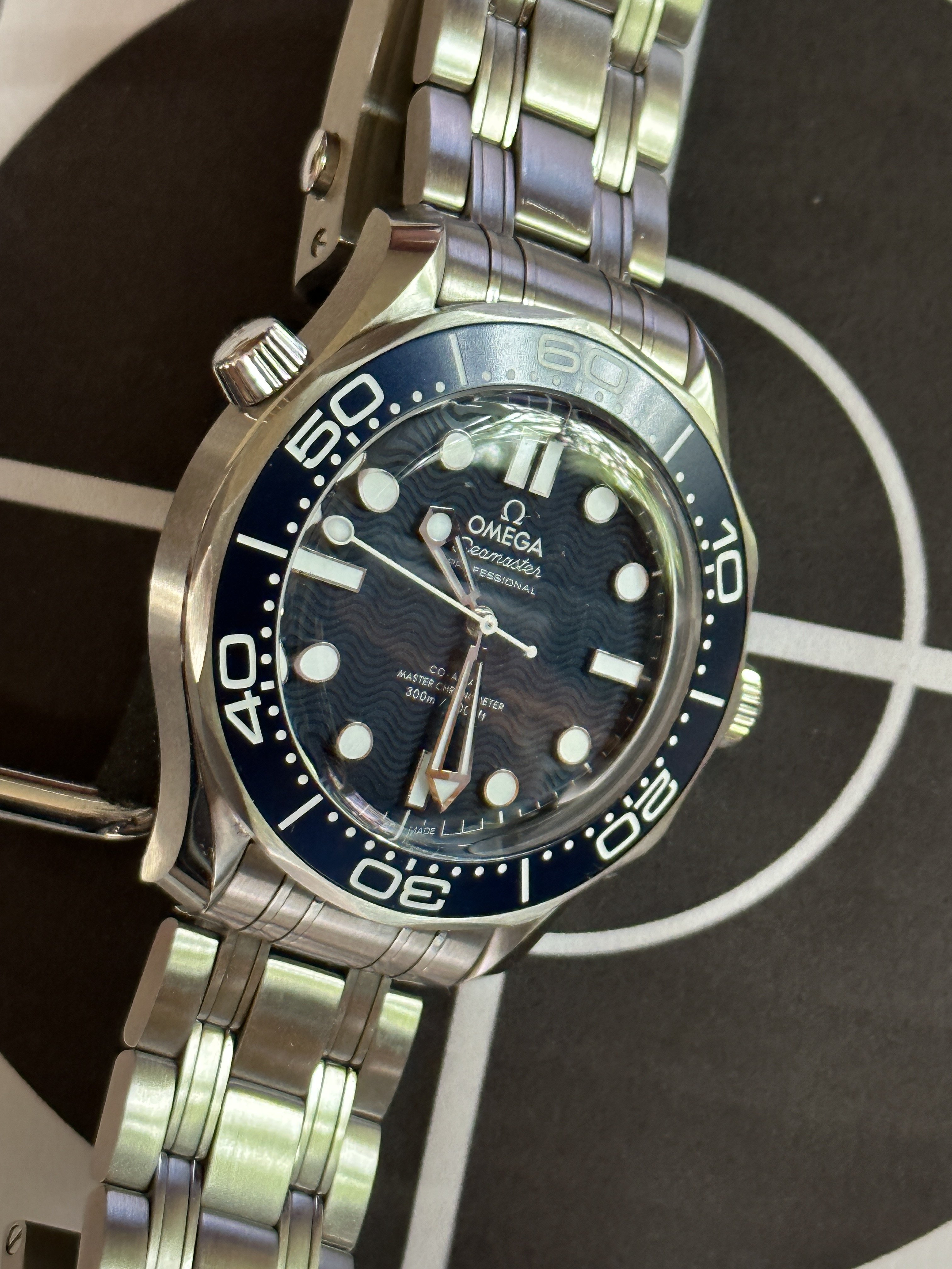 路I called my AD to reserve this in November. Nada! Finally went to the secondary market - didn't want to wait any longer . First thing I did was to remove that stiff (ass Brit) mesh bracelet and replace it with a standard 8800 bracelet. I love the old school blue on this. (I DID purchase the shorter mesh bracelet, but it isn't any better. That clasp is bent at such a goofy angle, it just doesn't feel right.)