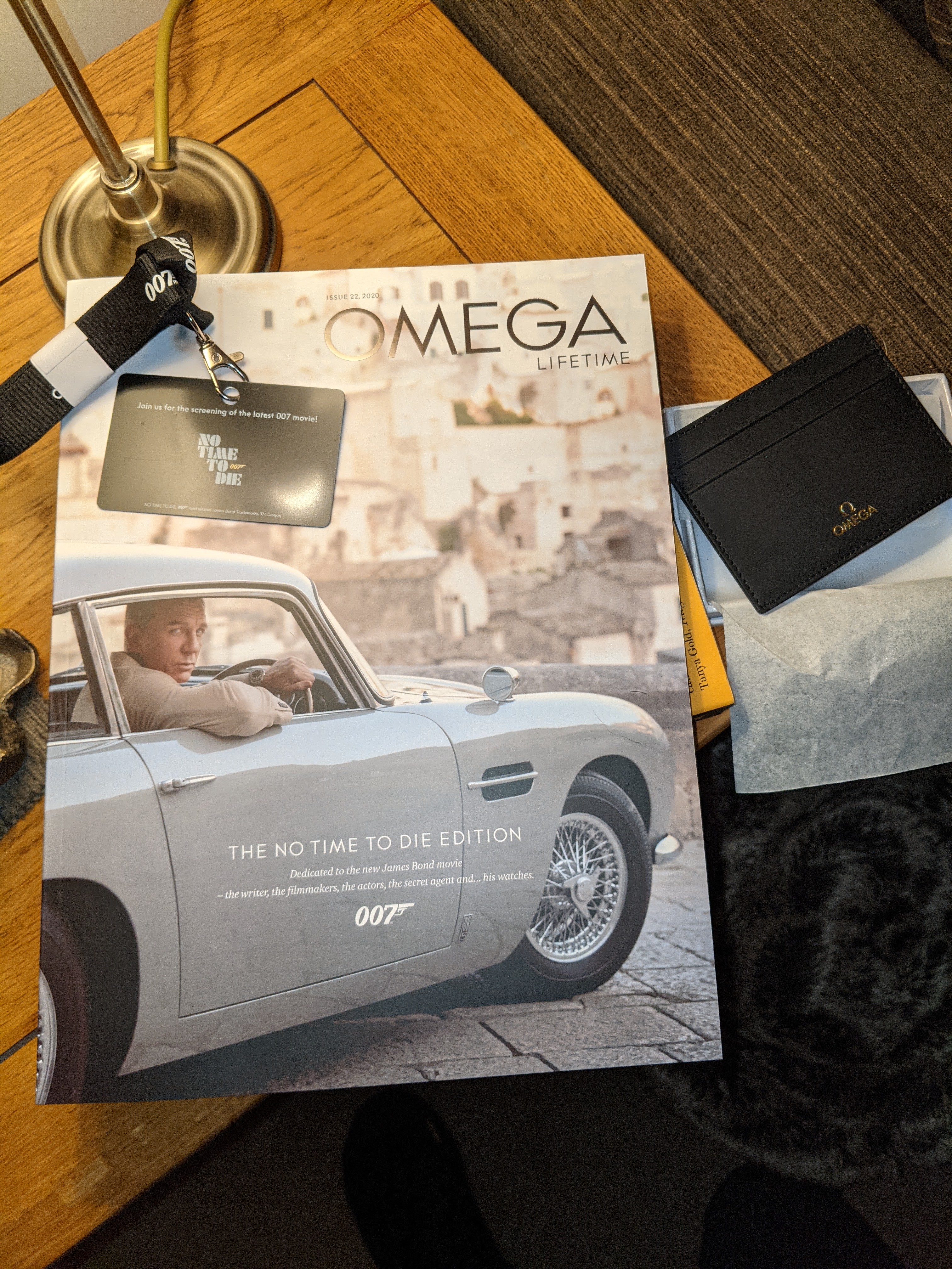 Goodies from tonight's event. Lovely venue and free bar and food too. Film excellent as I expected having already seen it. No keyring buy a card wallet. Omega magazine and lanyard with Bond branded plastic card. The magazine looks a great read so looking forward to that. We got two bags so might get rid of one somehow.