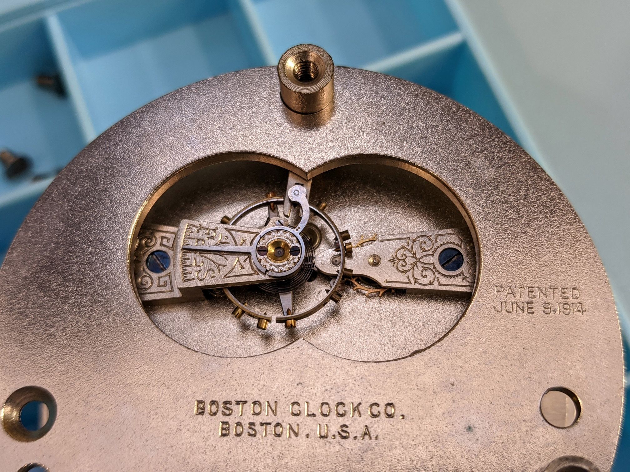 1914 Pat. Stamp, although by this era I think the Boston Clock Co had been folded into the Chelsea Clock Co.