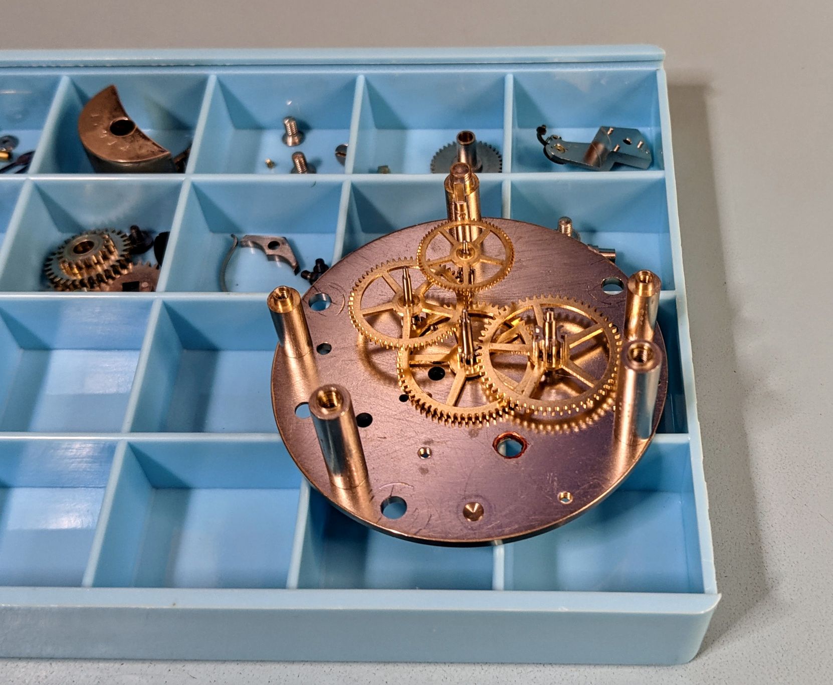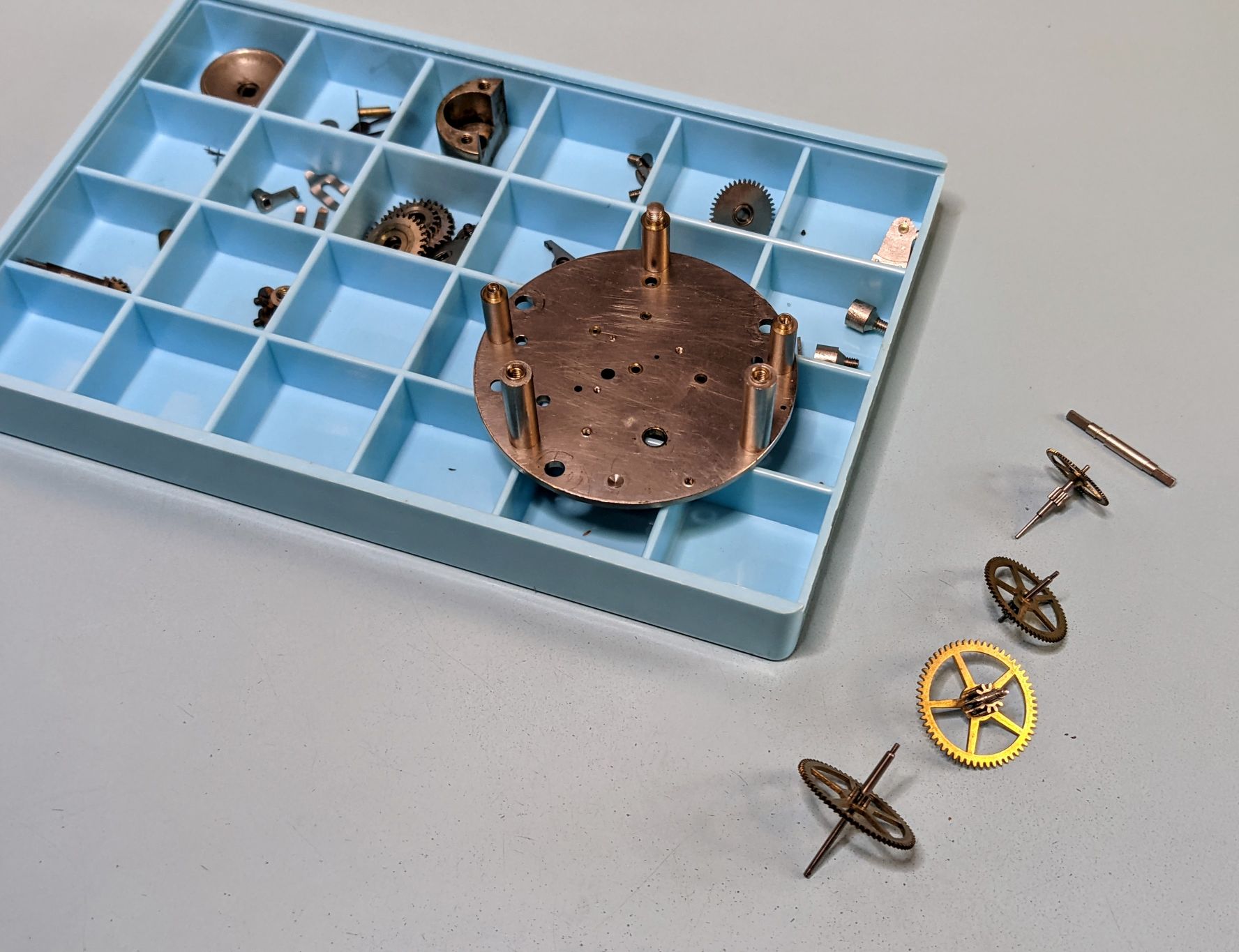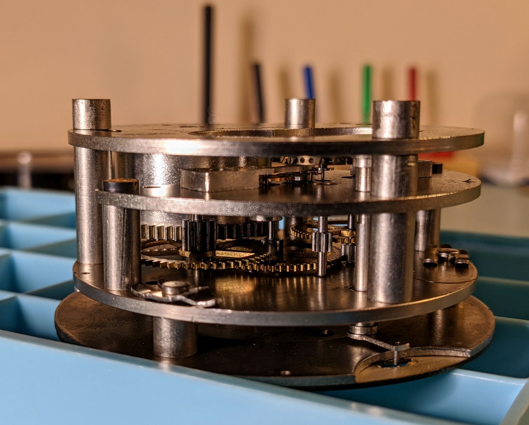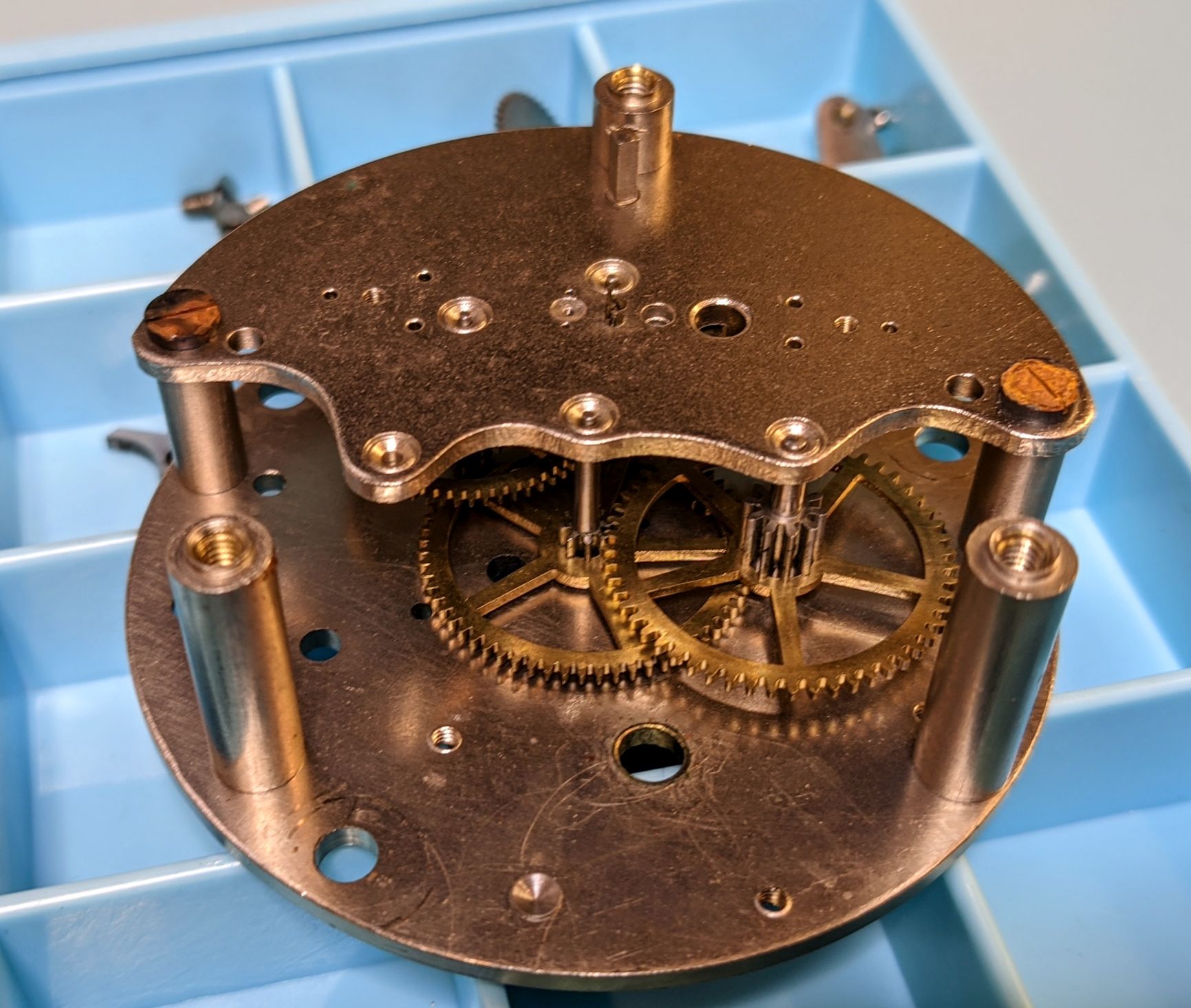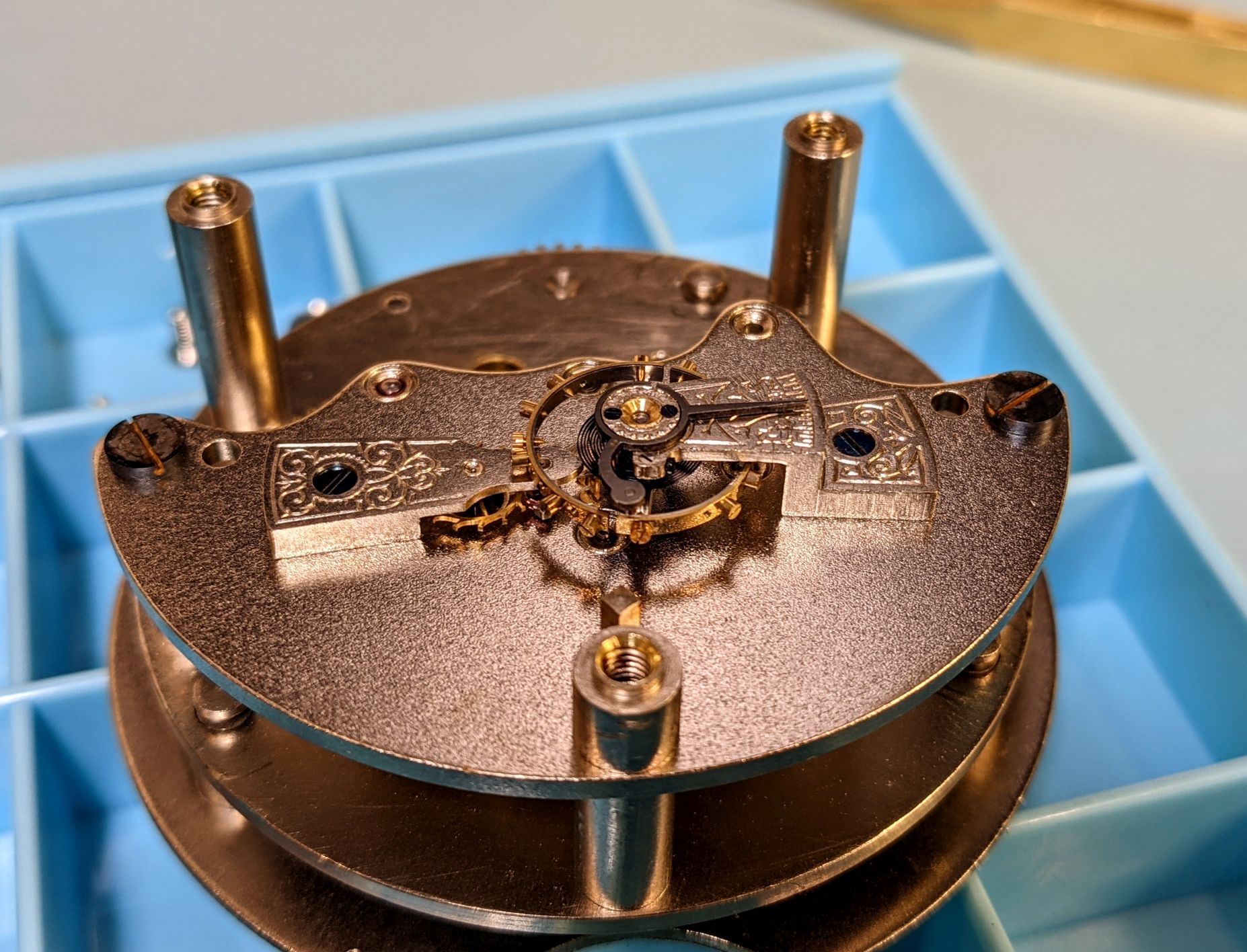 First time working on a clock. I don't have a movement holder near large enough, so the movement is set on top of the parts tray to give clearance for the hands pinions on the other side.