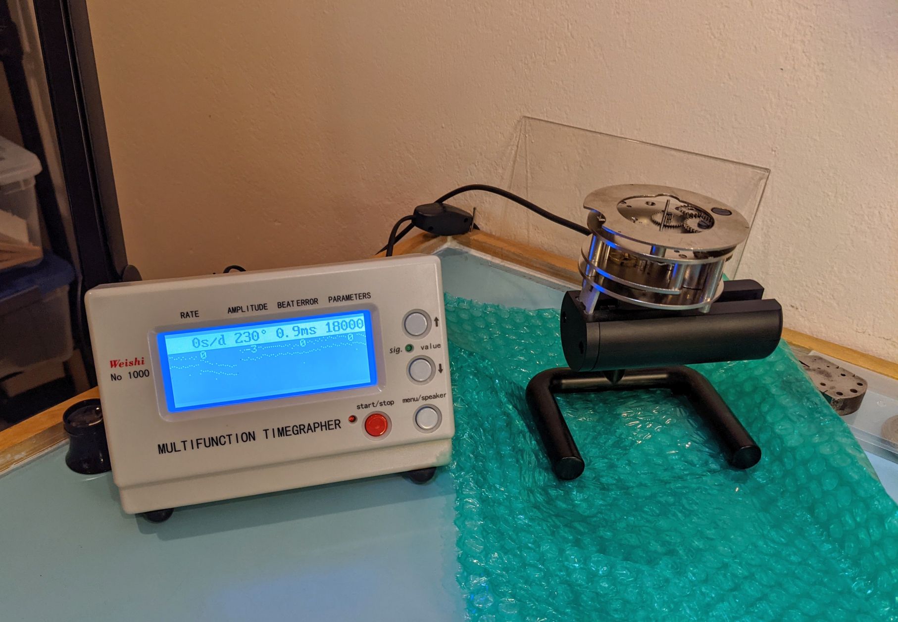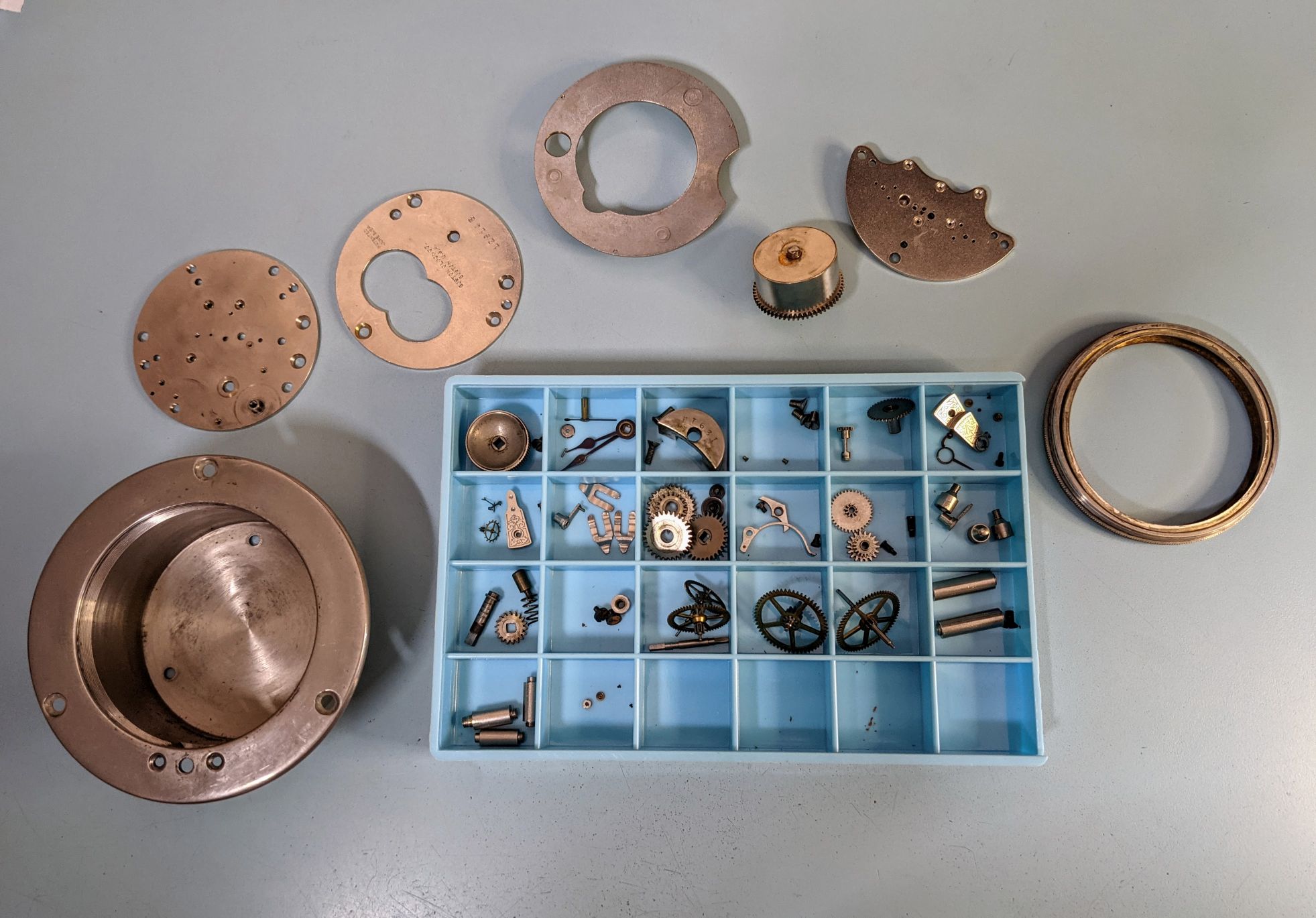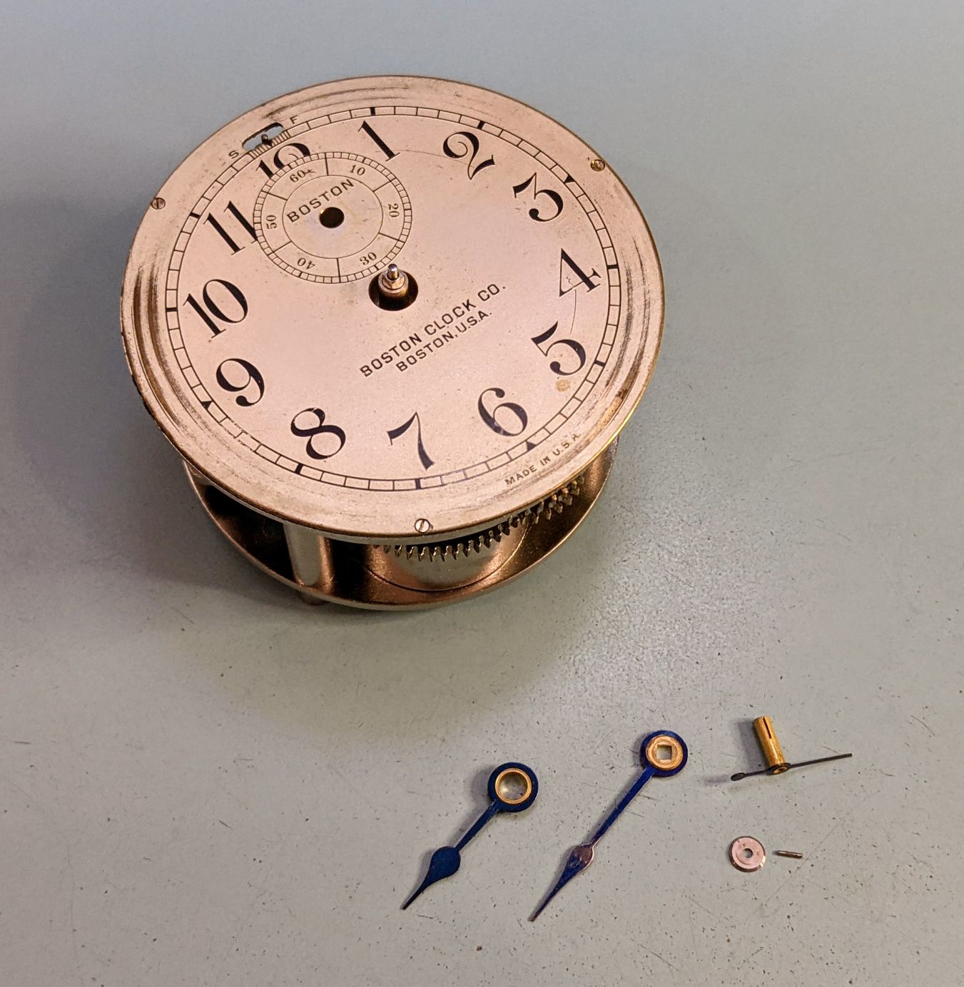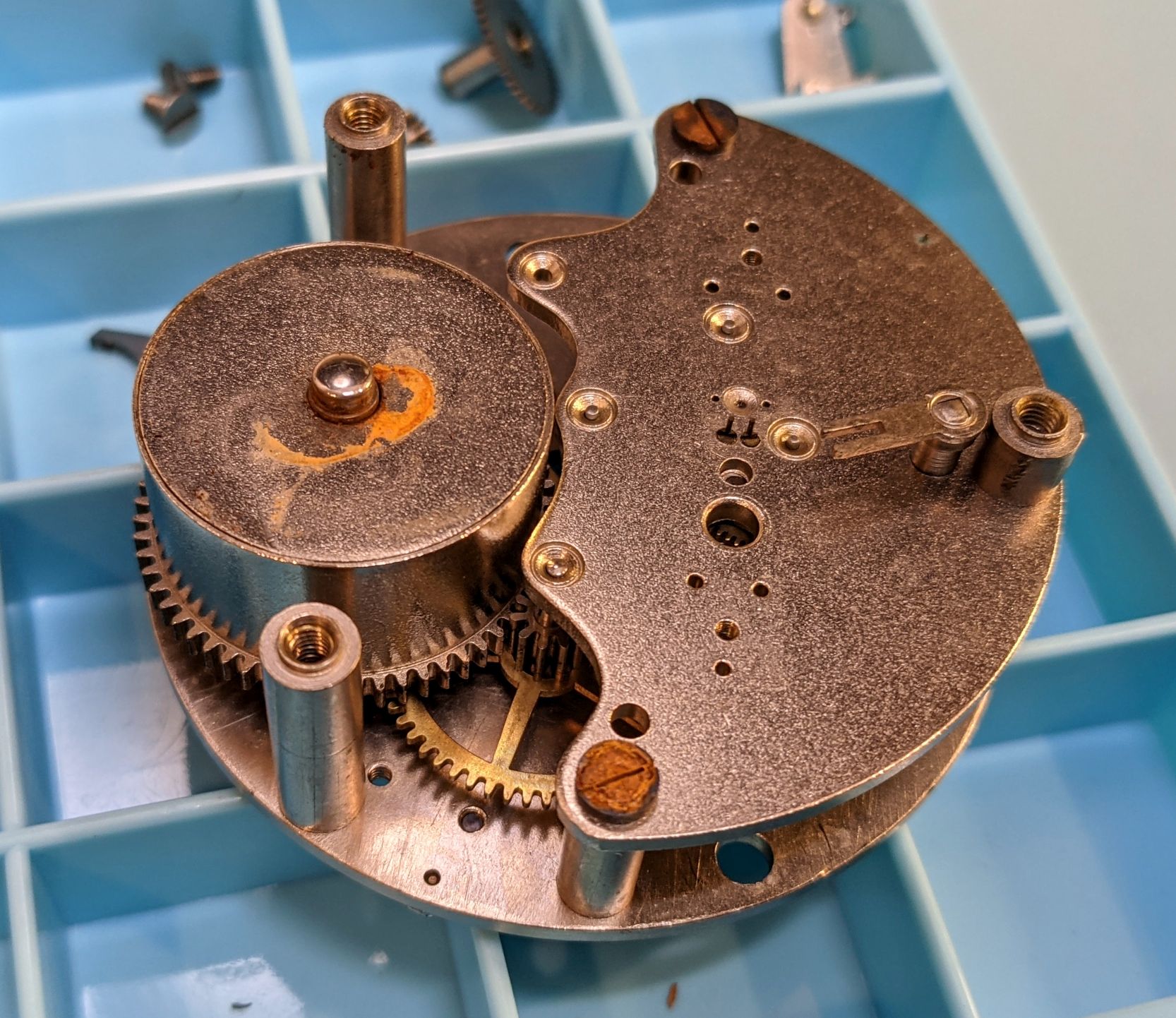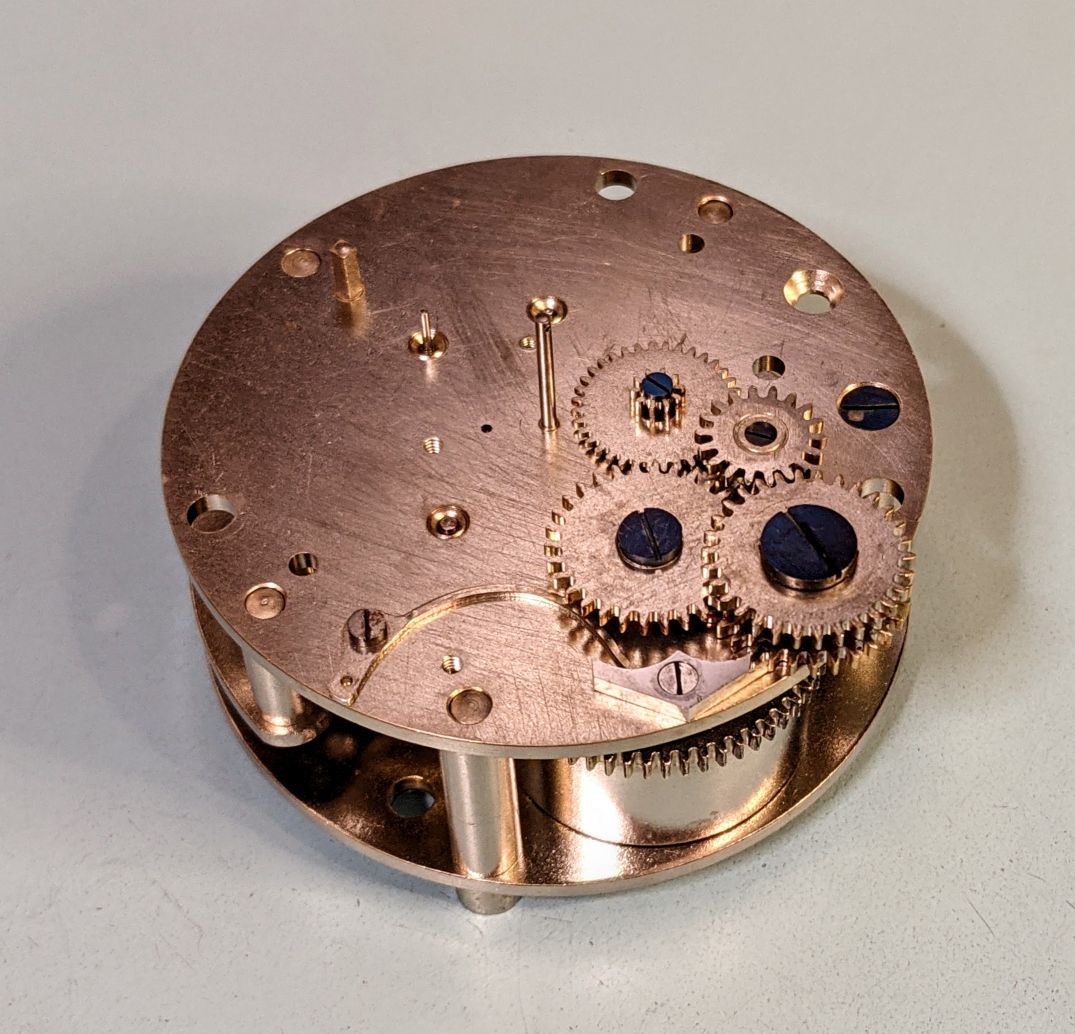 First time working on a clock. I don't have a movement holder near large enough, so the movement is set on top of the parts tray to give clearance for the hands pinions on the other side.