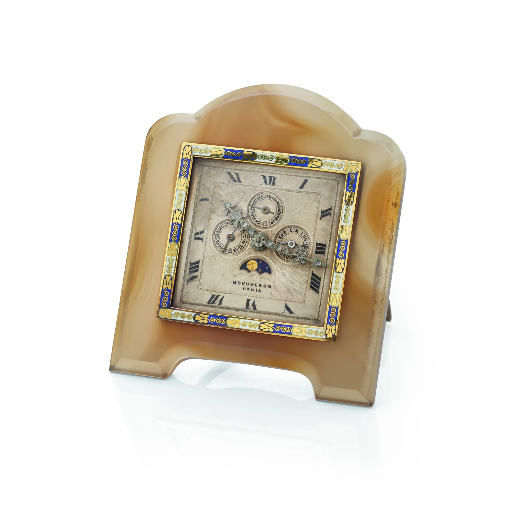 I am mostly interested in the watch dial material it is made from, historical facts of a Boucheron table clocks, relations to the Cartier and anything worth commenting