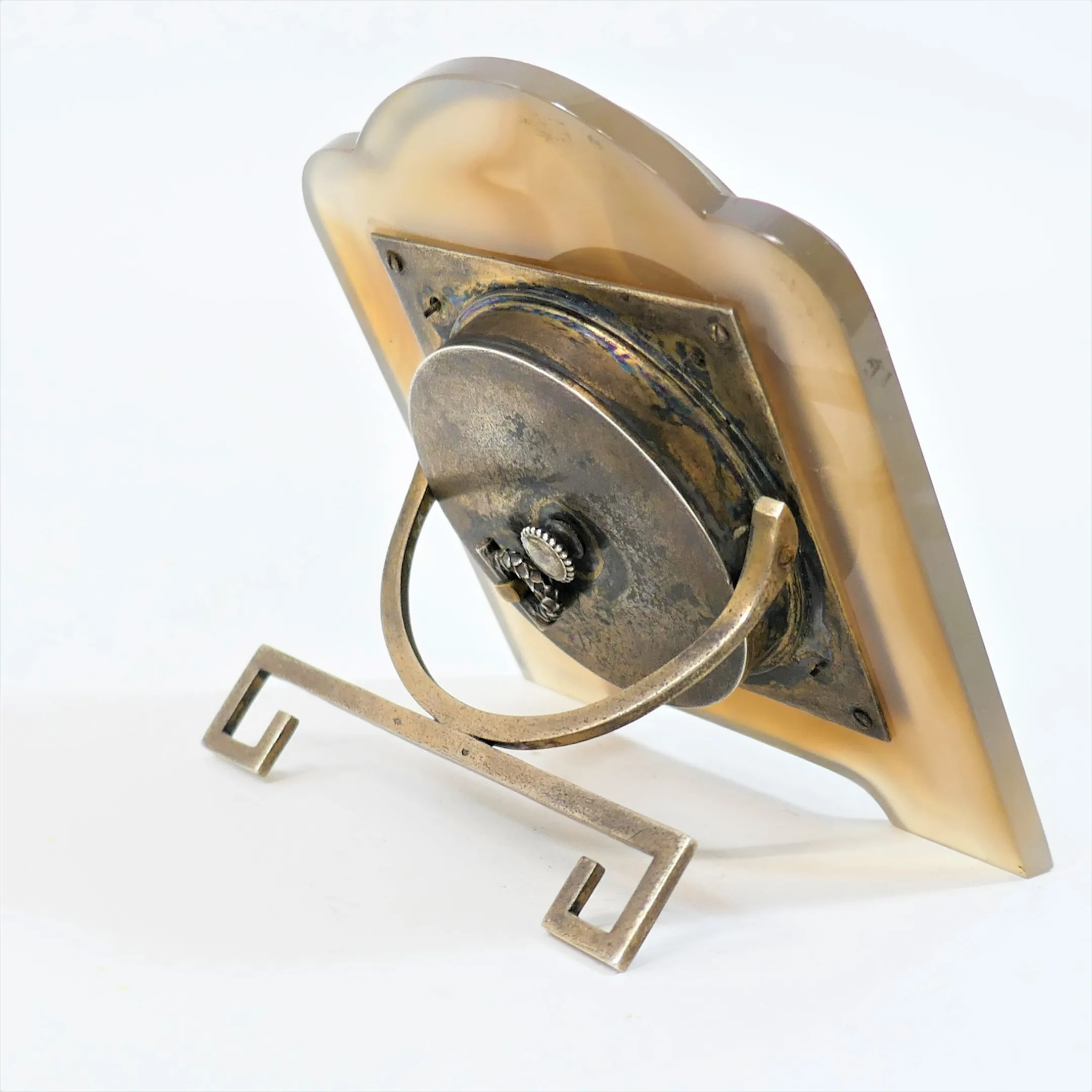 Based on my findings, it is a "pendulette", a table clock encapsulated in the Agate stone, framed in a golden rectangular frame inlaid with the filigree enamelled details. The engine turned dial is absolutely mesmerizing, full of intricate details. My guess is, that the hands are made of white gold or platinum, hour and minute hands set with rose-cut diamonds. Moonphase disc is sort of icing on the cake, balancing the aesthetics of the clock face brilliantly.