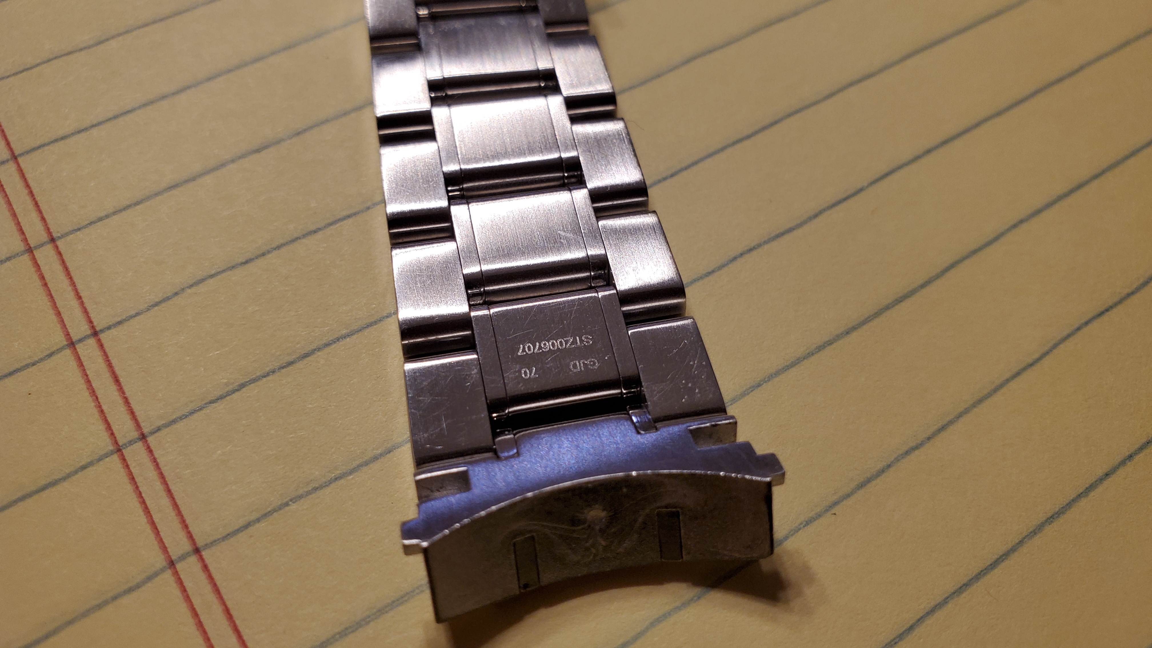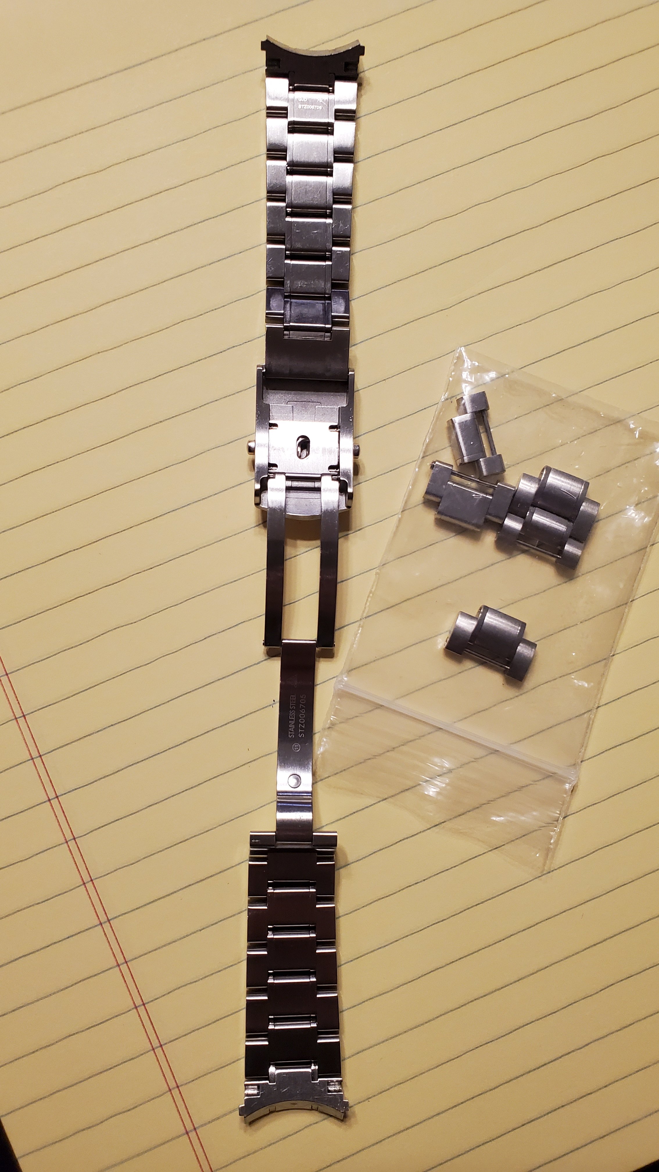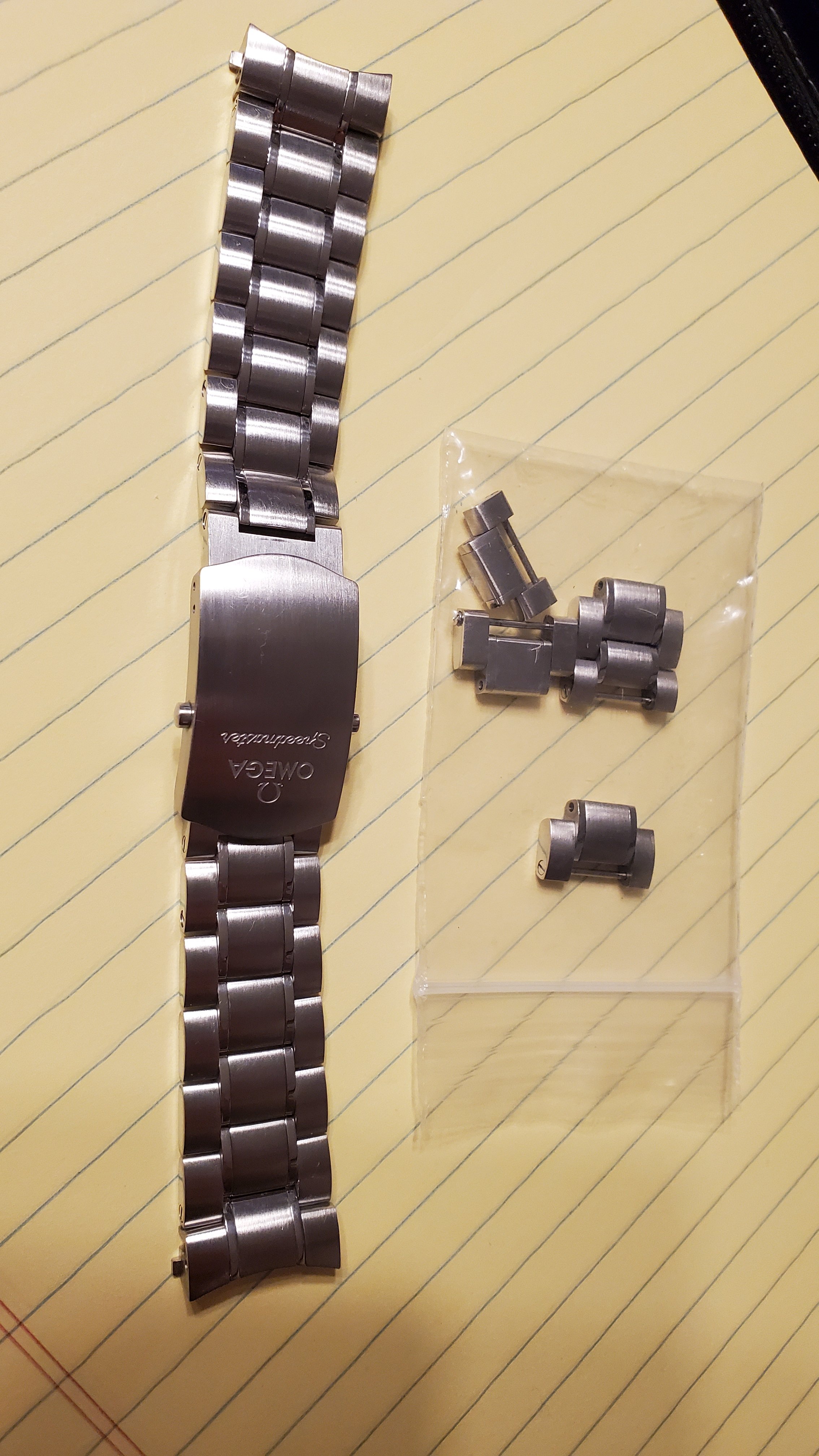 The seller included a 19mm Omega bracelet that I believe is from the racing series. It is is marked STZ006705, STZ006706, and STZ006707 on the clasp and second link from endlinks.