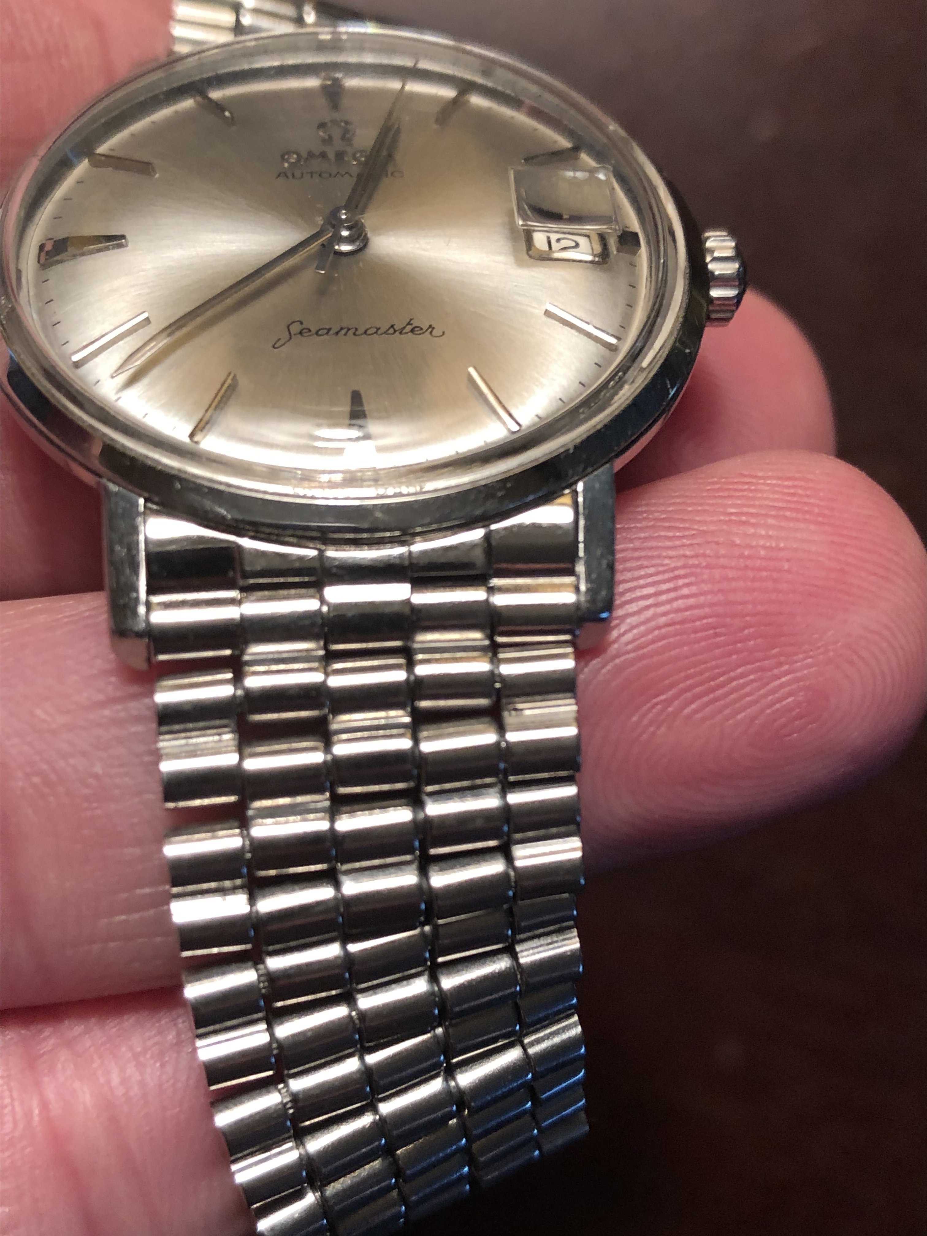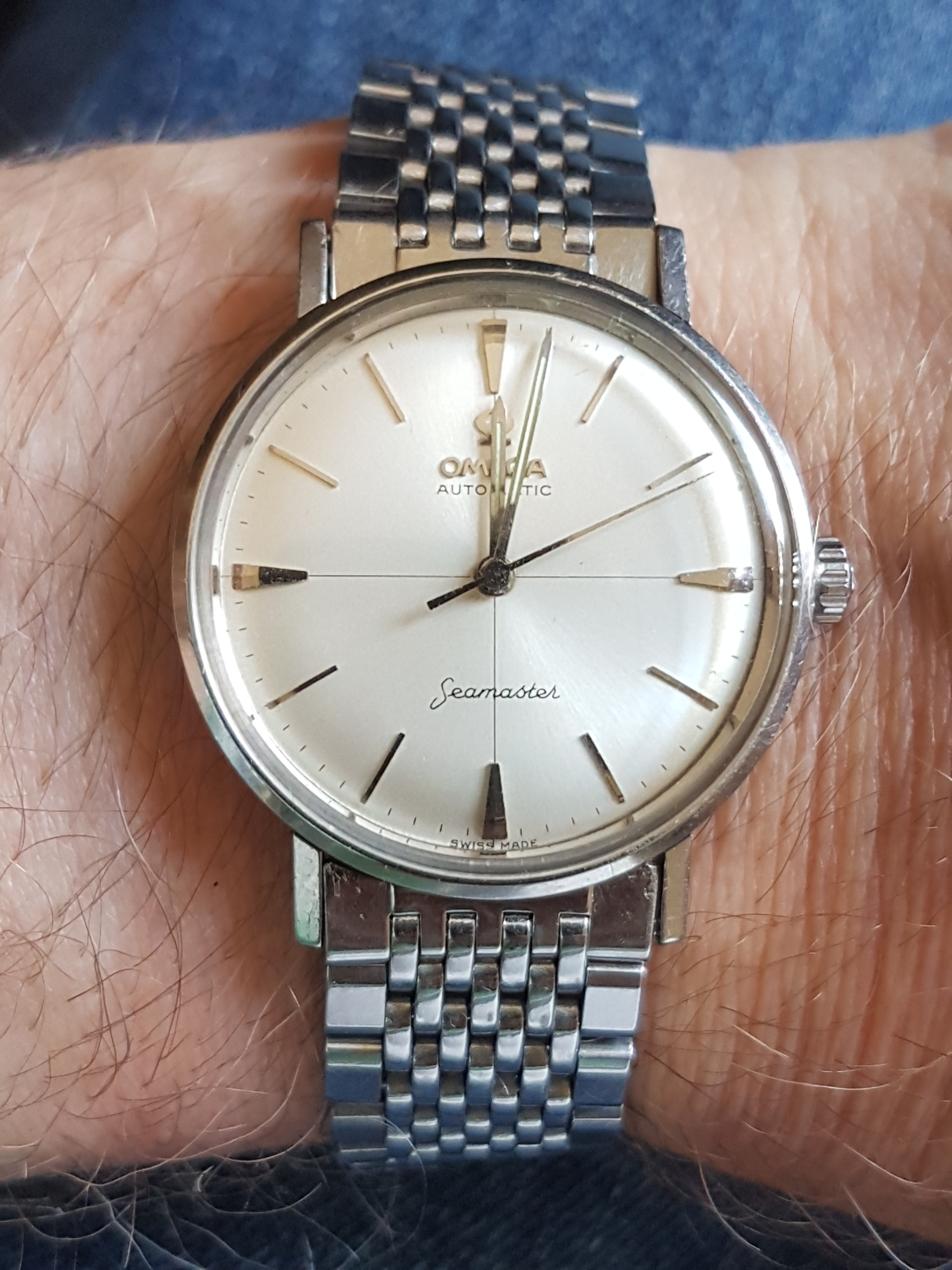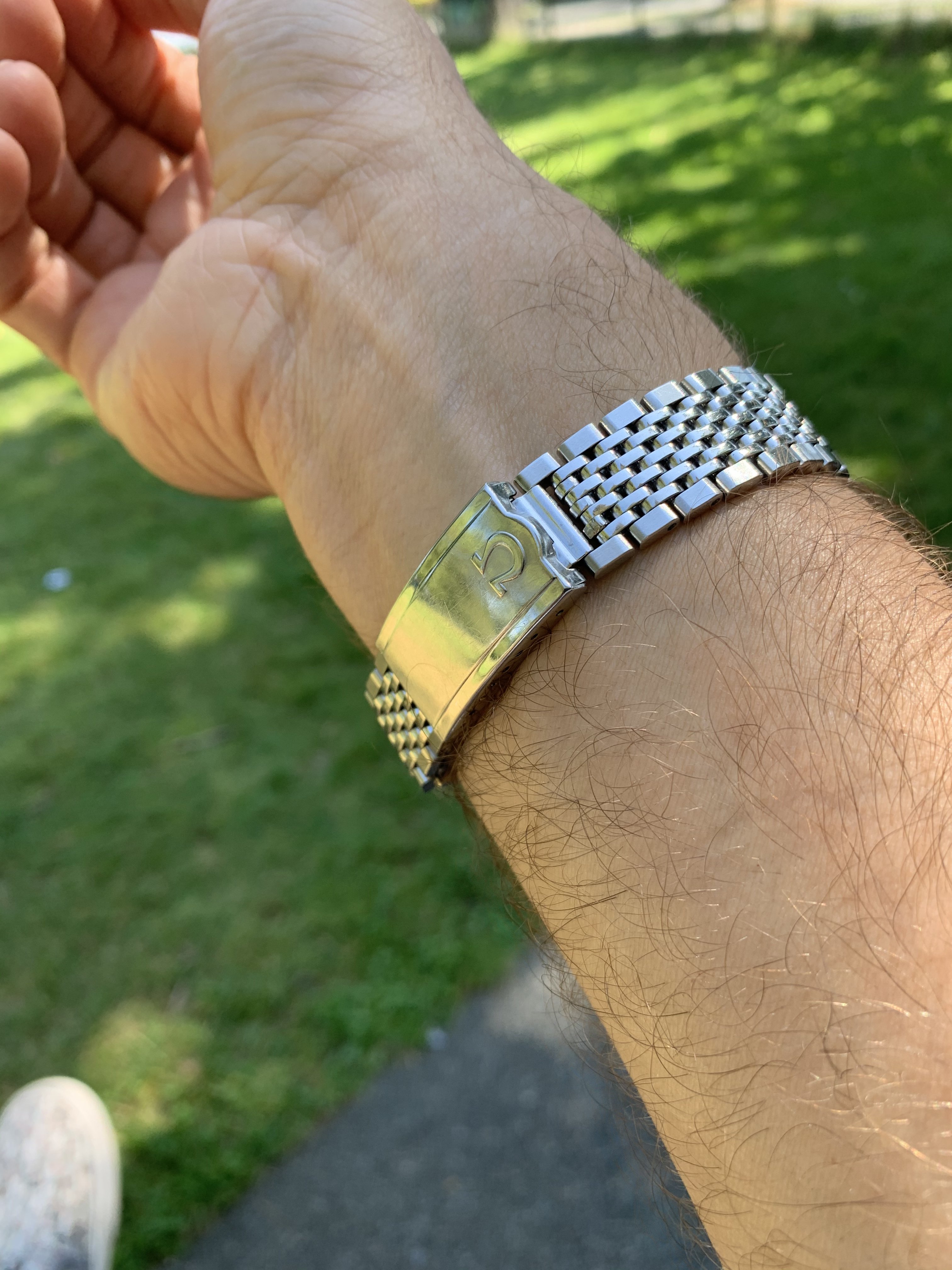 So, after what must have been 10,000km+ in travel (8000 of which were seemingly unnecessary) and six weeks in postal service black sites, here is my ‘61 Seamaster 14765-2SC (18mm) happily paired with an unnumbered (but equivalent to a 1037) Omega 7 row BOR with 570 end links.