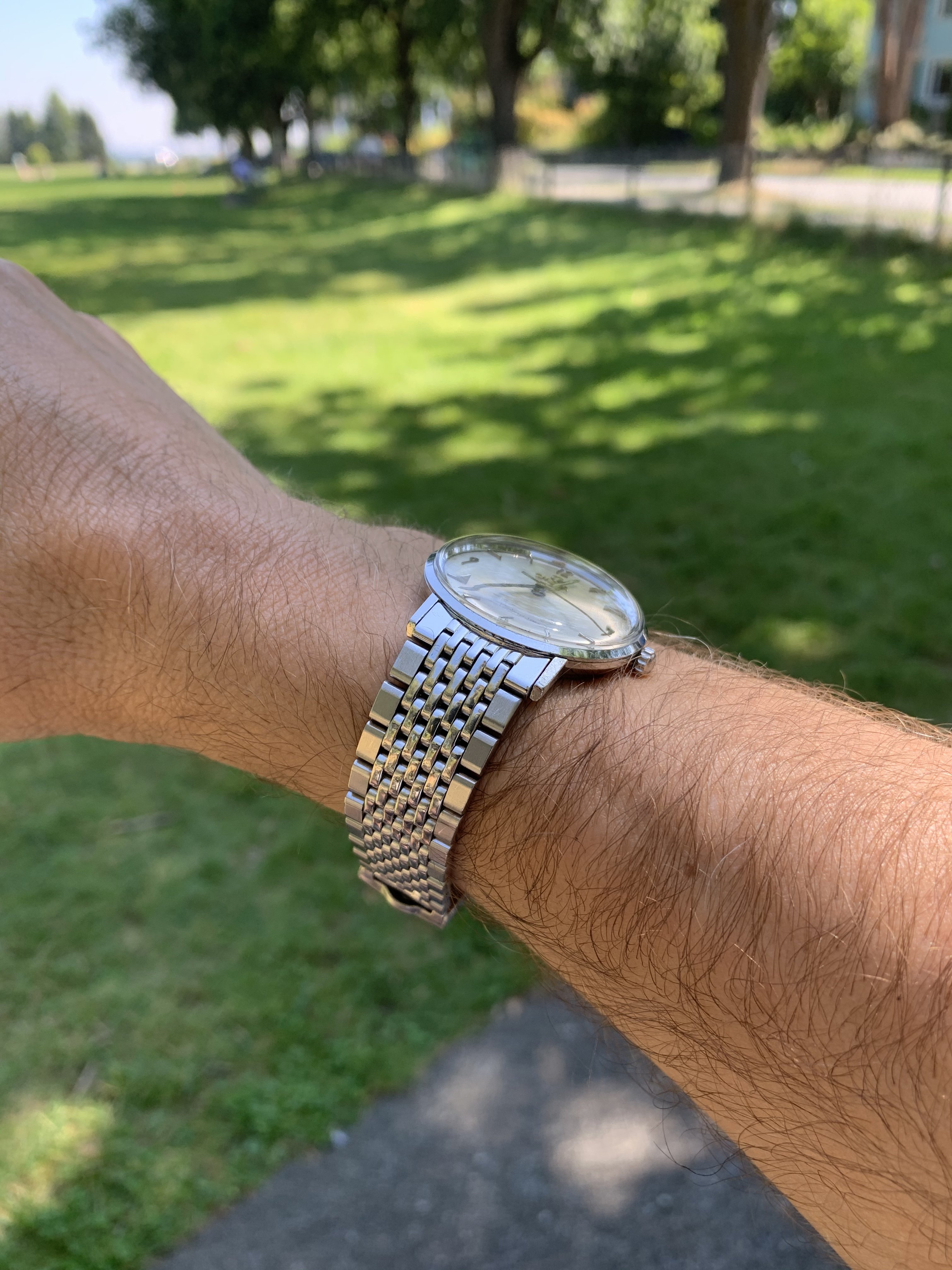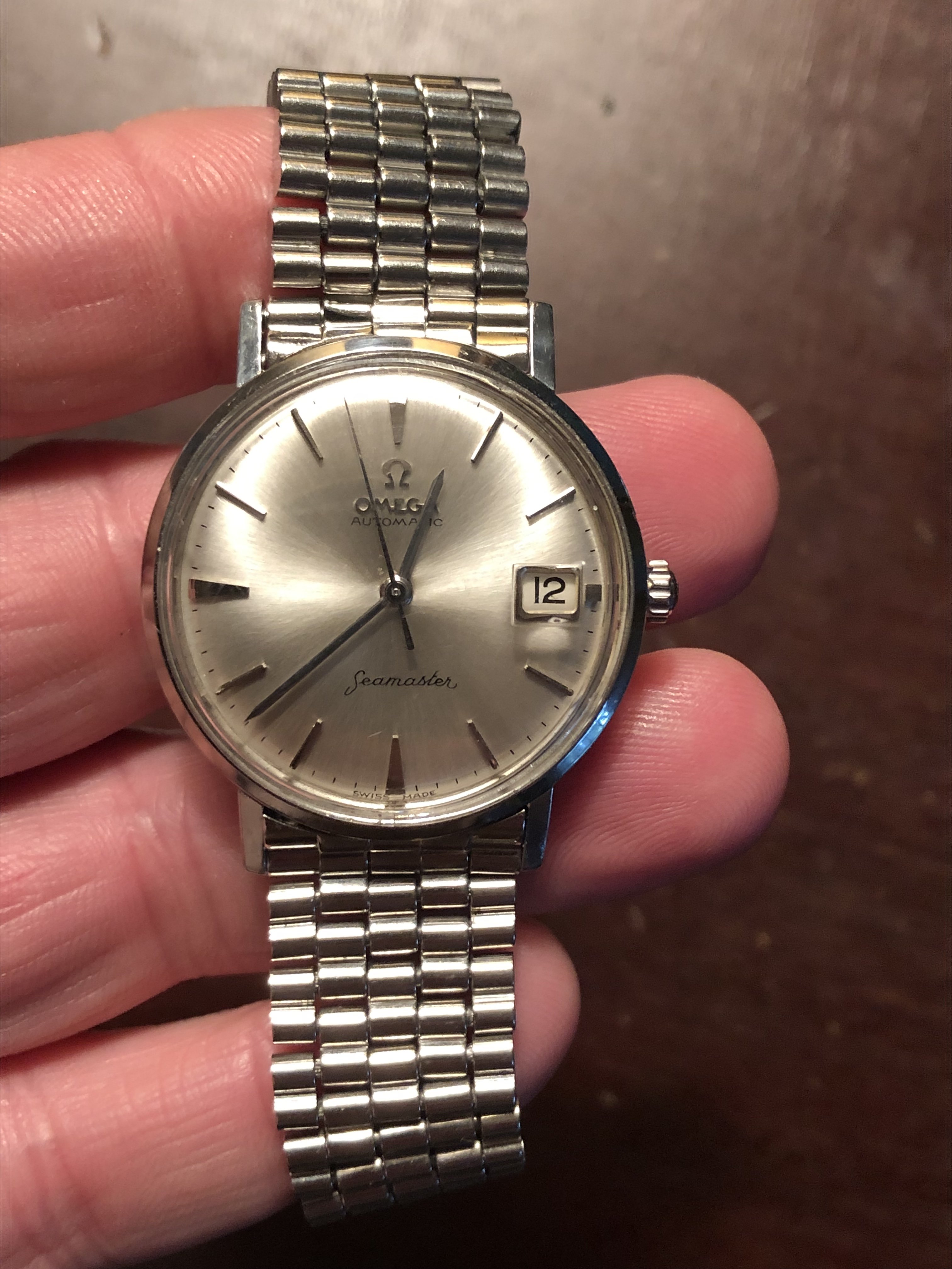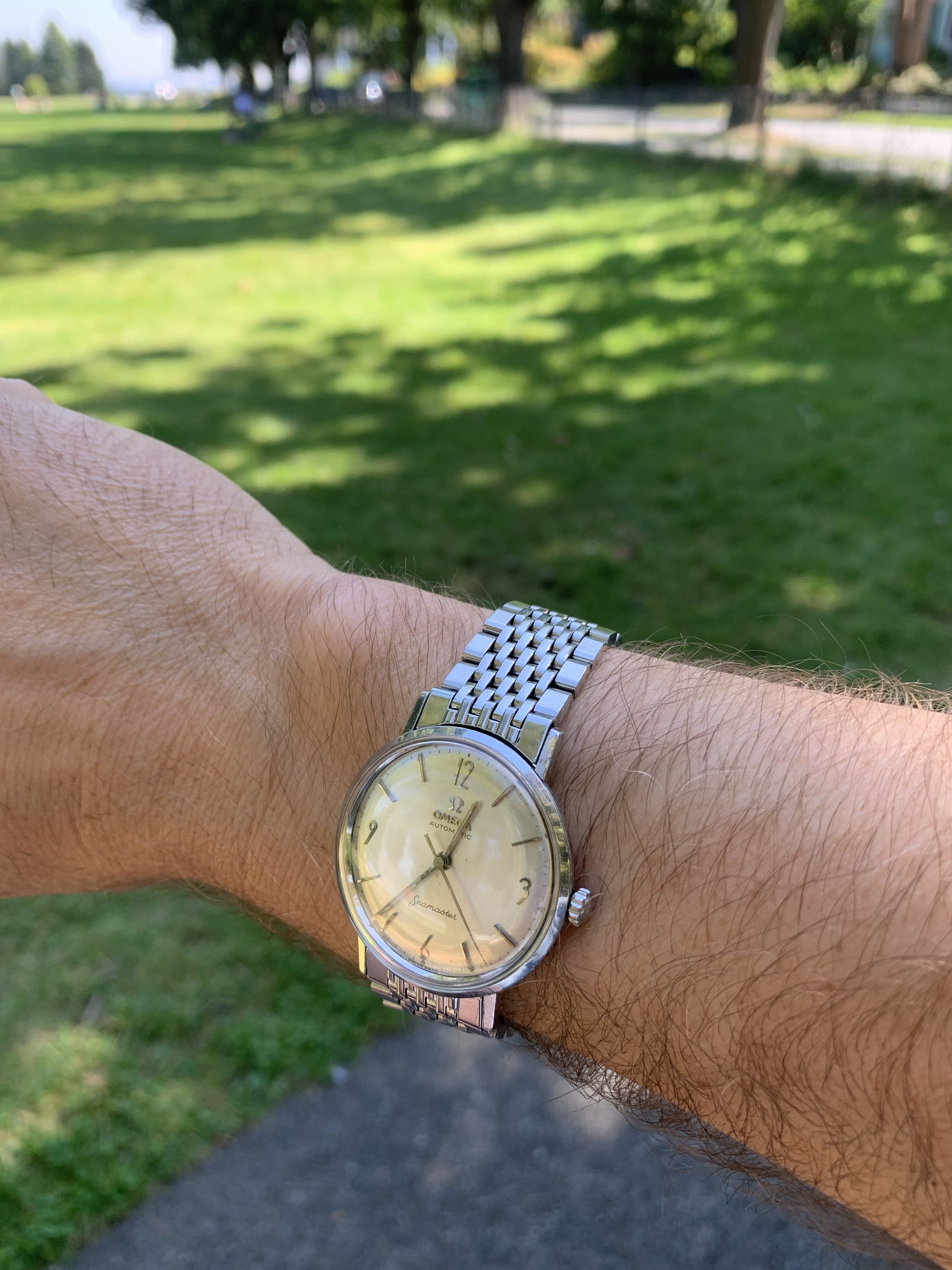 So, after what must have been 10,000km+ in travel (8000 of which were seemingly unnecessary) and six weeks in postal service black sites, here is my ‘61 Seamaster 14765-2SC (18mm) happily paired with an unnumbered (but equivalent to a 1037) Omega 7 row BOR with 570 end links.