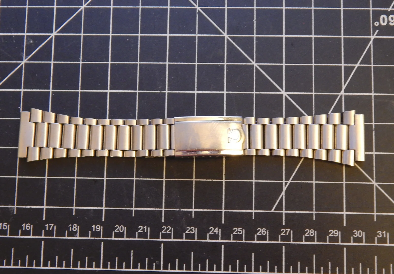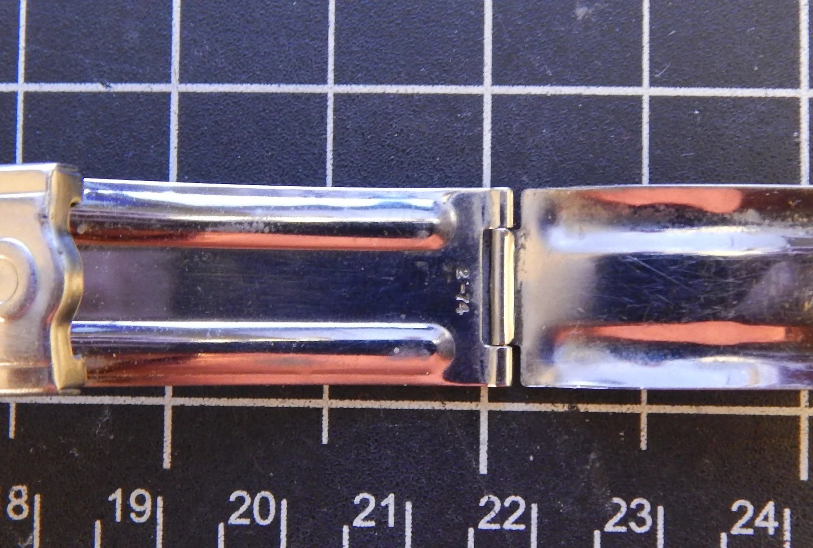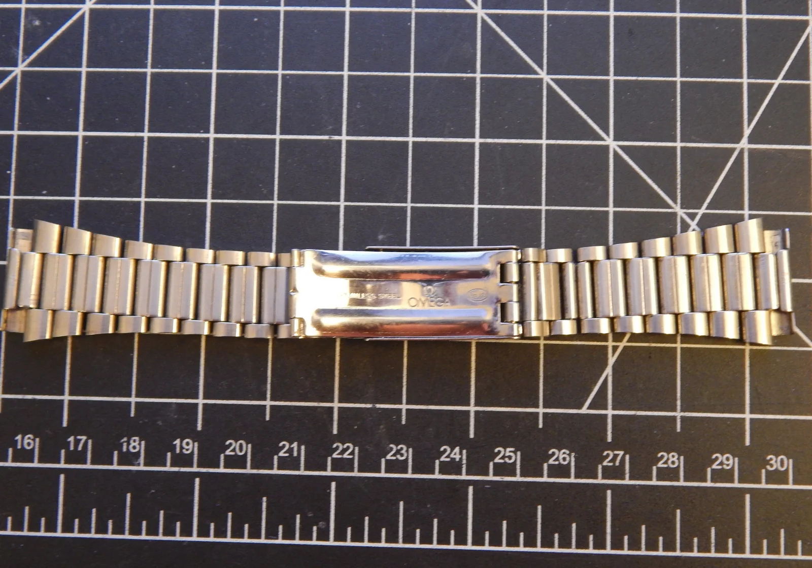 Today I pulled out the bracelet that came with the watch to take a second look at it. I had assumed that it was also an 1162, but it isn't. In fact, I have no idea what it is, or even if it's an Omega bracelet at all. The underneath of the clasp is marked "stainless steel," "OMEGA" (with a classic Omega symbol), and "No.12" in an oval. The only other marking on the clasp is "2-74" near the hinge. The end links measure 19.7mm and are unmarked. The last links before the end links measure 23.5mm, which I think is a little wider than an 1162 would be.