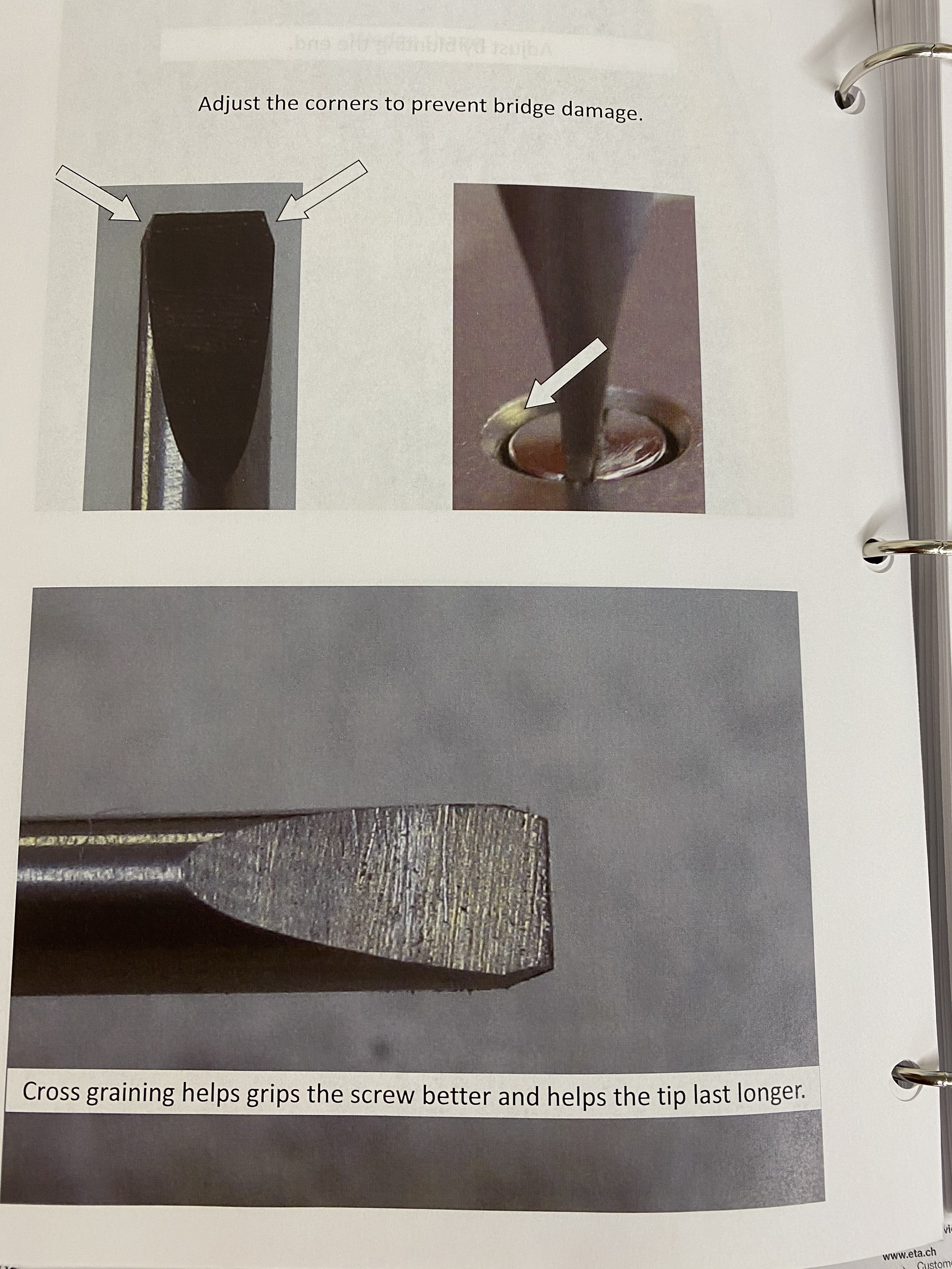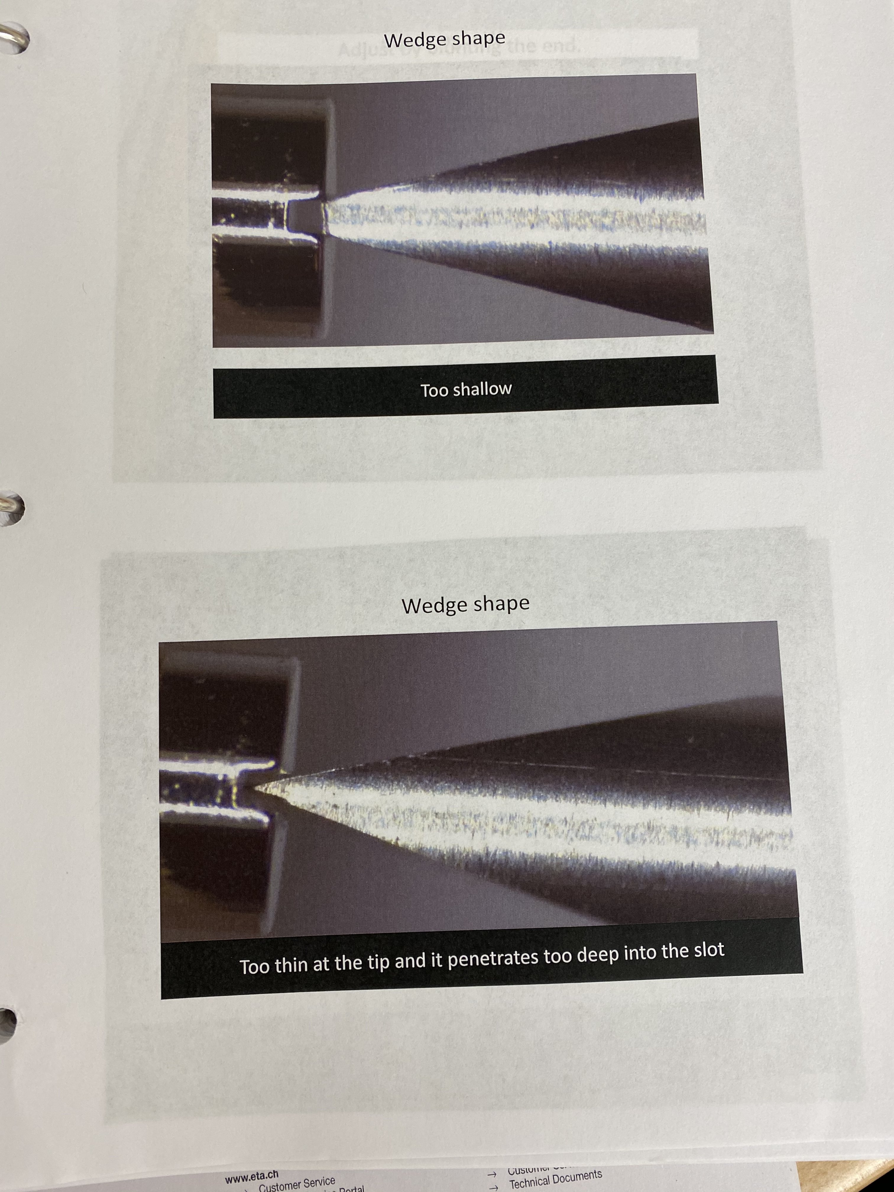 And ideally, since the walls of a screw are parallel, should a properly dressed screwdriver be cut to have parallel walls too, as it would seem that a wedge shape would tend to exert more force on the top edge of the screw slot, leading to a greater chance of deformation there.