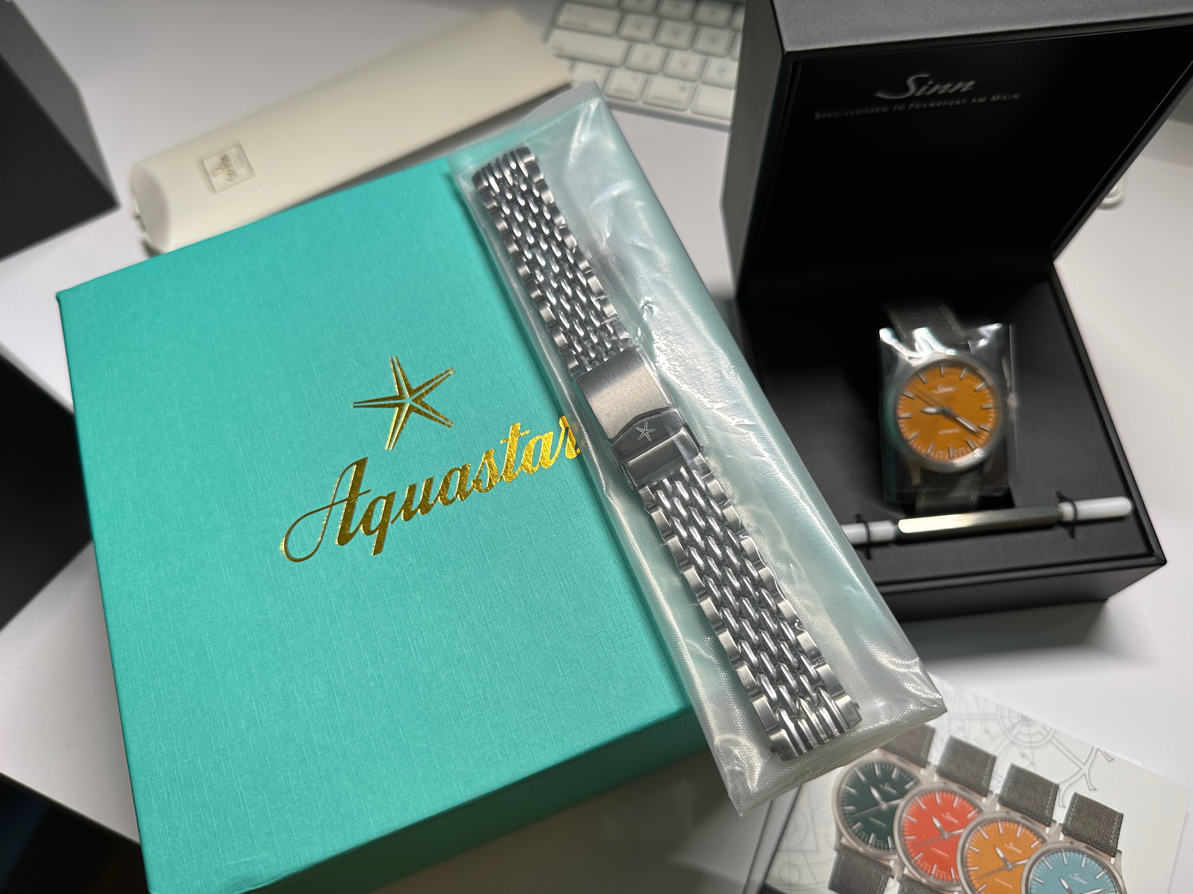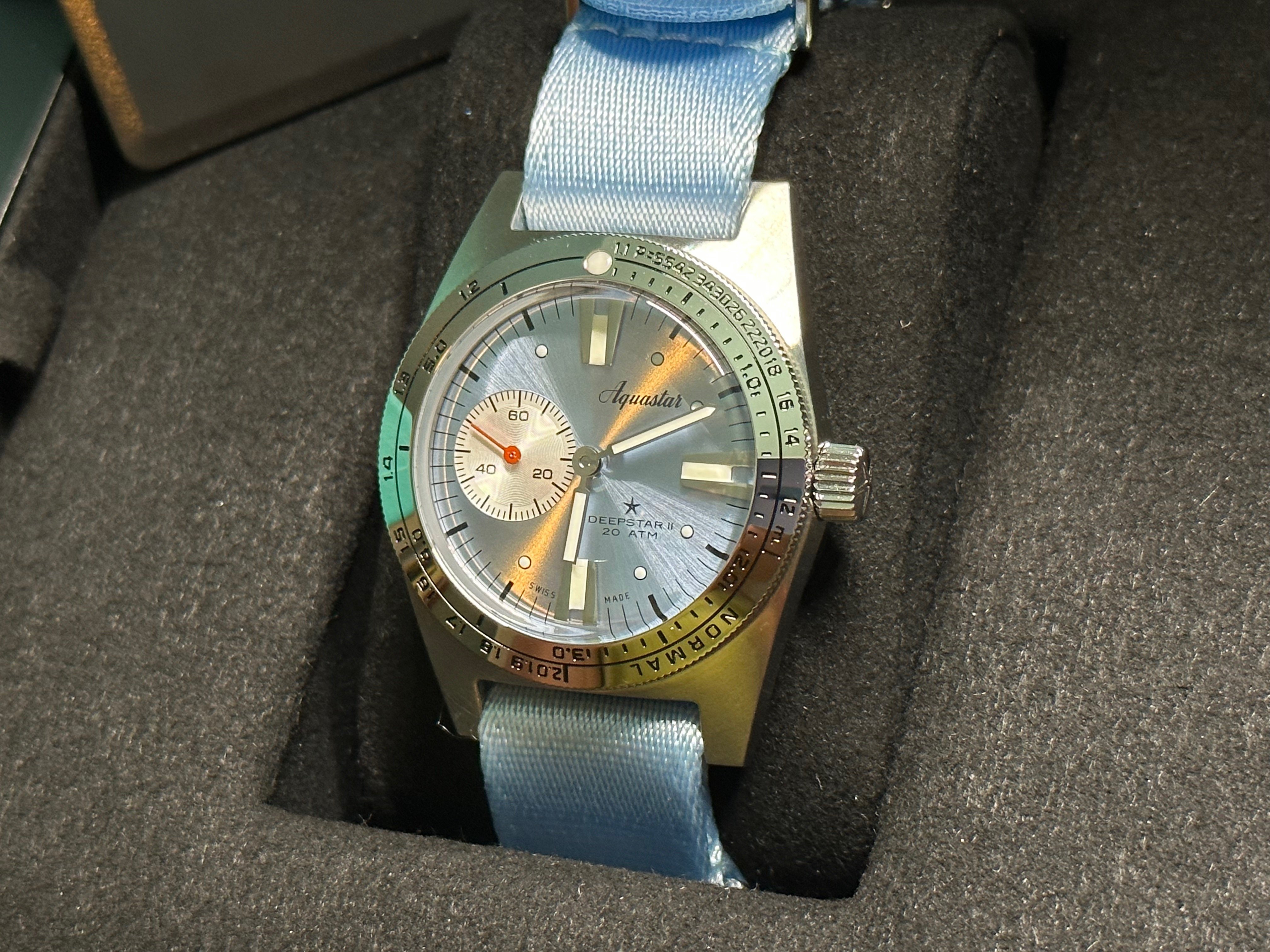 - Stainless steel 19mm “beads-of-rice” bracelet and ice blue NATO strap