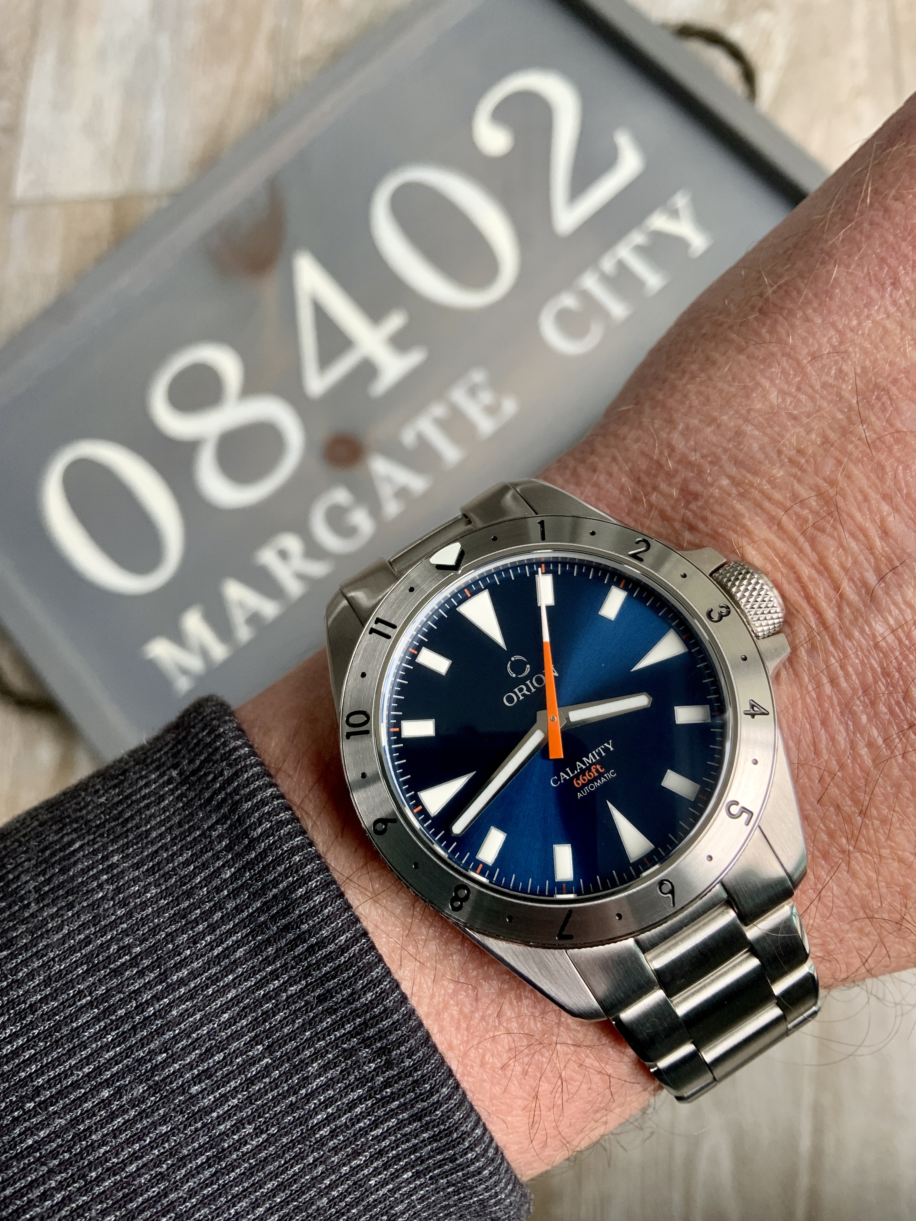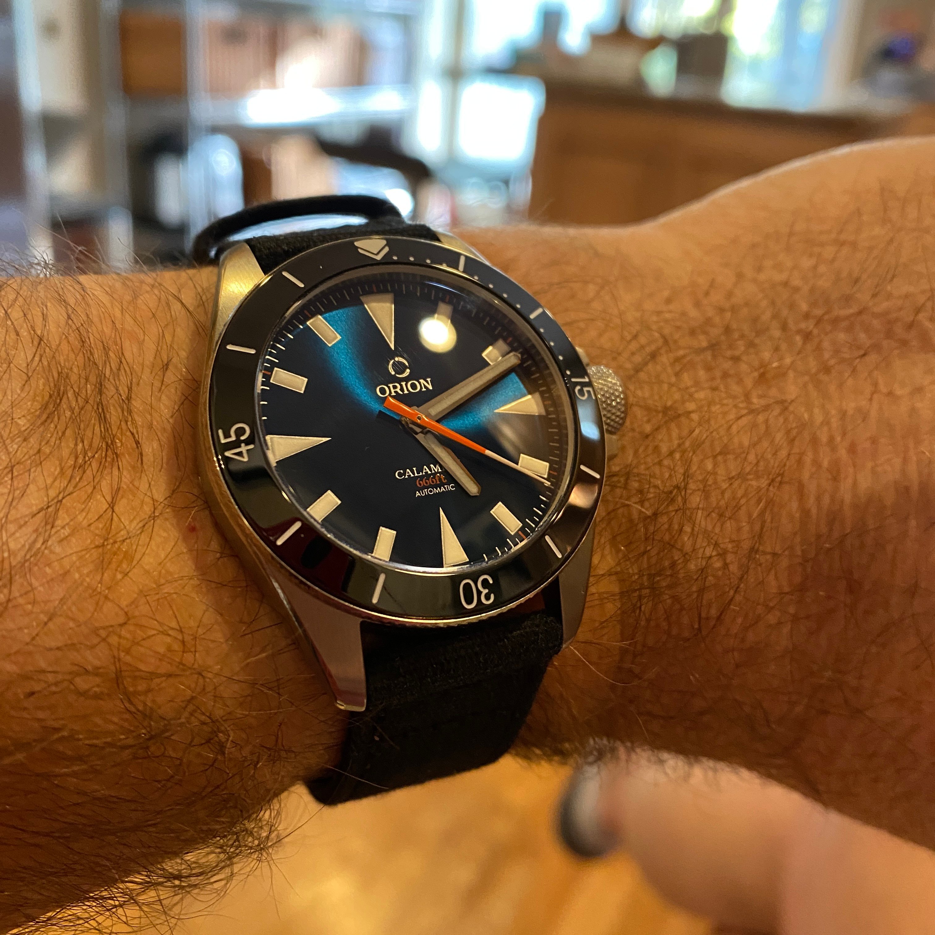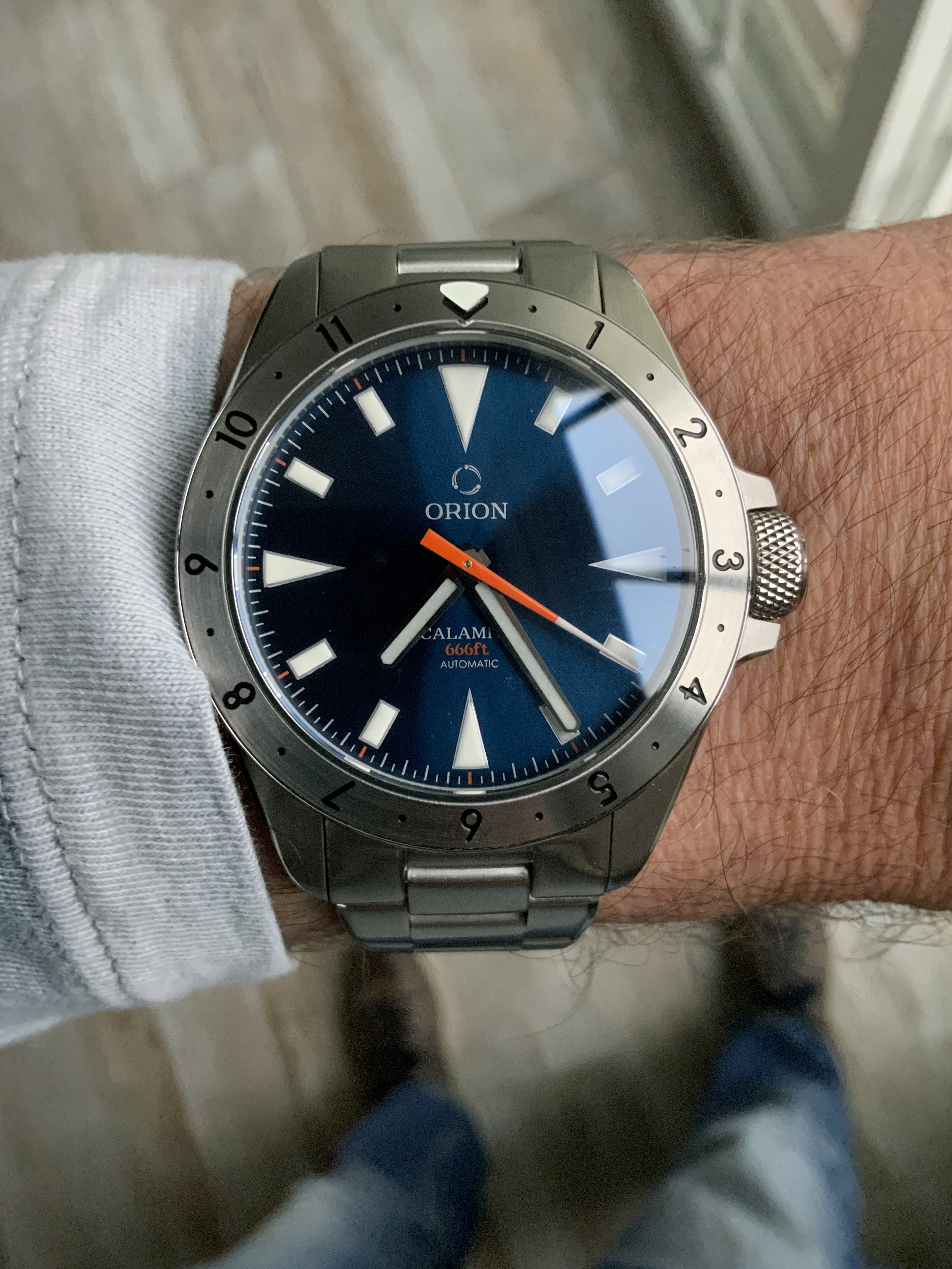 ·If you’re a fan of independent watchmaking, sparkling Azure-blue dials (or “Void” black or white!), or simply affordable modern watches that pay incredible attention to all the right details, then check out Orion Watches. Based in Philadelphia area, Orion is the brainchild of Nick Harris, a terrific young watchmaker who is passionate about making great watches and not taking shortcuts to get there. His new Calamity divers are a sight to behold. Perfectly sized at 39.5mm wide and barely 10mm thick, it has a gently curved case-back for maximum comfort on the wrist. It also sports a double-domed sapphire crystal, an exhibition display back showing off the Swiss SW300 movement, a big crown for wonderfully easy setting/winding, a 12 hour steel (or 24 hour black ceramic) bezel, crystal blue Superluminova, and a terrific bracelet that rivals the ones offered by brands 10 times as expensive. Oh, and with 666ft of water resistance, it’s about the only piece in my mainly vintage collection that I can easily wear to the beach, the pool or even the shower! Check these beauties out. I’m not affiliated with Orion in any way...but I’ve quickly become a raving fan! 👍 😎 Oh, and sold my Baltic Aquascaphe to get this one onto my wrist! (Sorry, @Larry S ...)